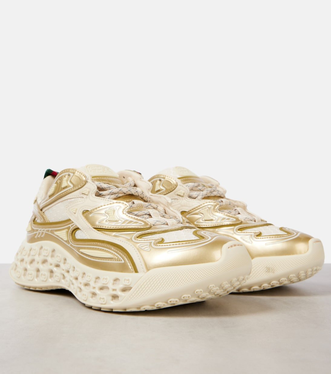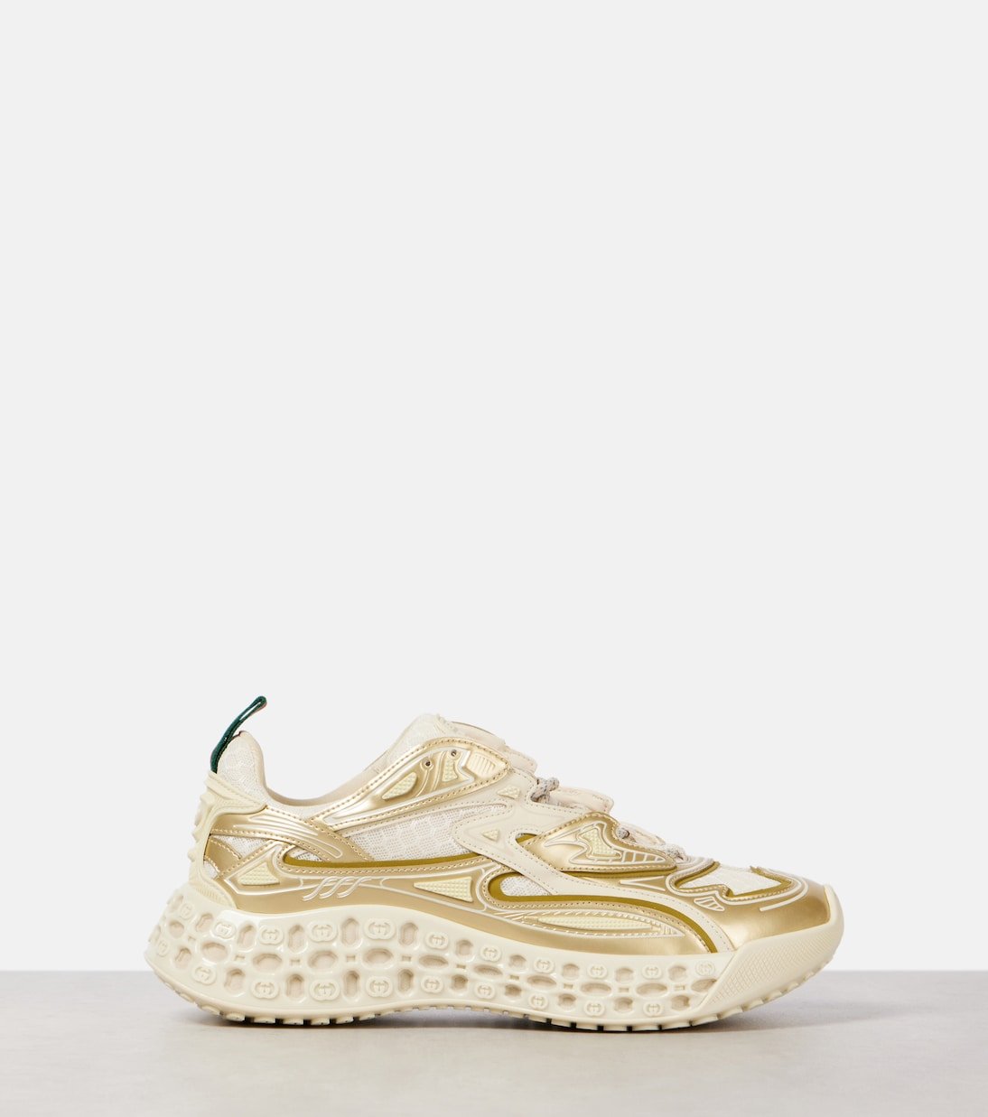 Les baskets Cub3d de Gucci mêlent héritage et modernité, avec des empiècements en résille, des semelles intermédiaires à plateforme sculpturale et des motifs GG entremêlés en 3D audacieux. Des détails superposés et des finitions texturées complètent leur design avant-gardiste.