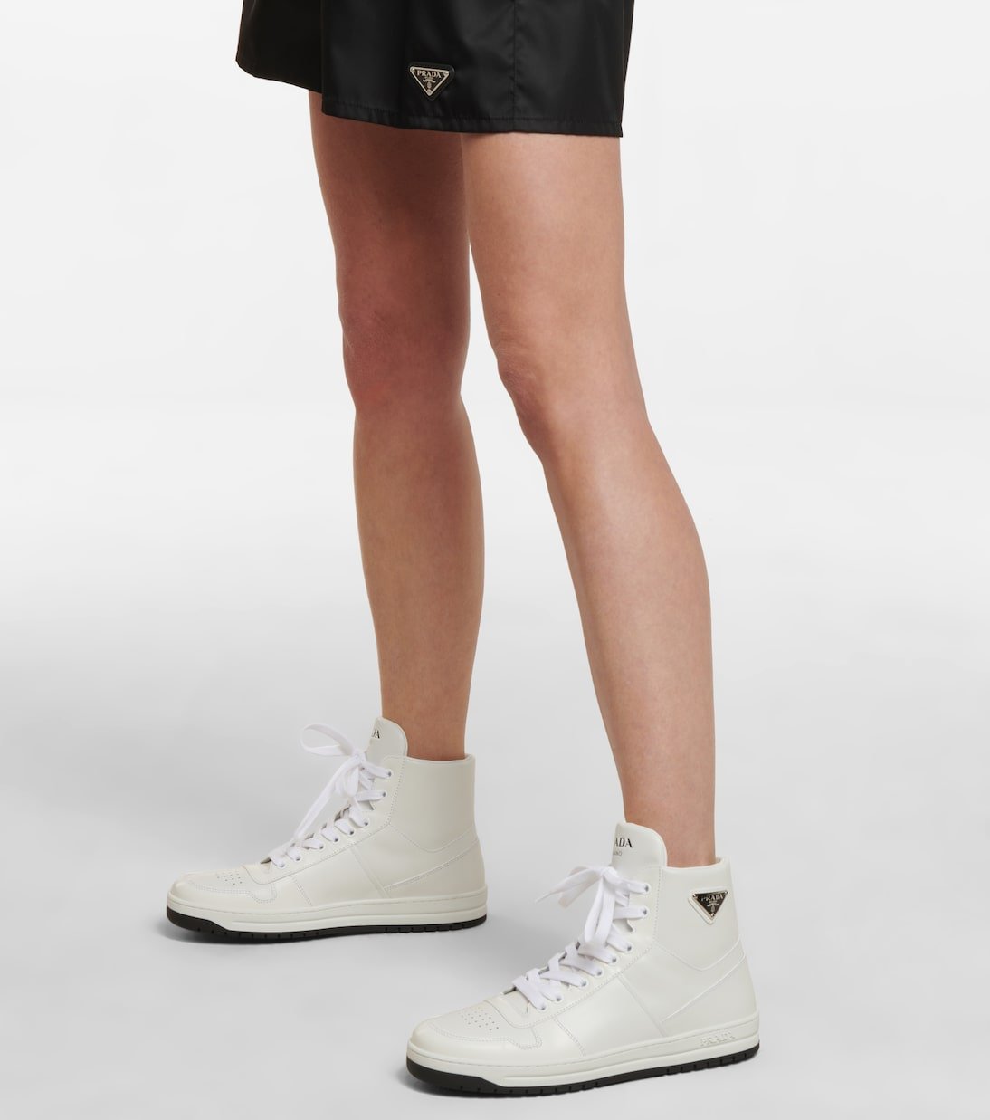 Ces baskets montantes signées Prada présentent une allure sportive rétro. Inspirées des paires de basket-ball vintage, elles sont réalisées en cuir et ornées du logo de la maison sur les languettes et les côtés.