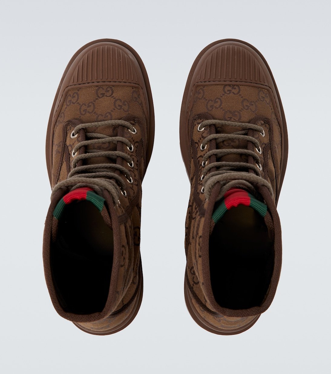 Confectionnées en toile, ces bottines arborent l’imprimé GG emblématique de Gucci sur l’ensemble. Les bottines New Sherlin présentent des bouts arrondis, des lacets et les rayures Webstripes vertes et rouges emblématiques du label.