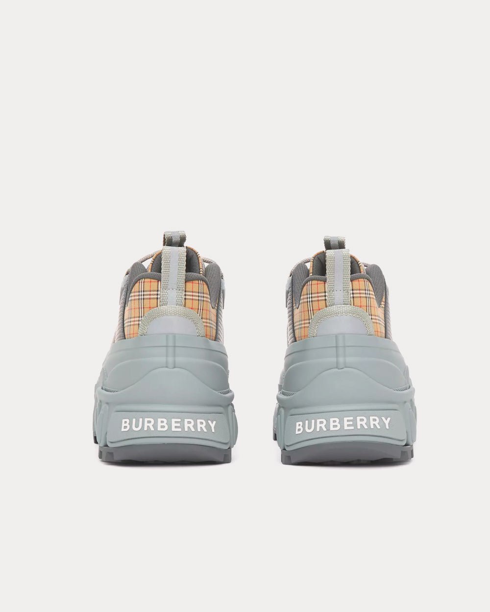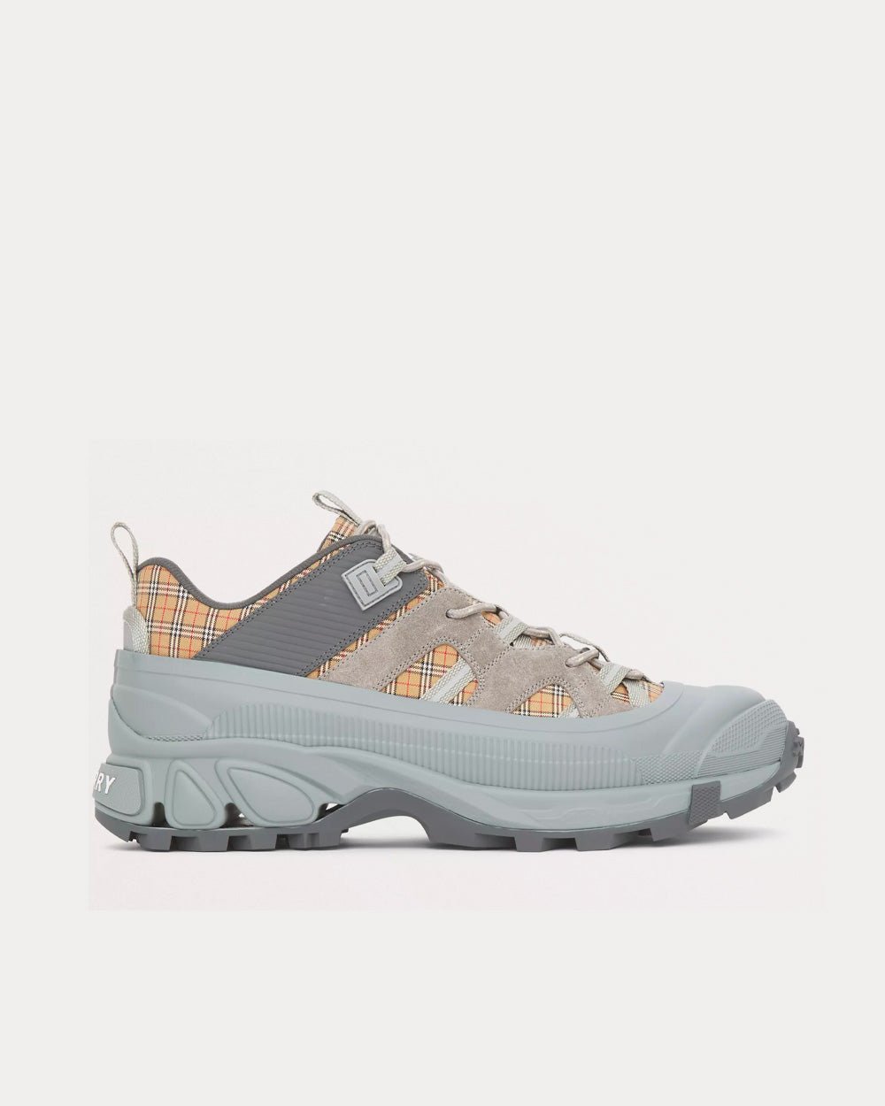 Baskets Burberry de défilé, confectionnées en coton technique à micro-carreaux avec finitions en daim. Elles sont ornées d’un sur-chaussure mat inspiré des bottes de pluie et d’une semelle à détails croisés faisant référence à notre emblématique motif à carreaux.