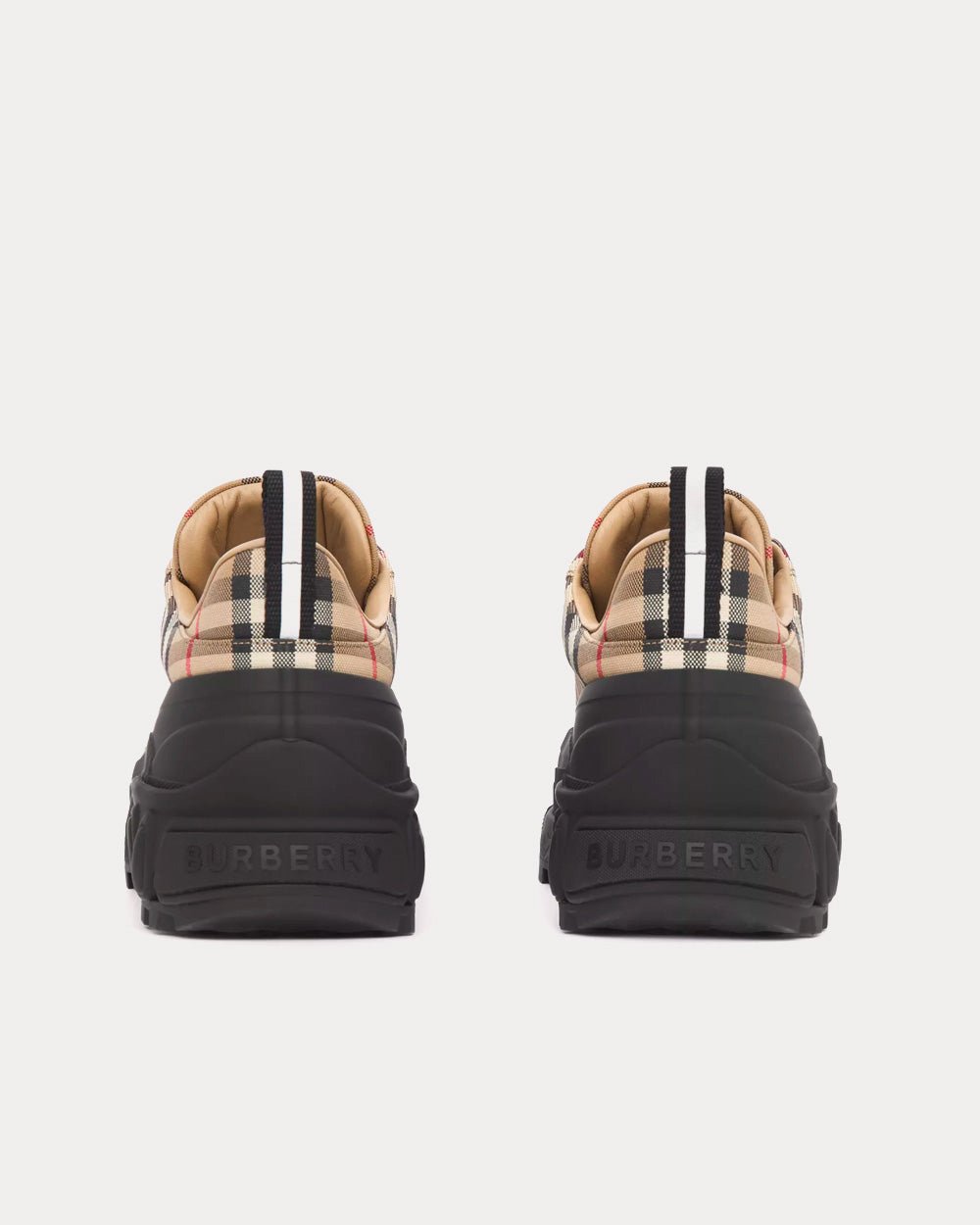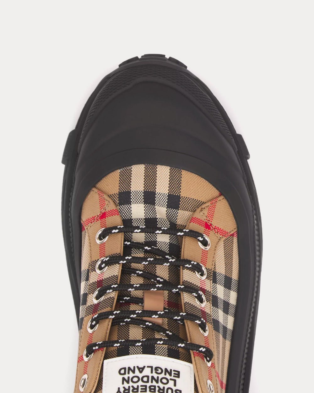 Baskets Burberry de défilé, confectionnées en coton à motif Vintage Check. Elles sont ornées d’un sur-chaussure mat inspiré des bottes de pluie et d’une semelle à détails croisés faisant référence à notre motif à carreaux emblématique.