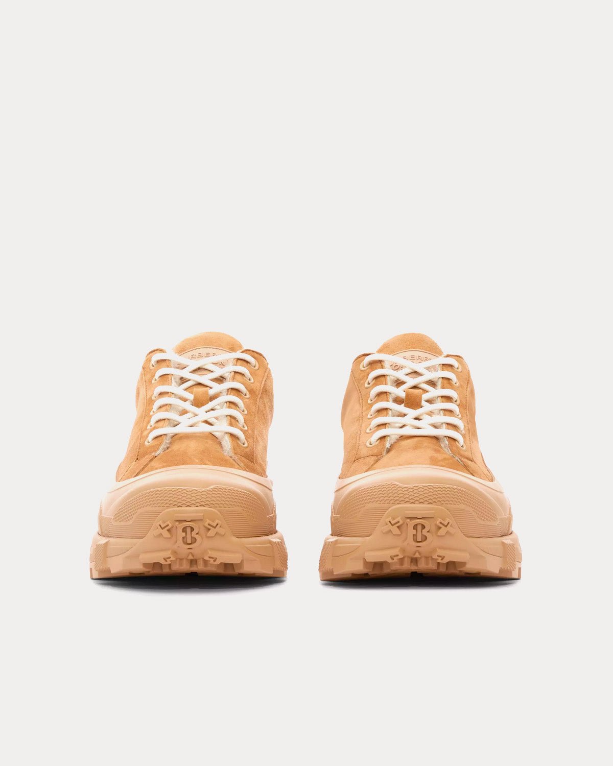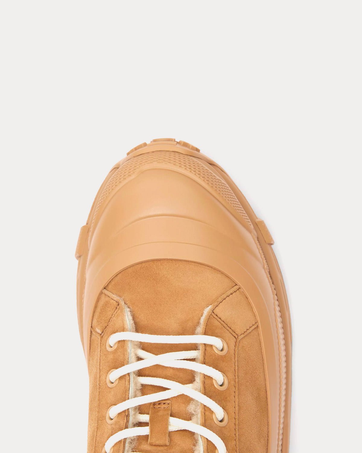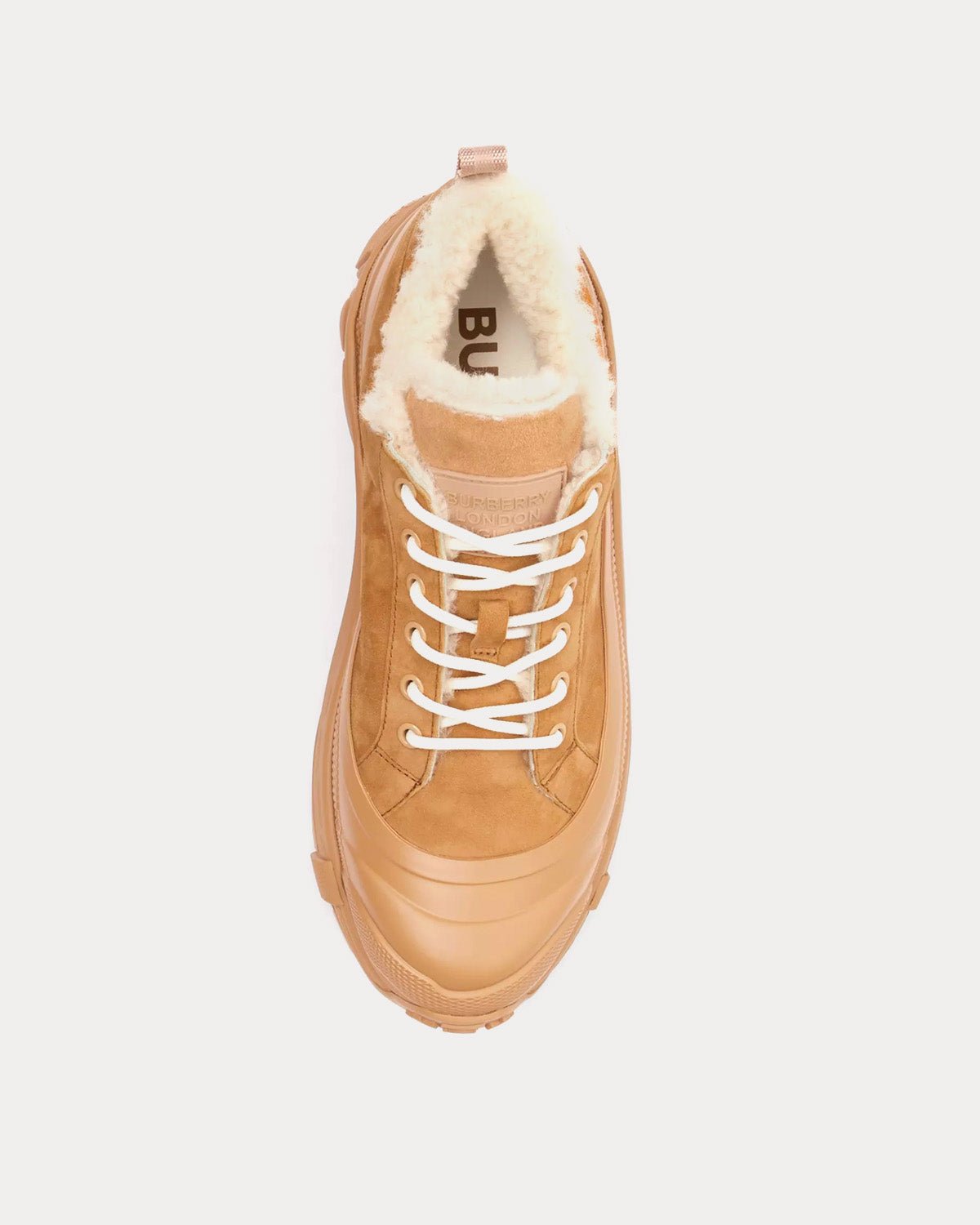 Baskets Burberry revisitées en daim et doublées de shearling texturé. Elles sont surmontées d’un surchaussure inspiré des bottes de pluie et d’une semelle à détails croisés, clin d’œil à notre emblématique motif Burberry Check.