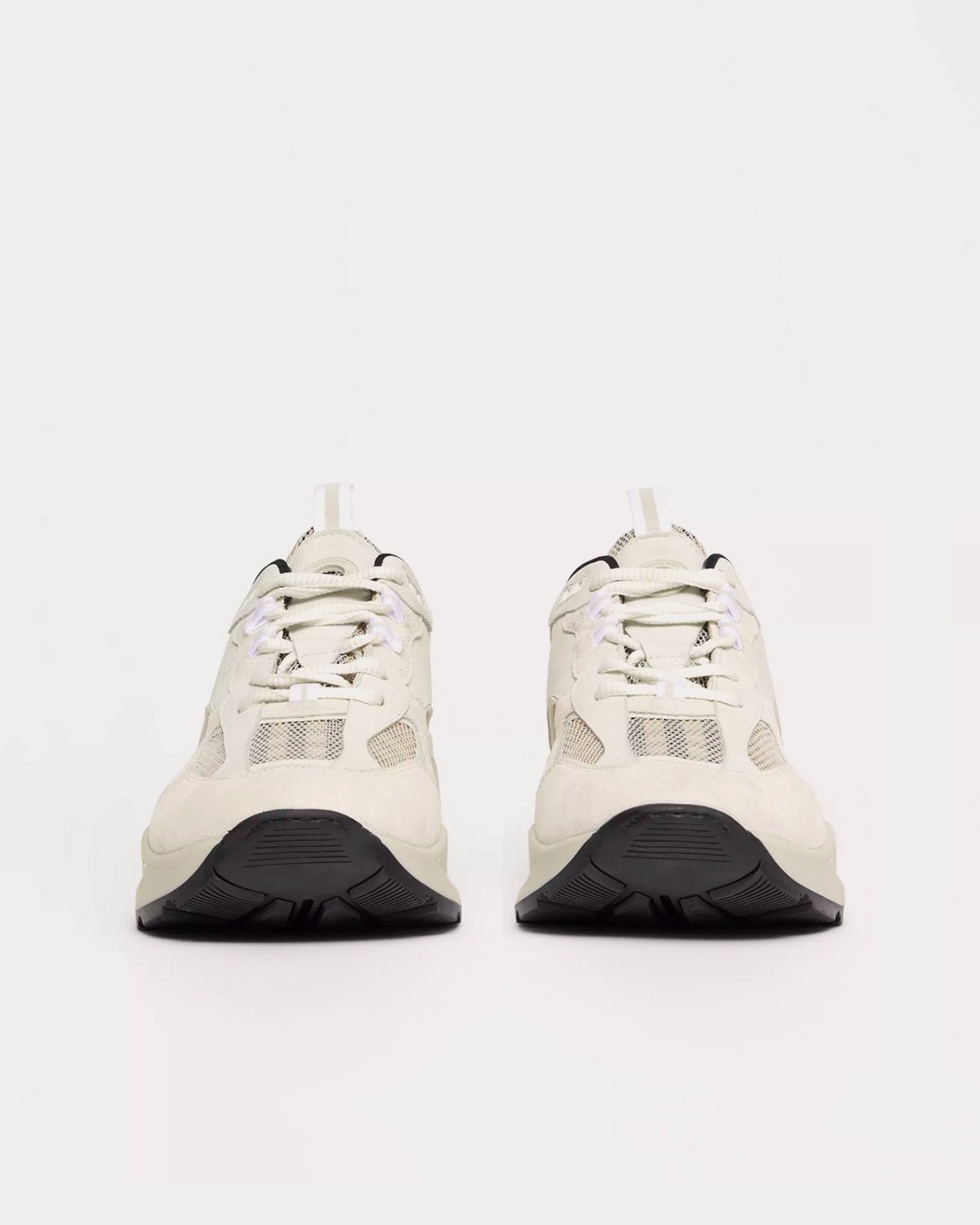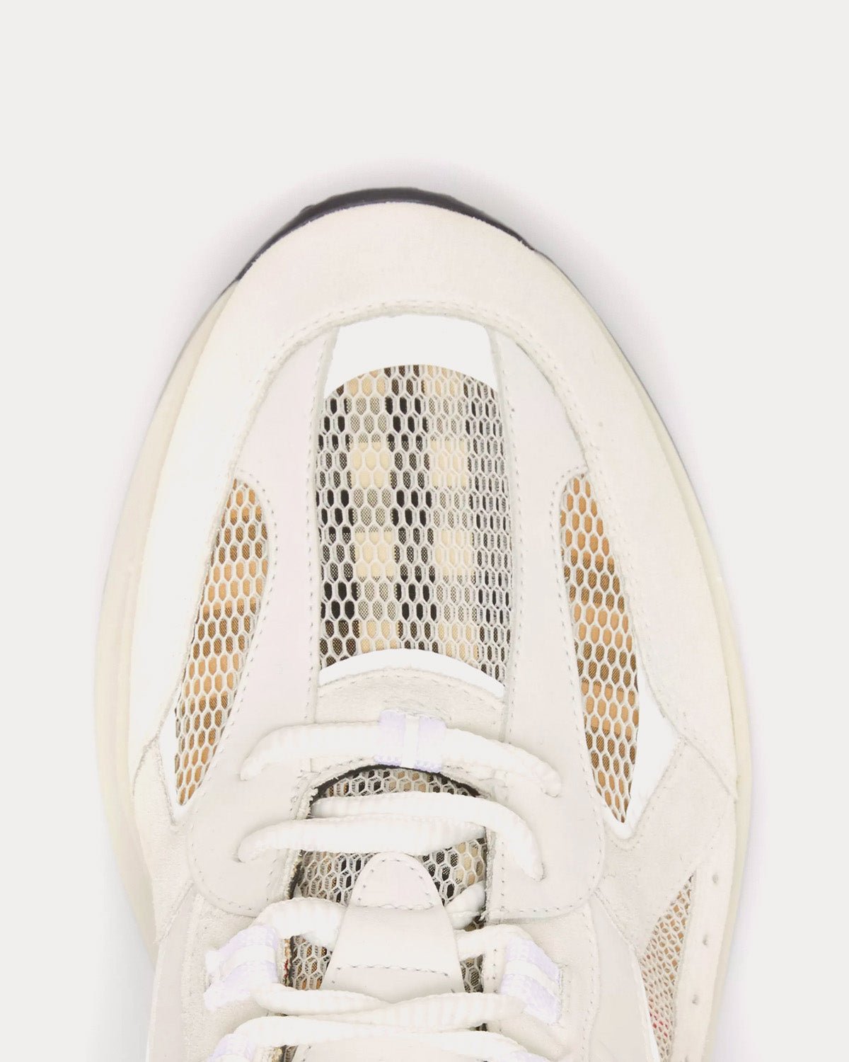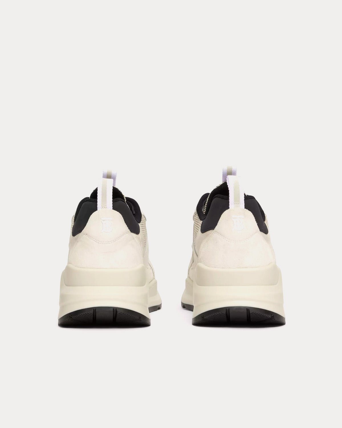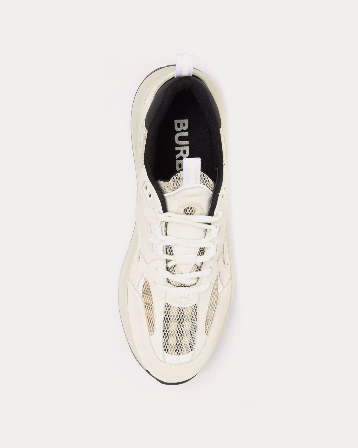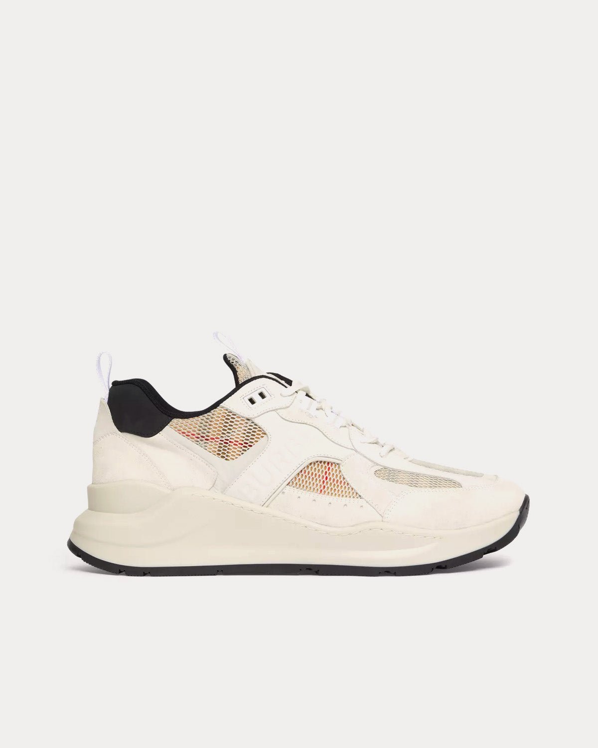 Baskets basses en cuir, daim et maille à carreaux à imprimé logo Burberry, beiges et blanches