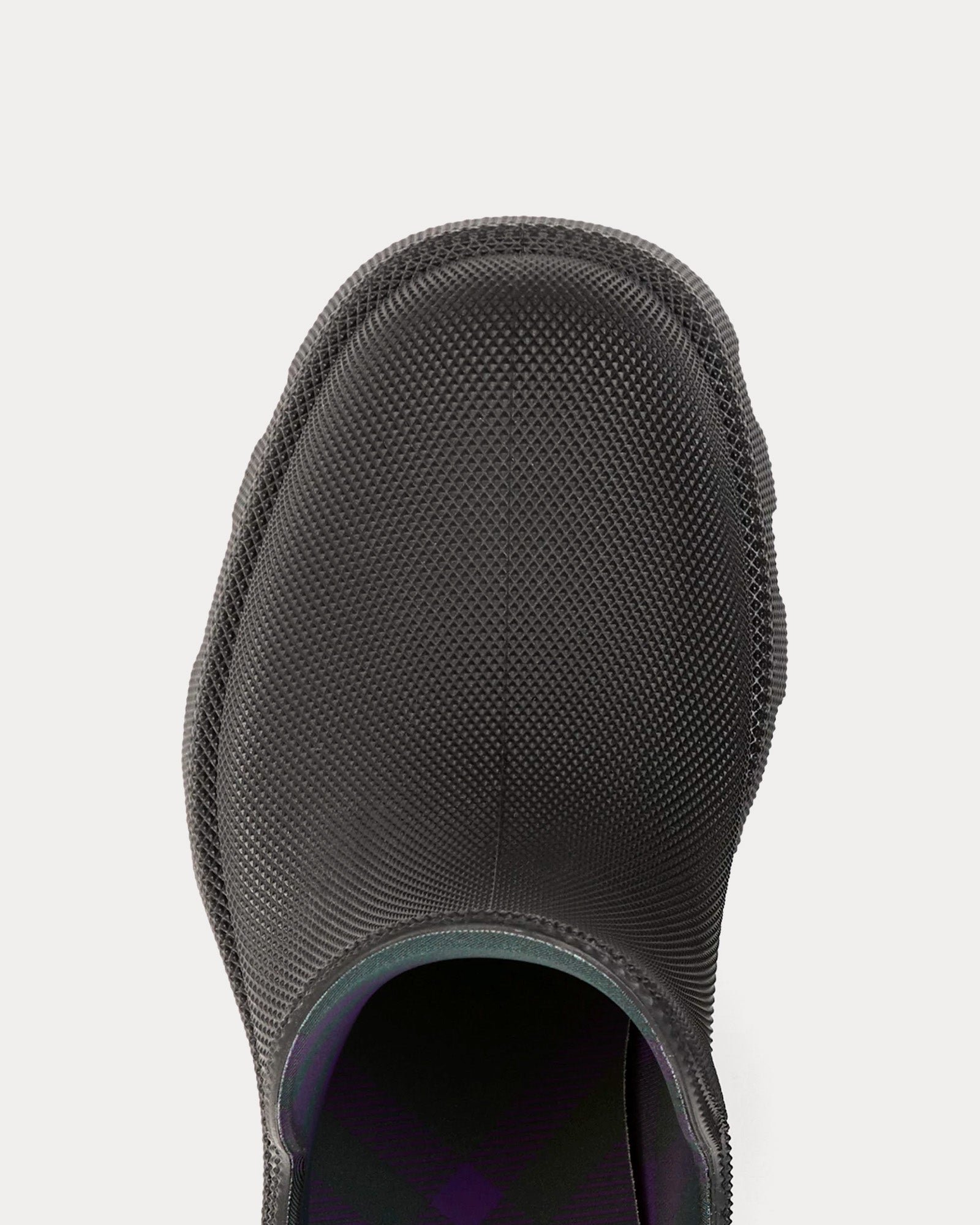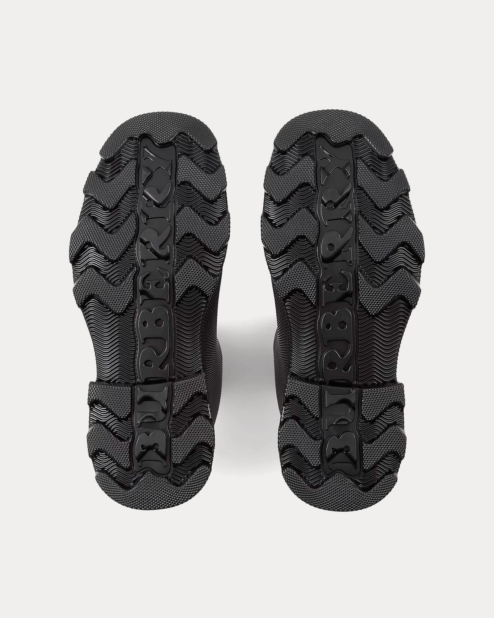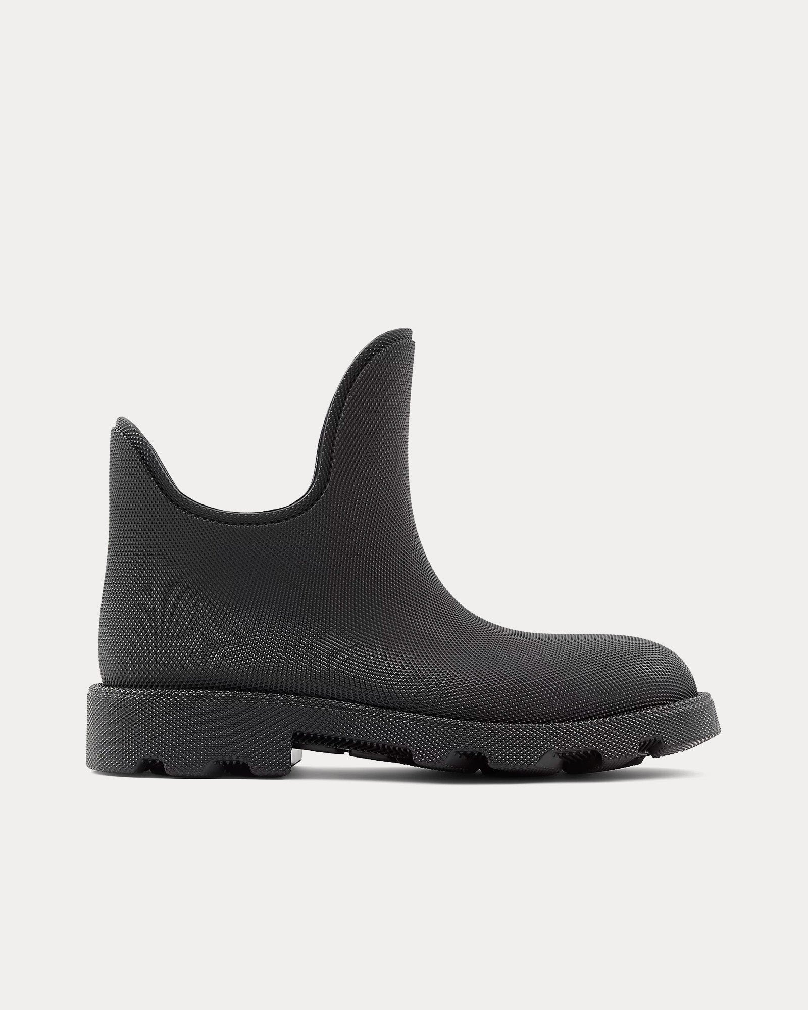 Les bottes basses BurberryRubber Marsh pour femmes en noir présentent une tige en caoutchouc, un bout arrondi, une doublure Burberry Check et un lettrage Burberry sur la semelle.
