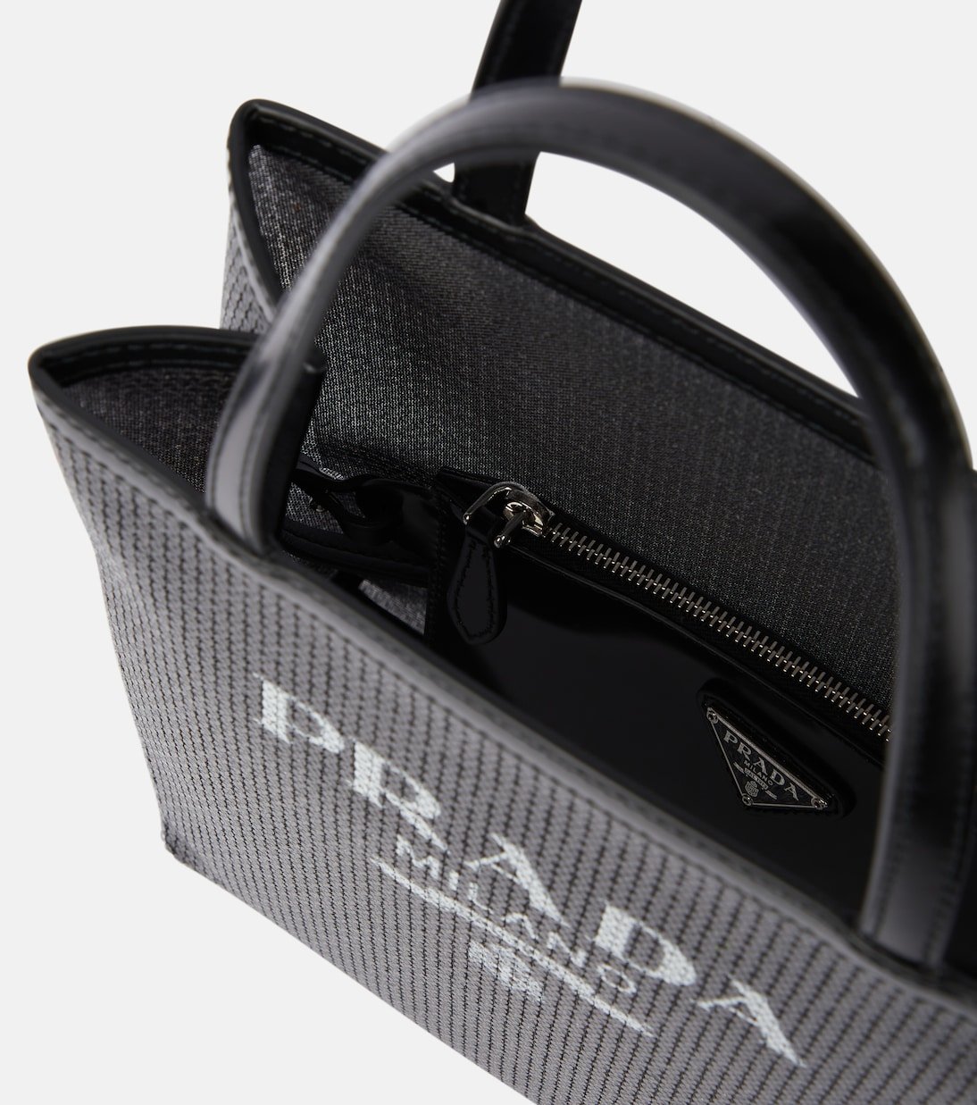 Prada relève un essentiel minimaliste de sa touche luxueuse avec le cabas en résille Small. Ce modèle semi-transparent recouvert de sequins noirs est imprimé du logo de la maison et possède une pochette intérieure zippée.