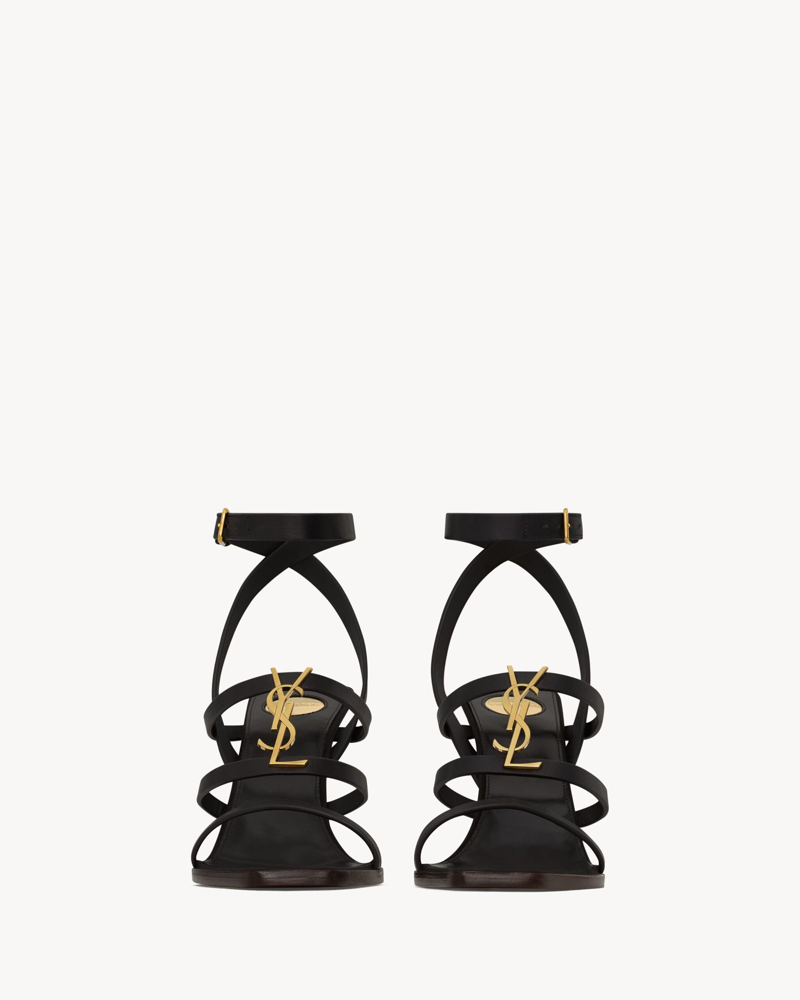 Sandales munies de brides multiples, d’un bout carré et d’un talon compensé recouvert, ornées du CASSANDRE et d’une bride cheville ajustable.