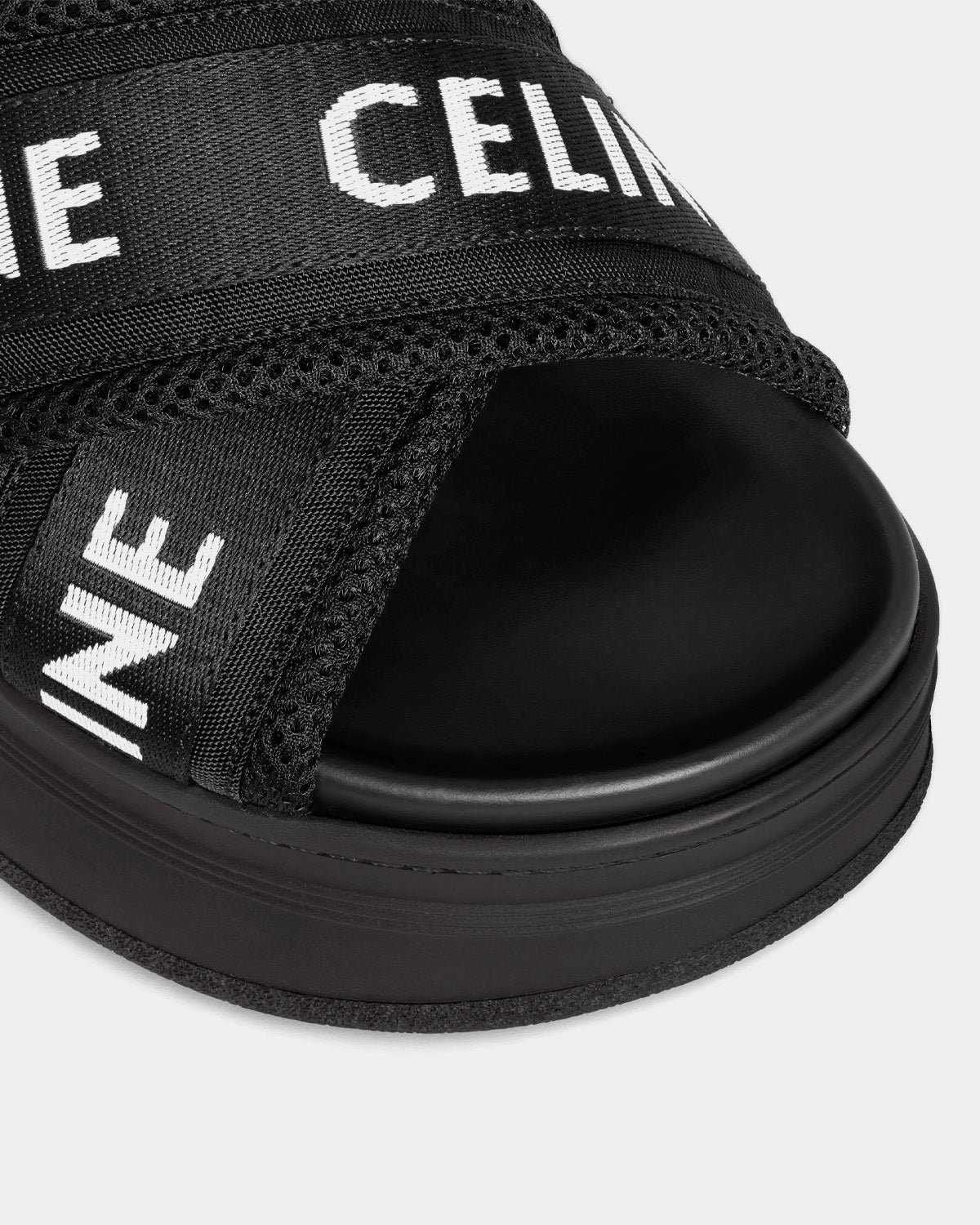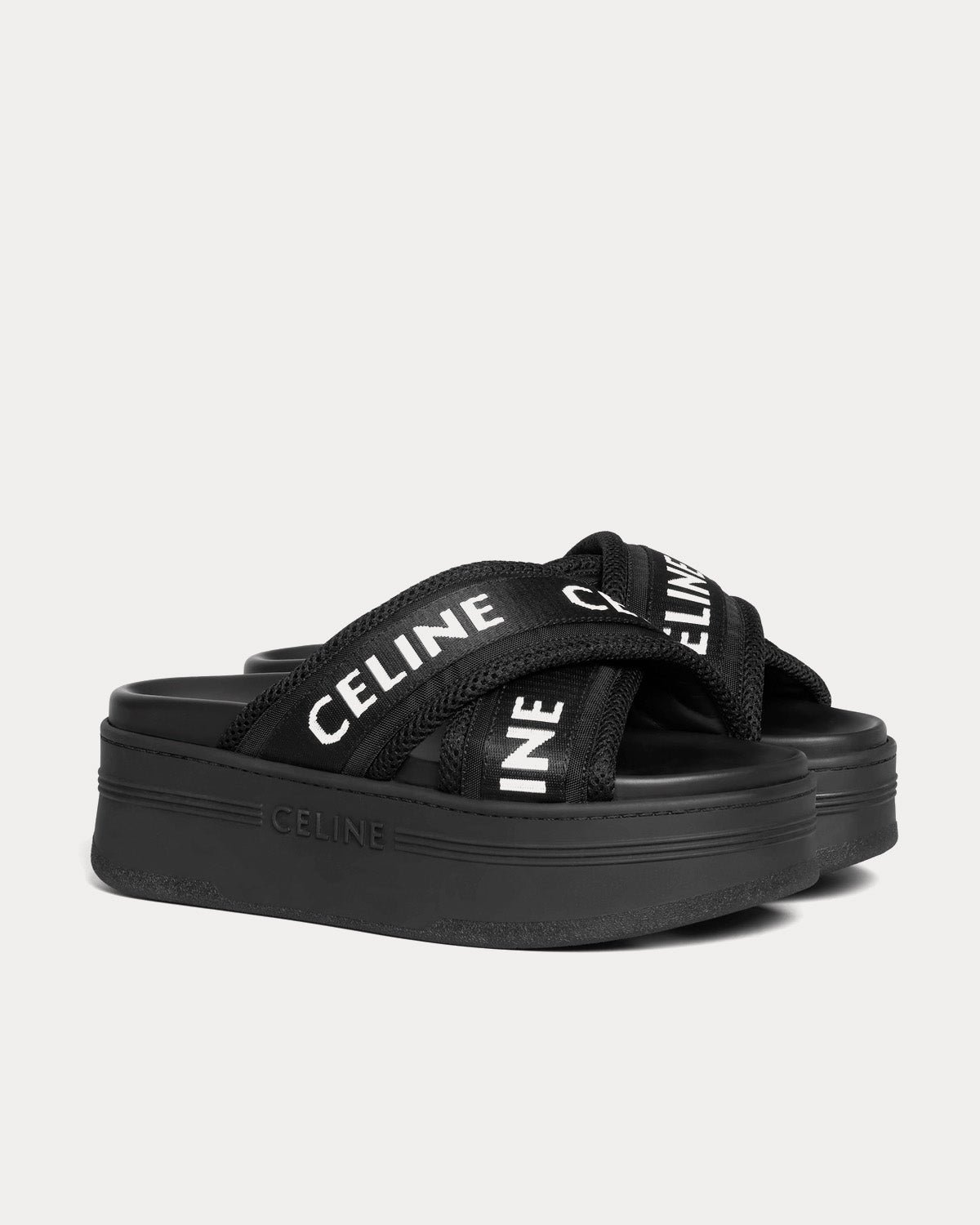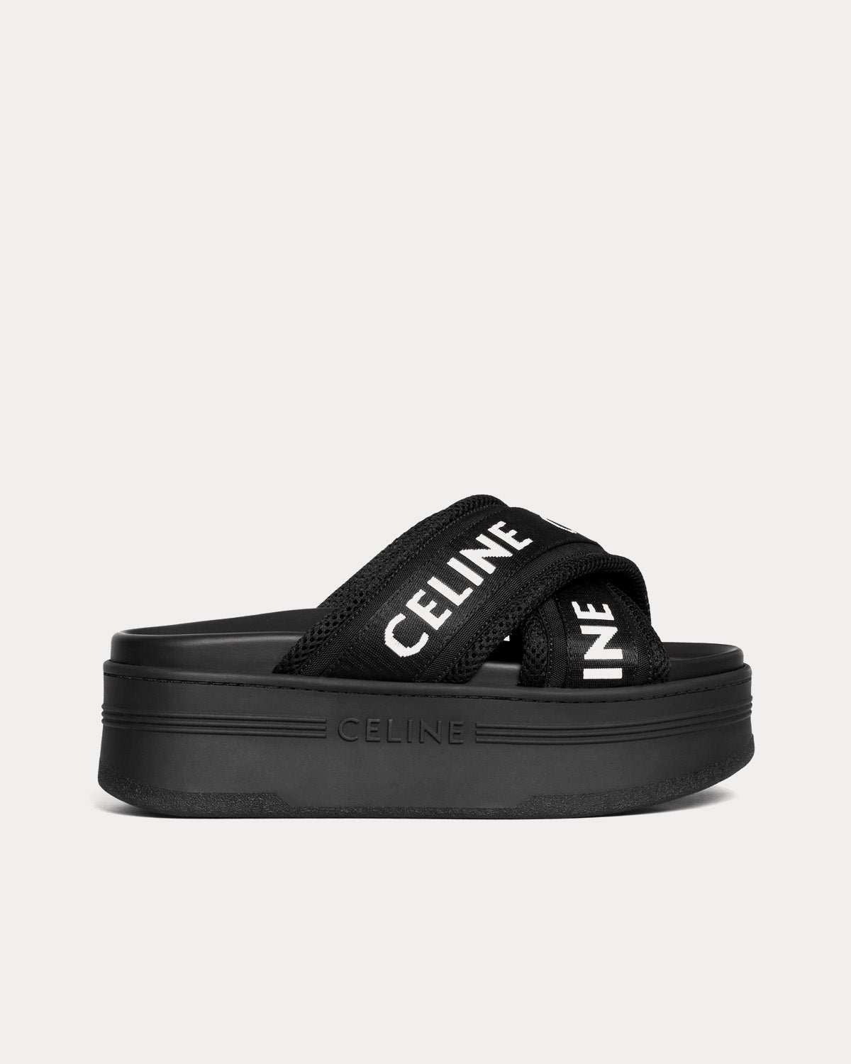 Les claquettes pour femmes CelineBlock en mesh et textile avec jacquard Celine dans un coloris noir et blanc optique présentent des brides croisées en mesh et jacquard, la signature Celine et des rayures en relief sur le côté de la semelle extérieure, la signature Celine en relief sous la semelle extérieure, une semelle intérieure en textile avec mousse interne et une semelle extérieure compensée en caoutchouc. Fabriquées en Italie.
