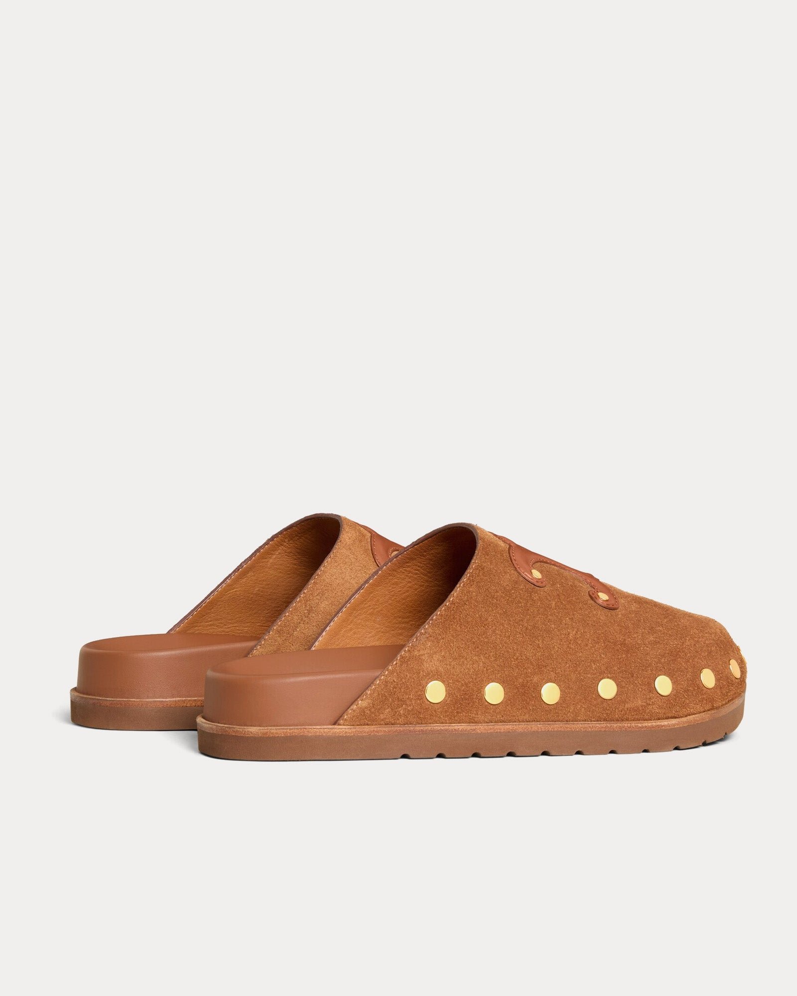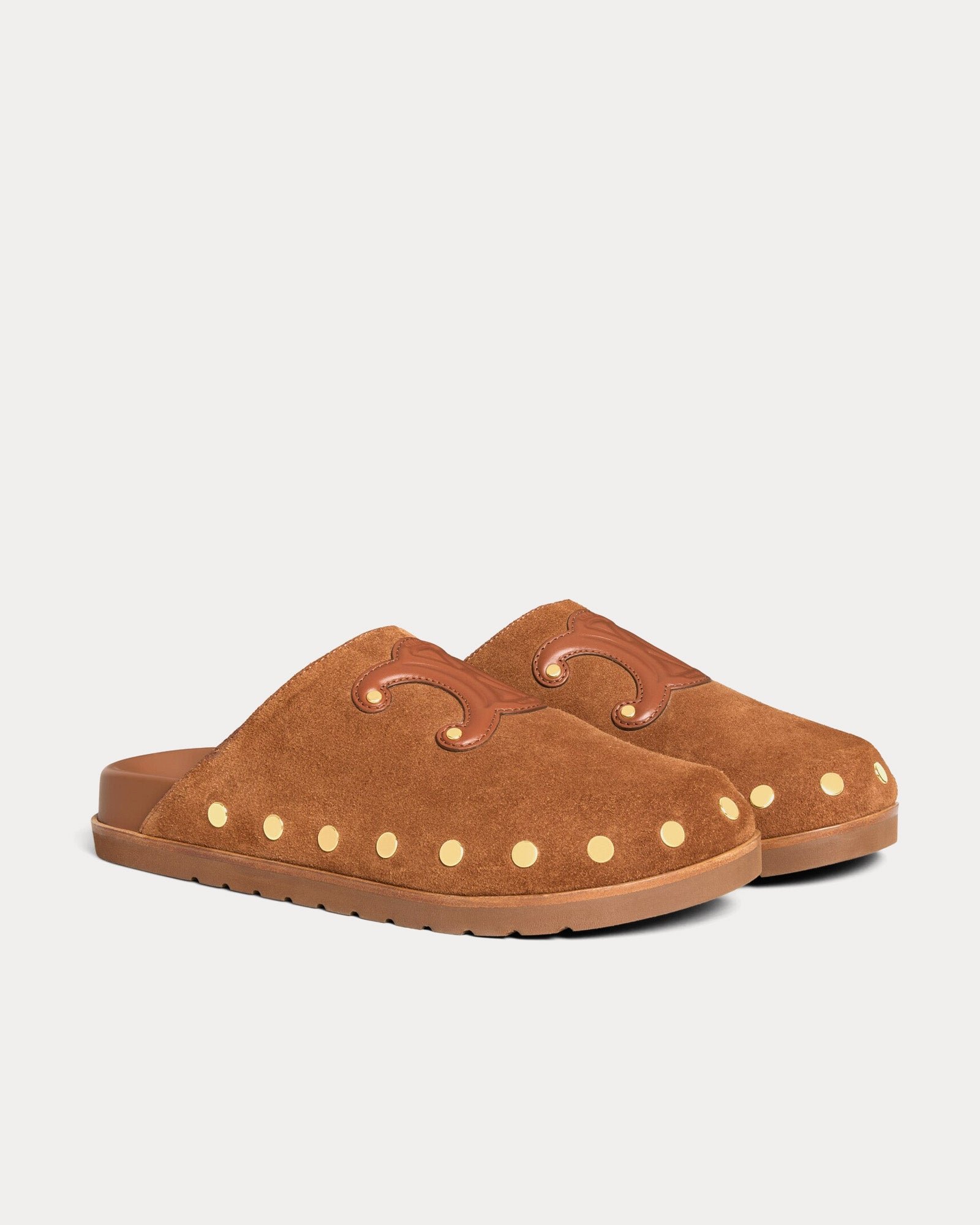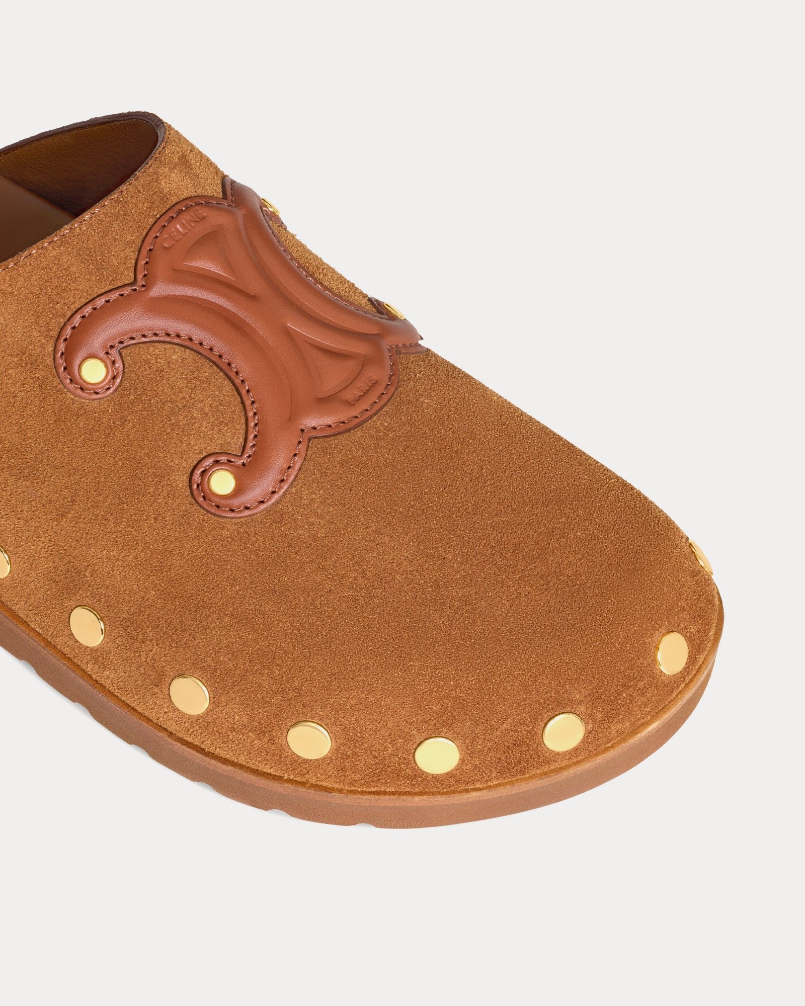 Les sabots Celine Pitea pour femme en riche daim cognac revisitent avec raffinement les mocassins classiques. Fabriqués en Italie en cuir de veau 100 %, ils présentent une texture douce et veloutée, rehaussée d’un large patch en cuir Triomphe sur la tige.