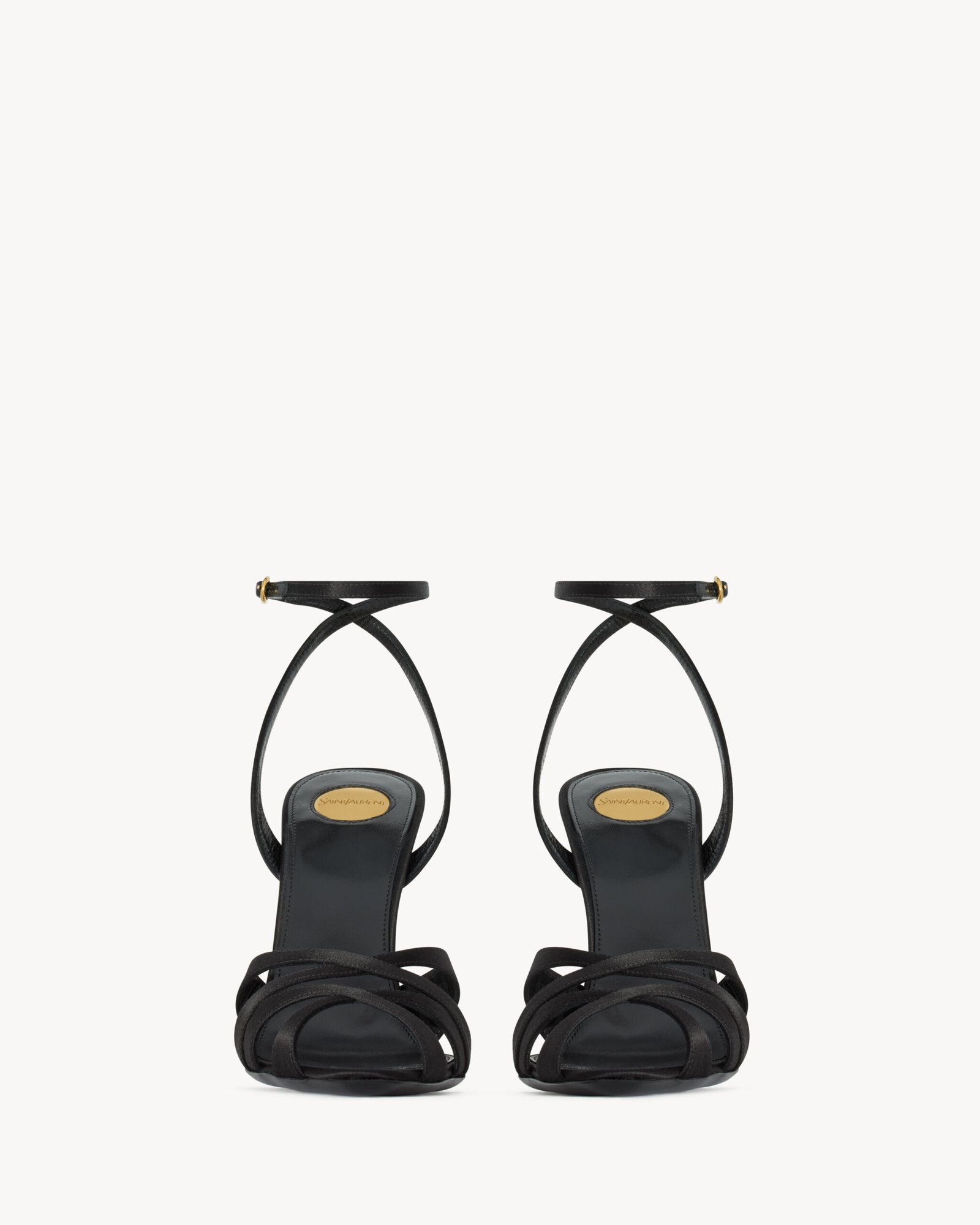 Sandales à talon aiguille munies d’un bout en amande, de brides croisées et d’un talon recouvert, dotées d’une bride cheville réglable.