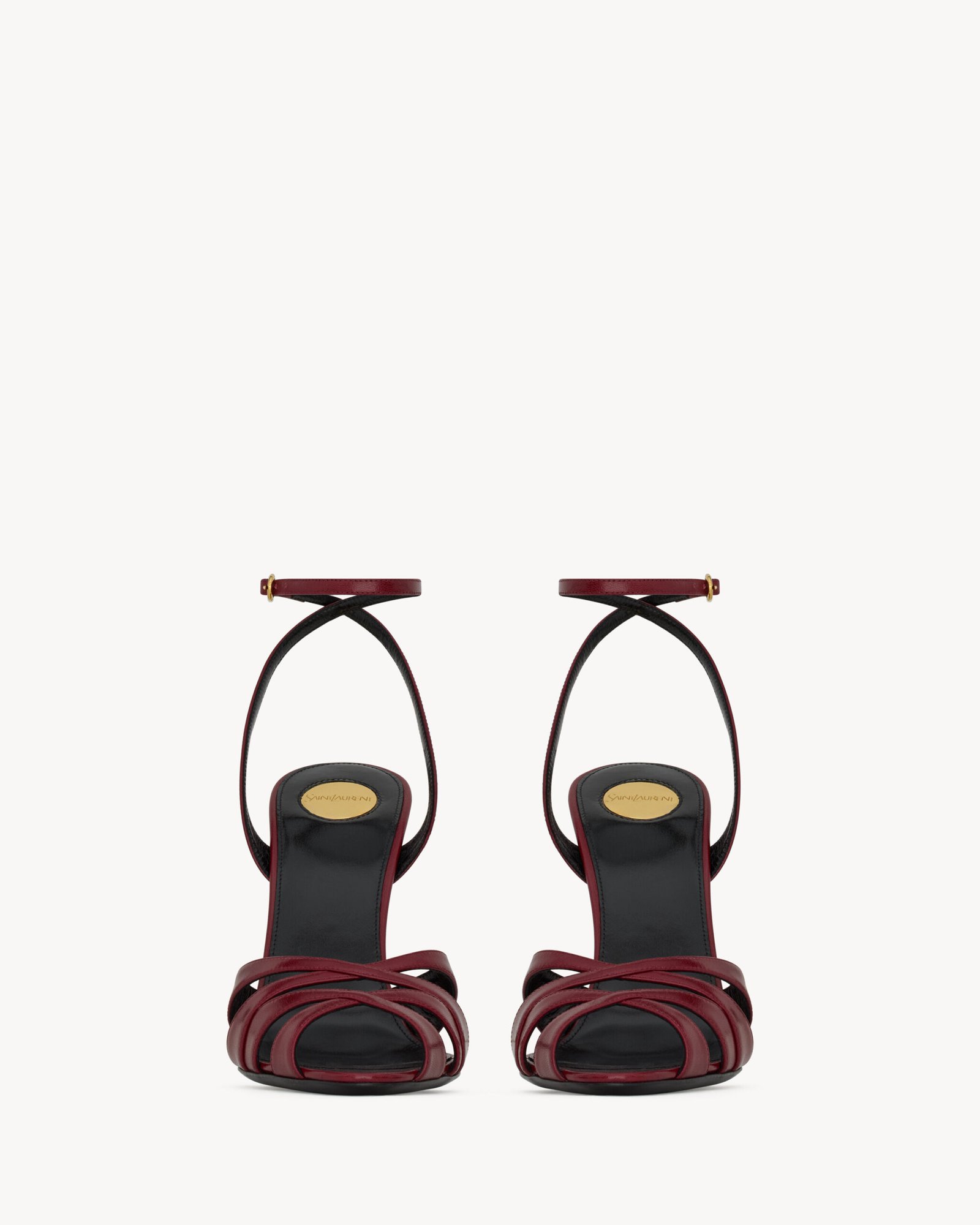 Sandales à talon aiguille munies d’un bout en amande, de brides croisées et d’un talon recouvert, dotées d’une bride cheville réglable.