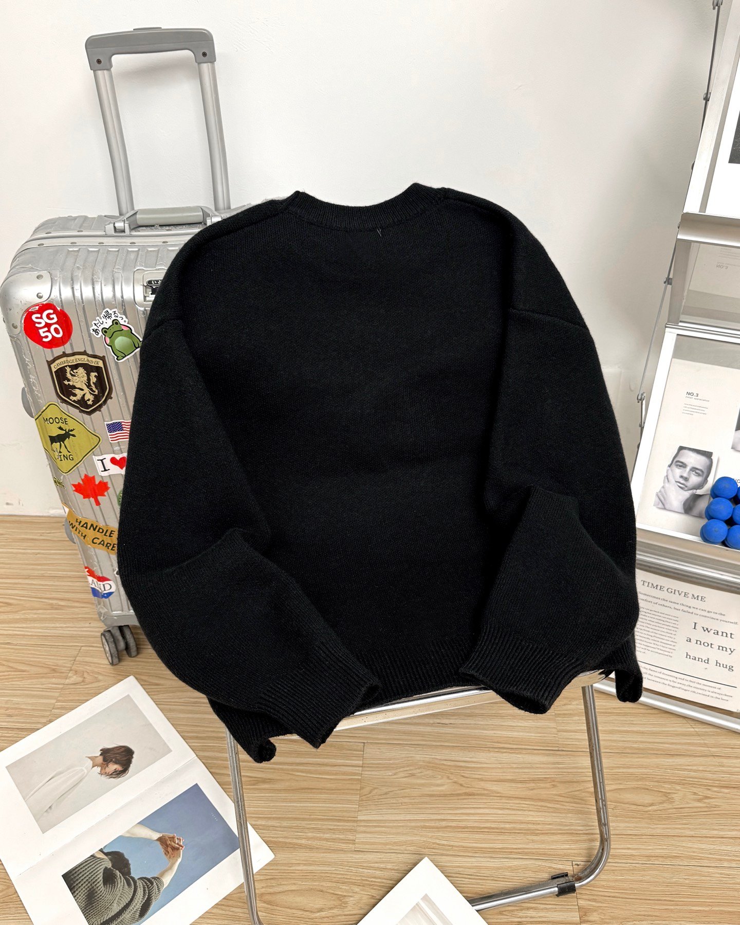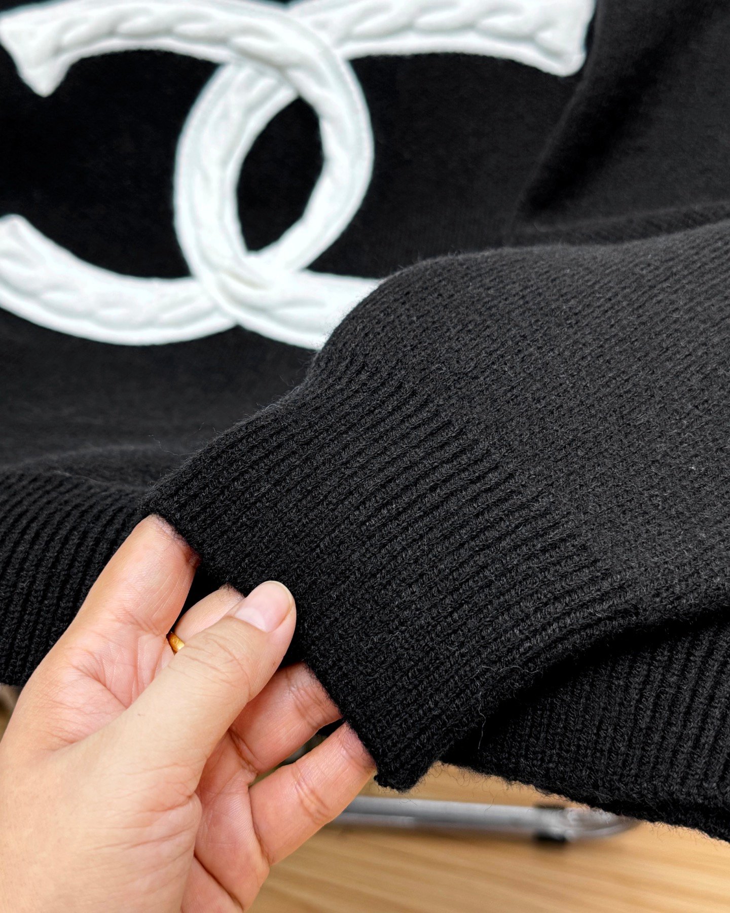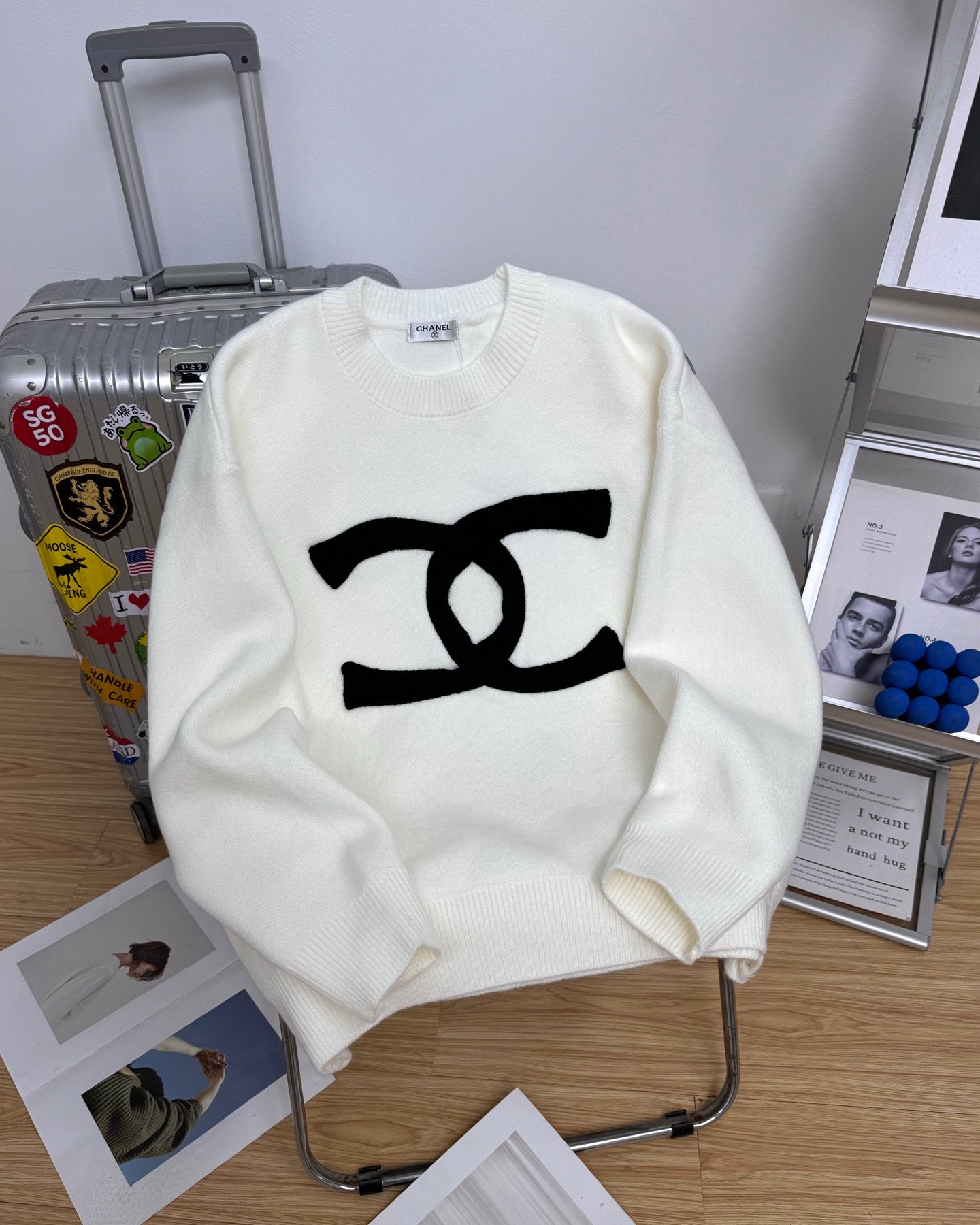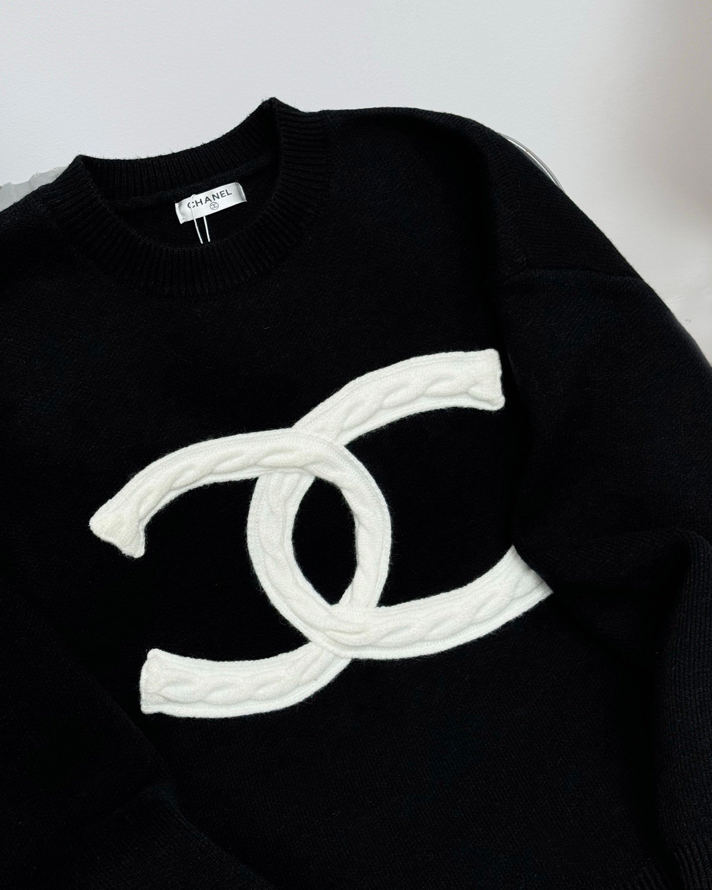 Pull Chanel en laine premium, orné du logo CC brodé en contraste. Disponible en blanc ou en noir, coupe élégante et confortable.