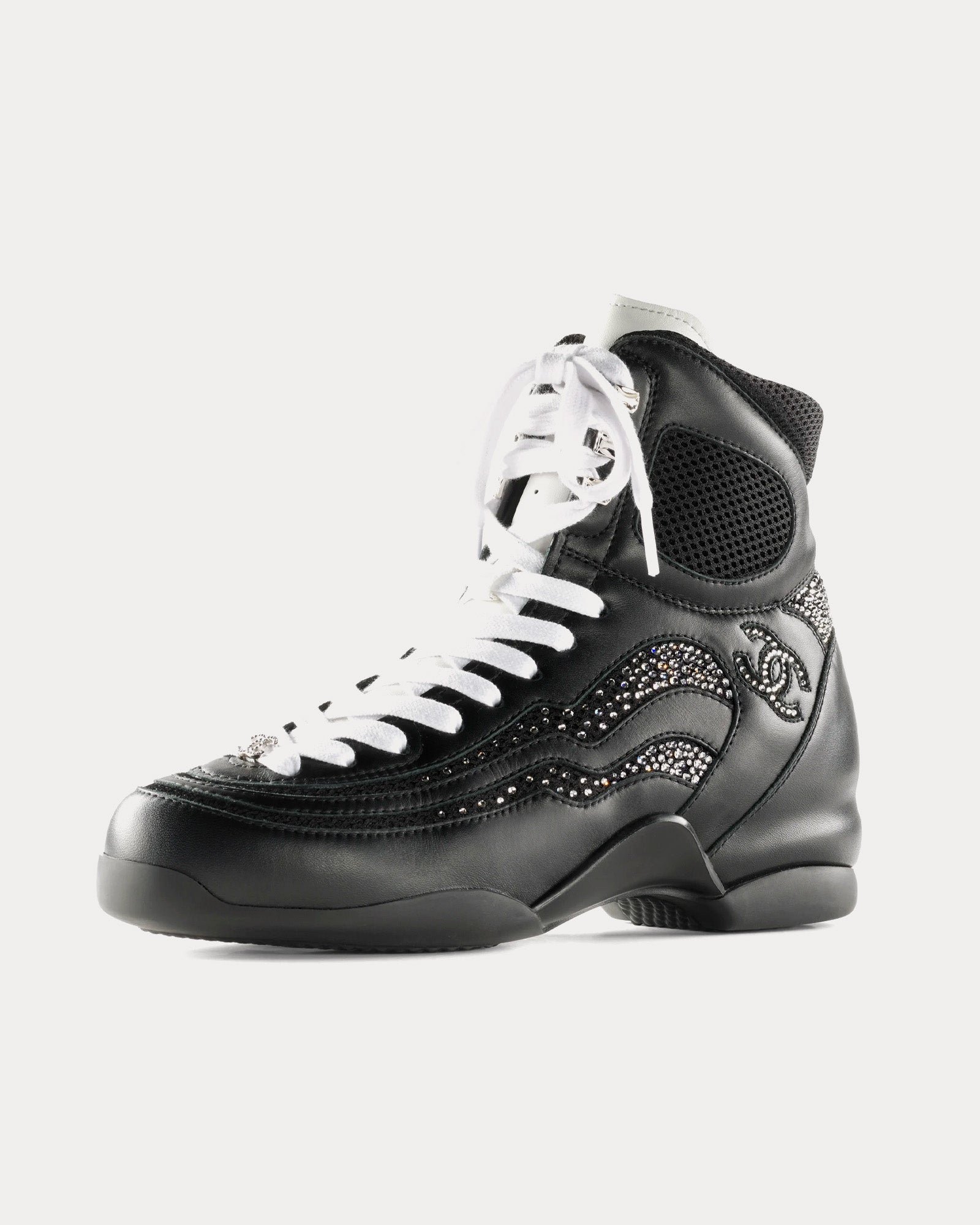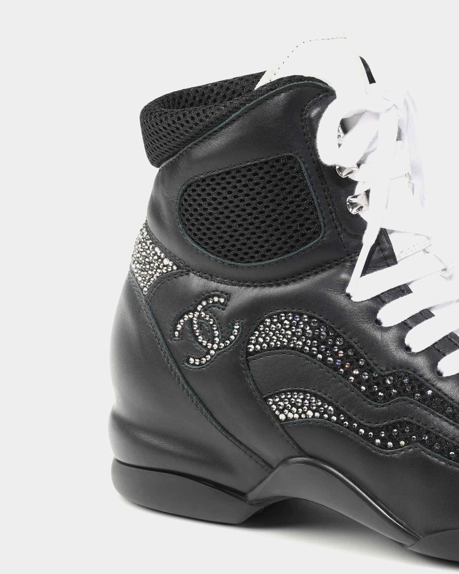 Les bottes montantes pour femmes Chanelen cuir de veau, tissu et strass en noir et argent présentent un design inspiré des baskets avec des semelles épaisses et des lacets.