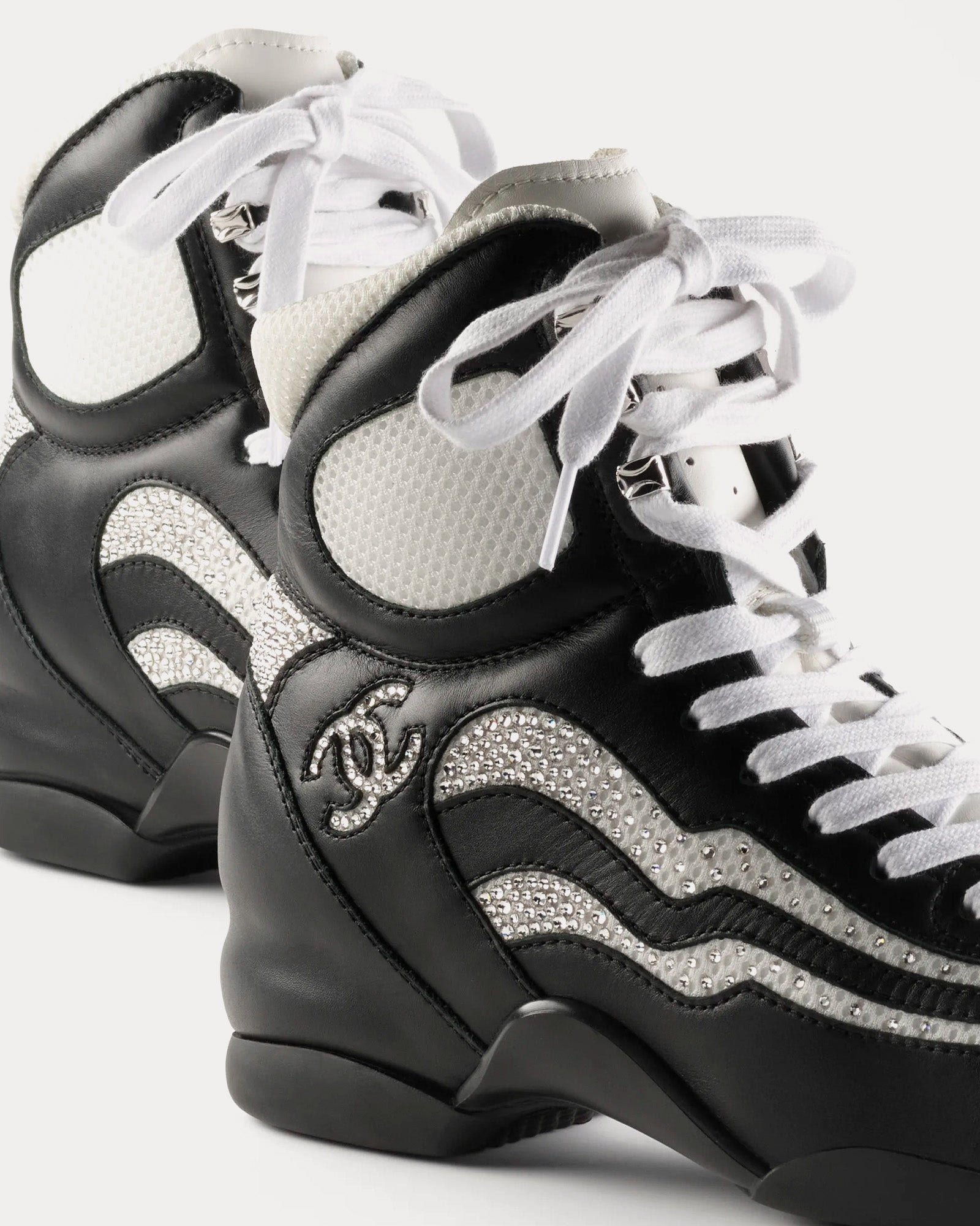 Les bottes montantes pour femmes Chanelen cuir de veau, tissu et strass en noir, blanc et argent présentent un design inspiré des baskets avec des semelles épaisses et des lacets.
