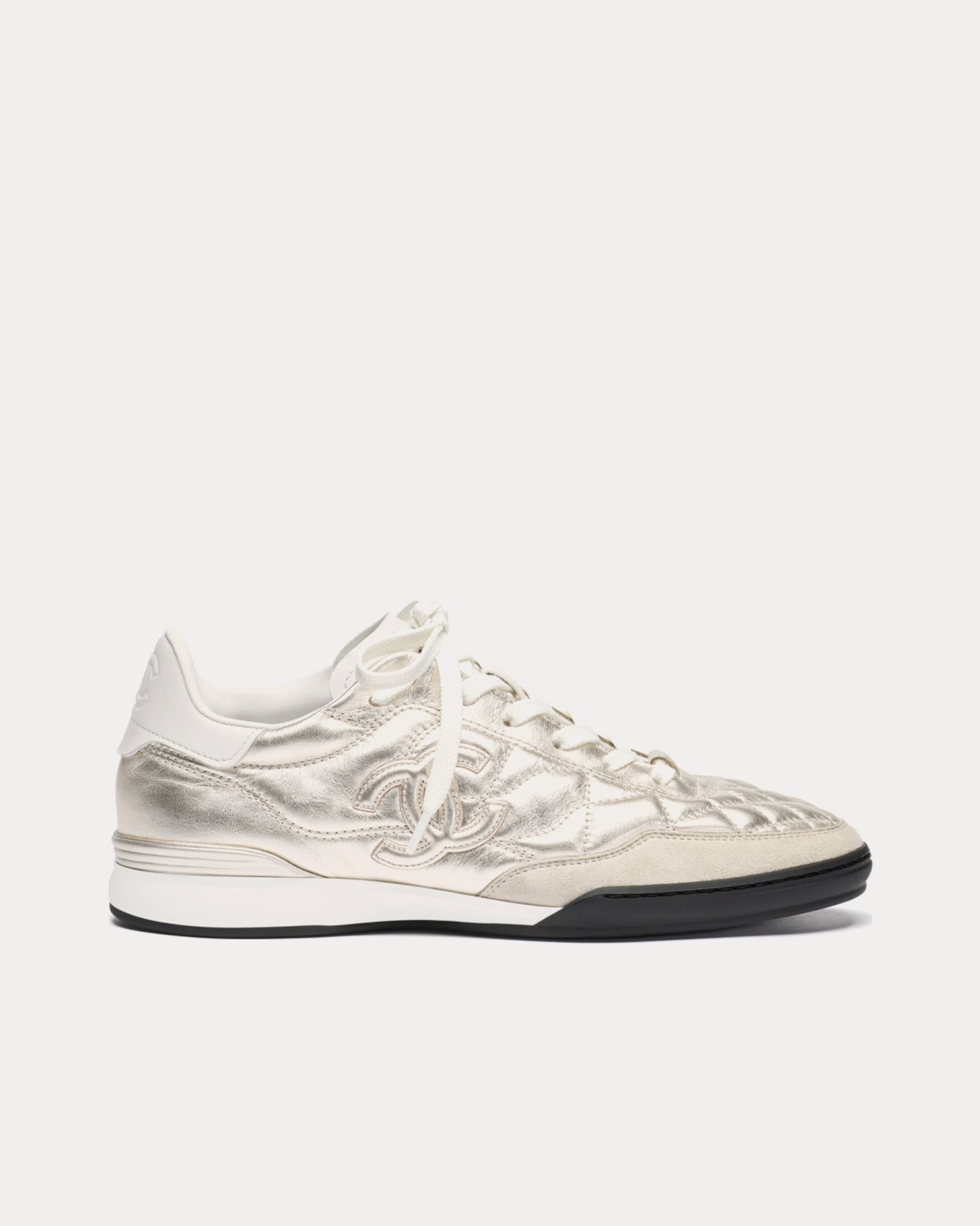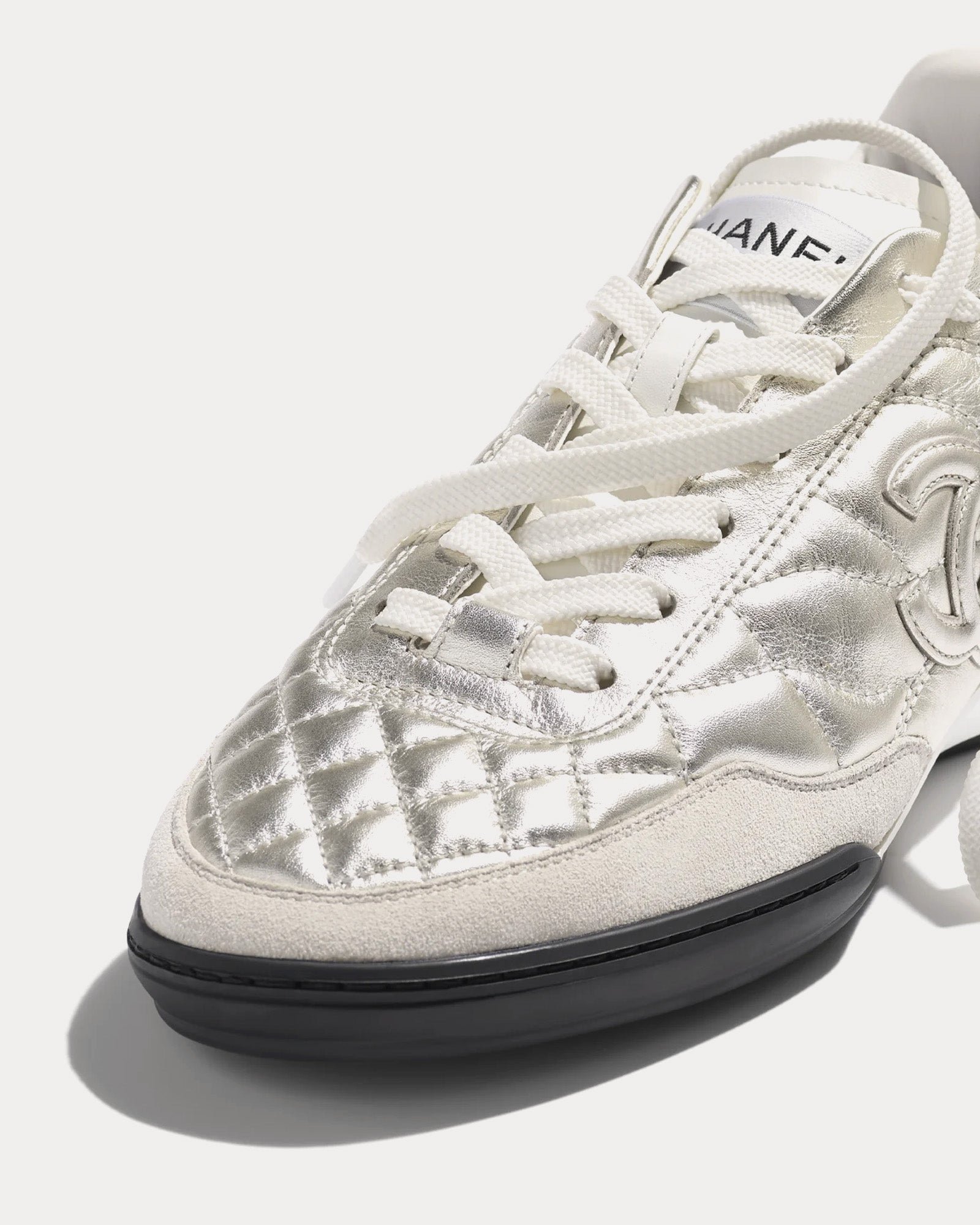 Les baskets basses pour femme Chanel Laminated Calfskin en argent et blanc respirent l’élégance moderne avec une allure audacieuse et confiante. Issues de la collection Prêt-à-porter Printemps-Été 2025, ces baskets sont conçues comme une ode au mouvement et à la liberté, alliant harmonieusement haute couture et polyvalence au quotidien.
