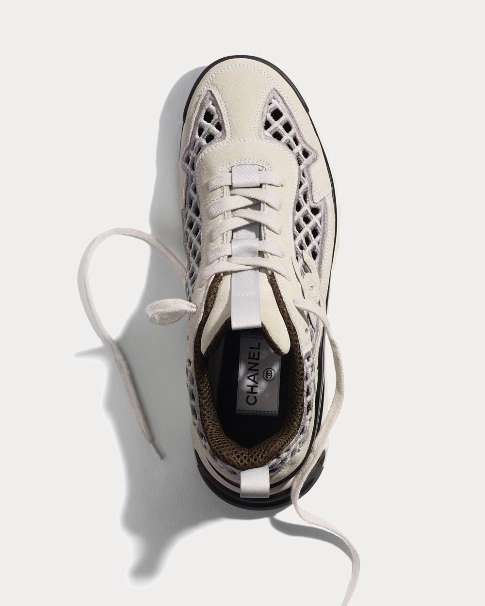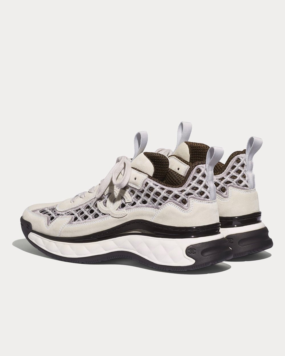 Baskets basses Chanel en cuir de veau suédé et broderies écrues et grises