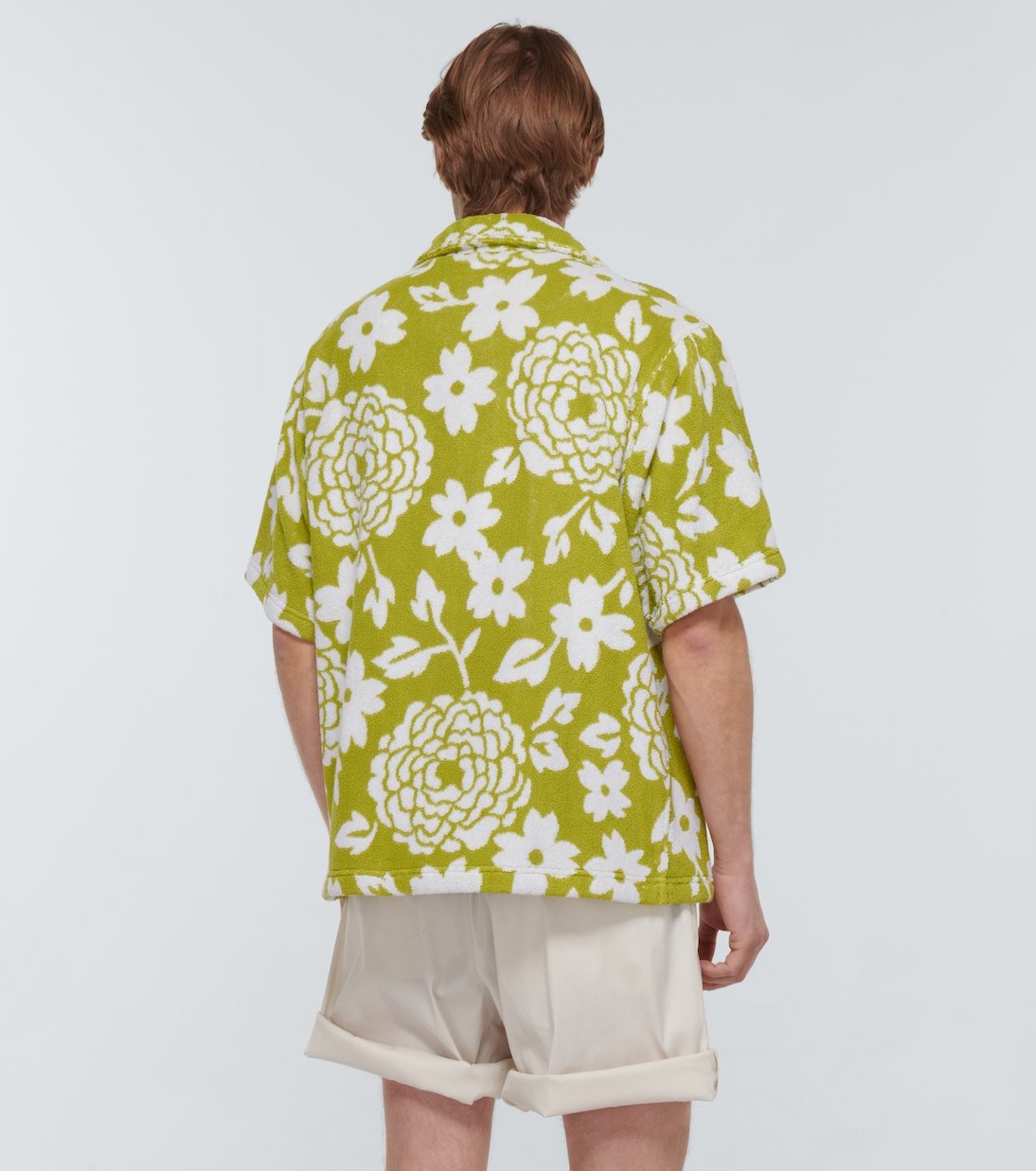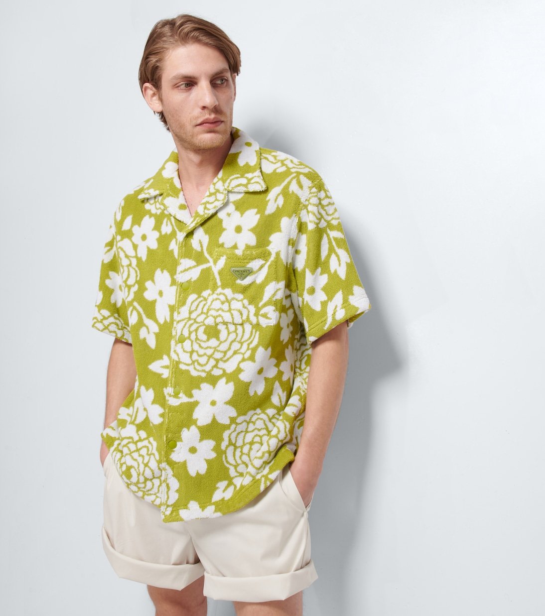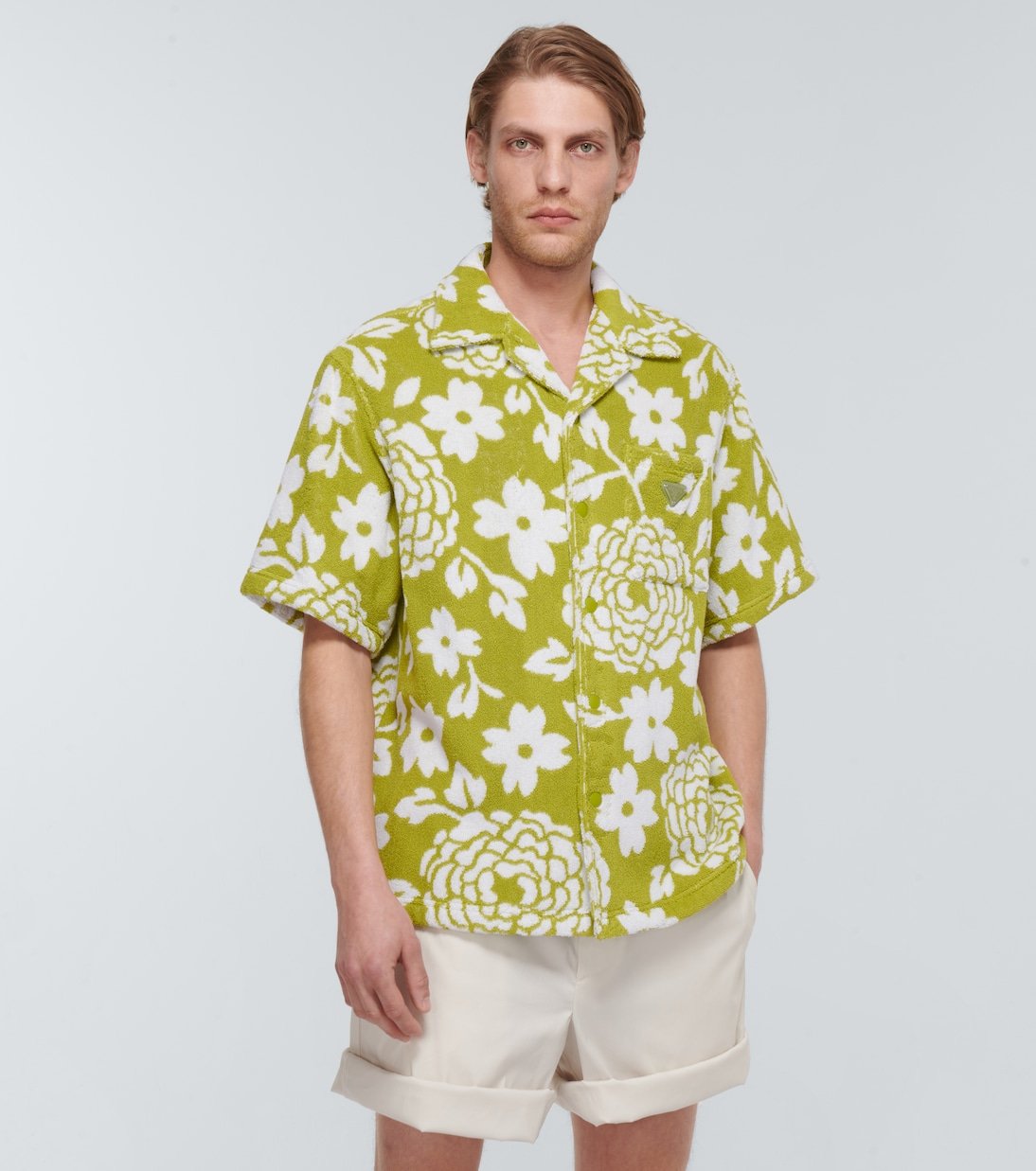 Fabriquée en Italie en pur coton au fini éponge, cette chemise vertes à manches courtes de Prada possède un col cubain, et un logo brodé sur la poche poitrine. Ce modèle arbore un imprimé à fleurs.