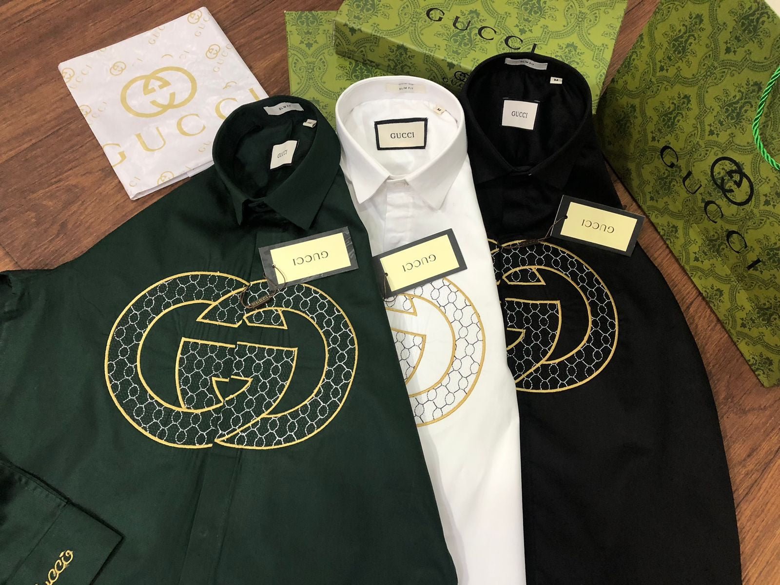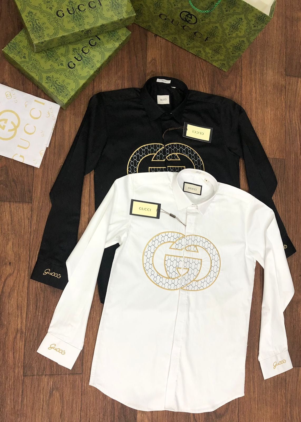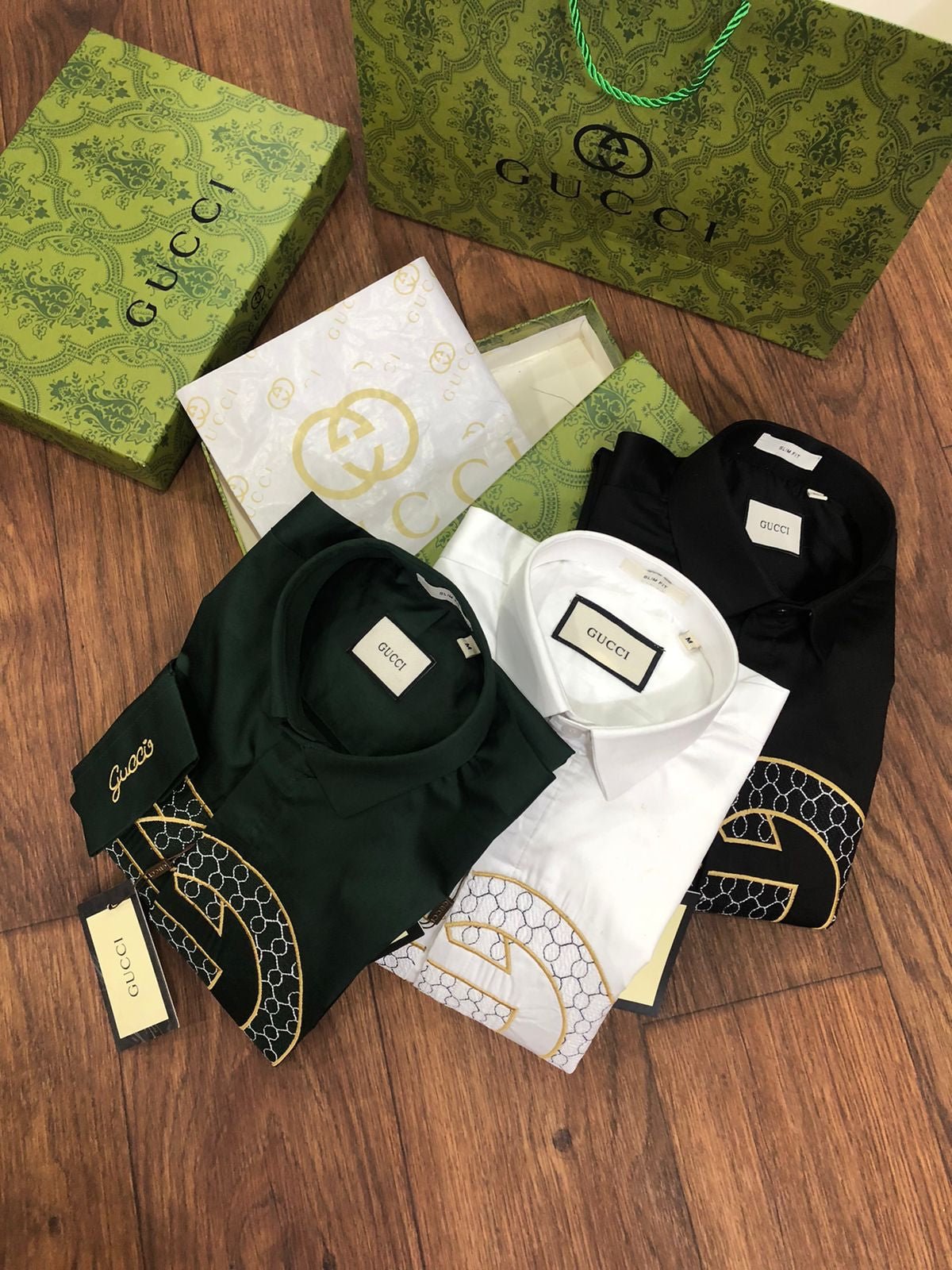 Cette chemise de luxe à manches longues est confectionnée en tissu Raymond Mill 100 % coton et arbore une broderie haut de gamme. Disponible en trois couleurs, coupe standard et avec tous les accessoires d’origine, y compris la boîte d’origine, le bouton embossé de la même marque et le papier sulfurisé de la même marque. Article n° 2023.