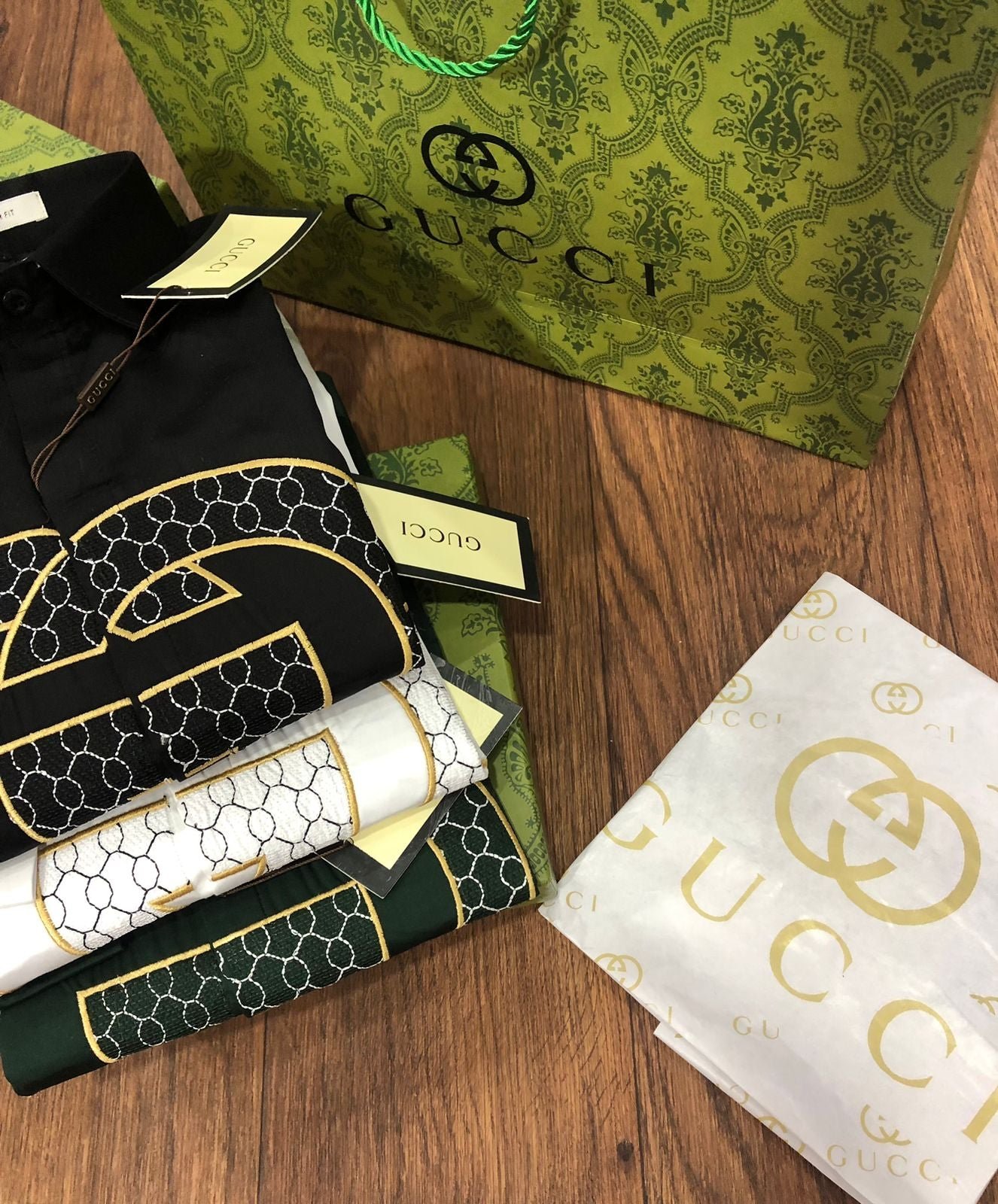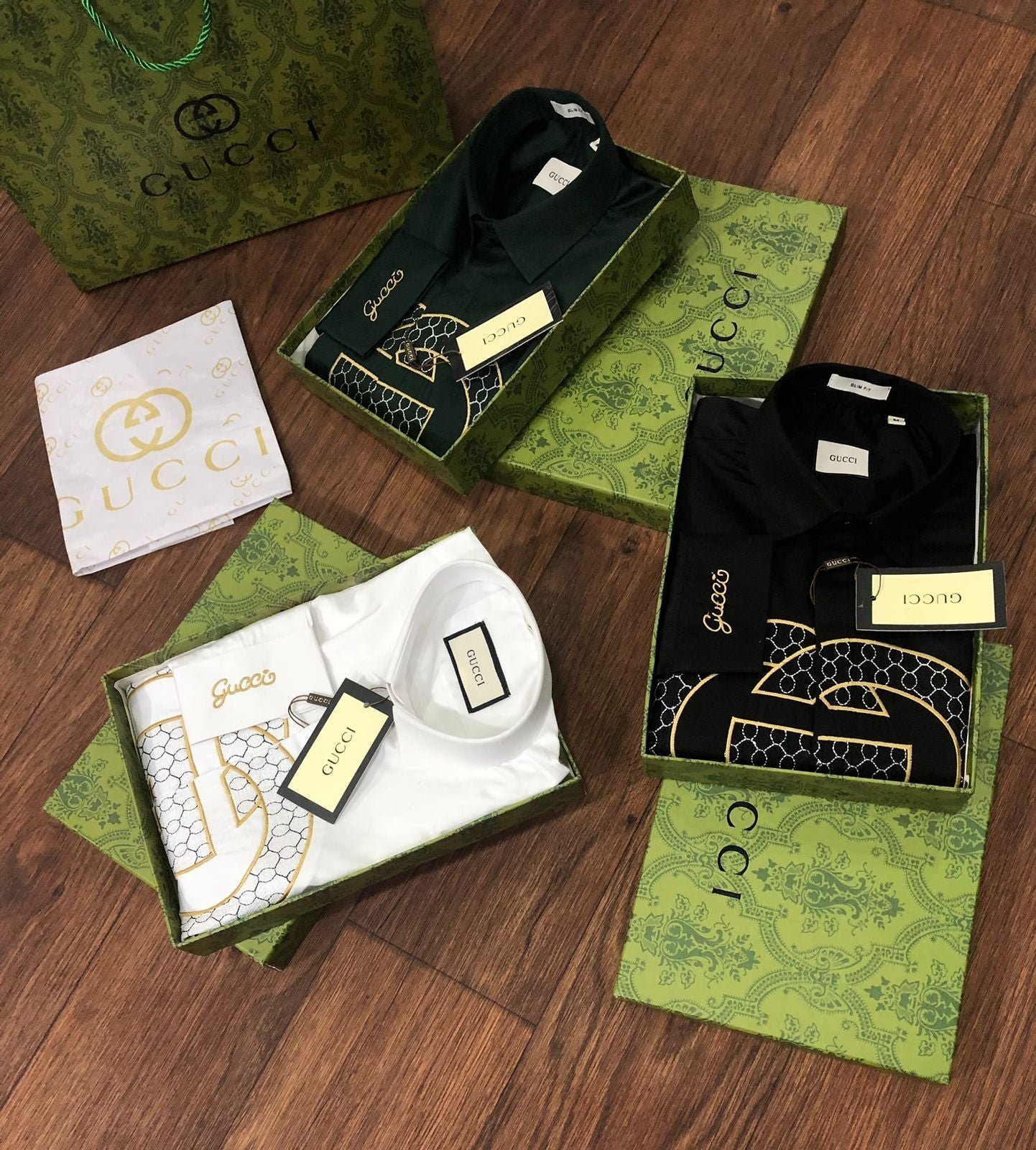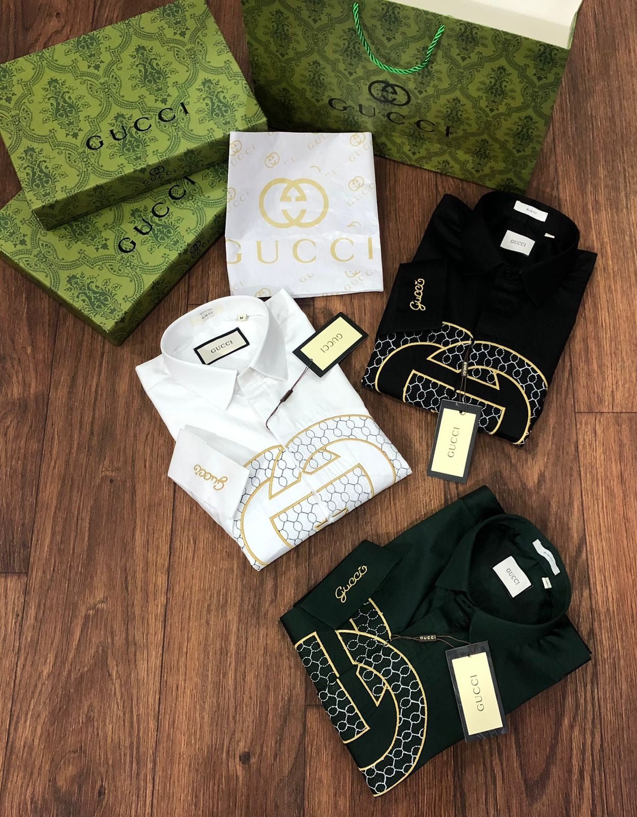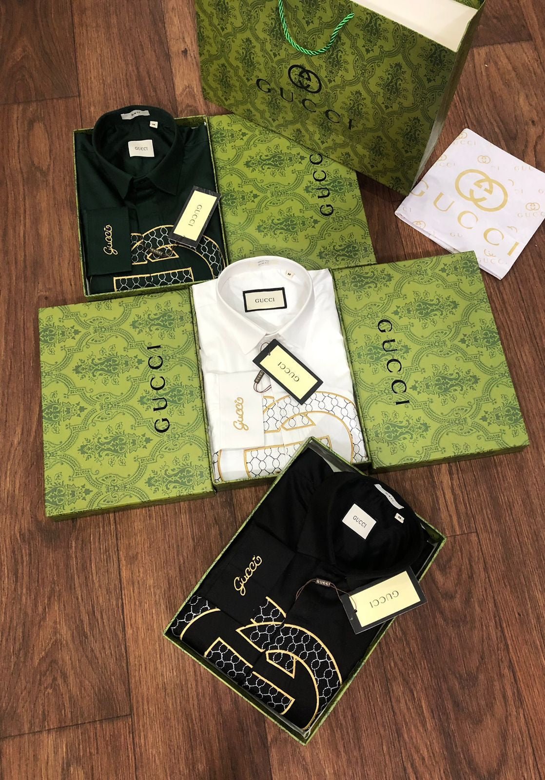 Cette chemise de luxe à manches longues est confectionnée en tissu Raymond Mill 100 % coton et arbore une broderie haut de gamme. Disponible en trois couleurs, coupe standard et avec tous les accessoires d’origine, y compris la boîte d’origine, le bouton embossé de la même marque et le papier sulfurisé de la même marque. Article n° 2023.