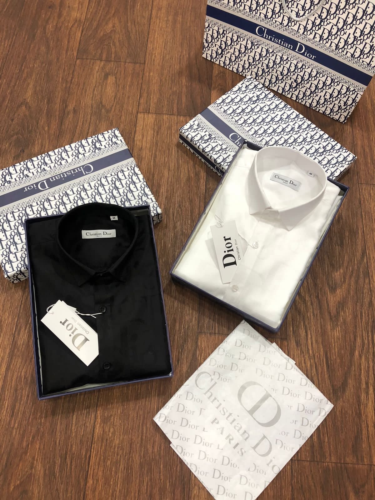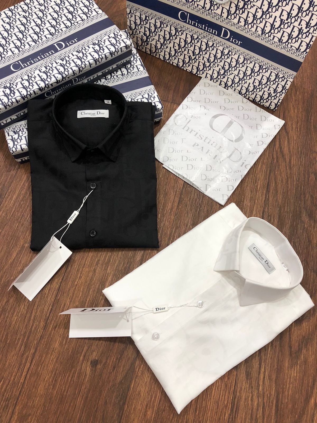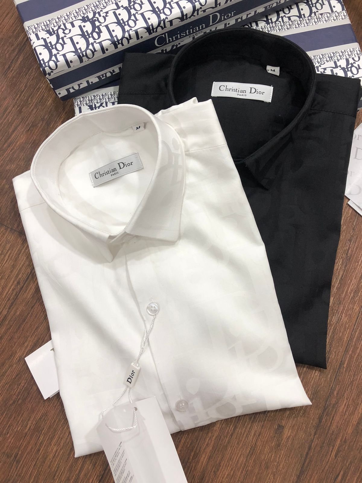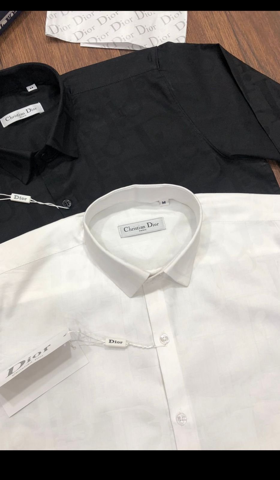 Ces élégantes chemises à manches longues sont confectionnées en coton importé teint en fil pour une coupe confortable. De coupe standard, elles sont disponibles en deux coloris : noir et blanc. Ces chemises arborent le motif n° 2023 (ARTICLE EN COURS) et sont livrées dans leur boîte d’origine et avec des boutons en relief de la même marque.