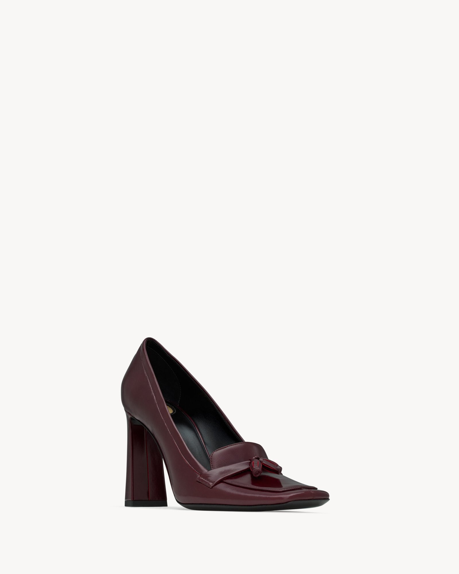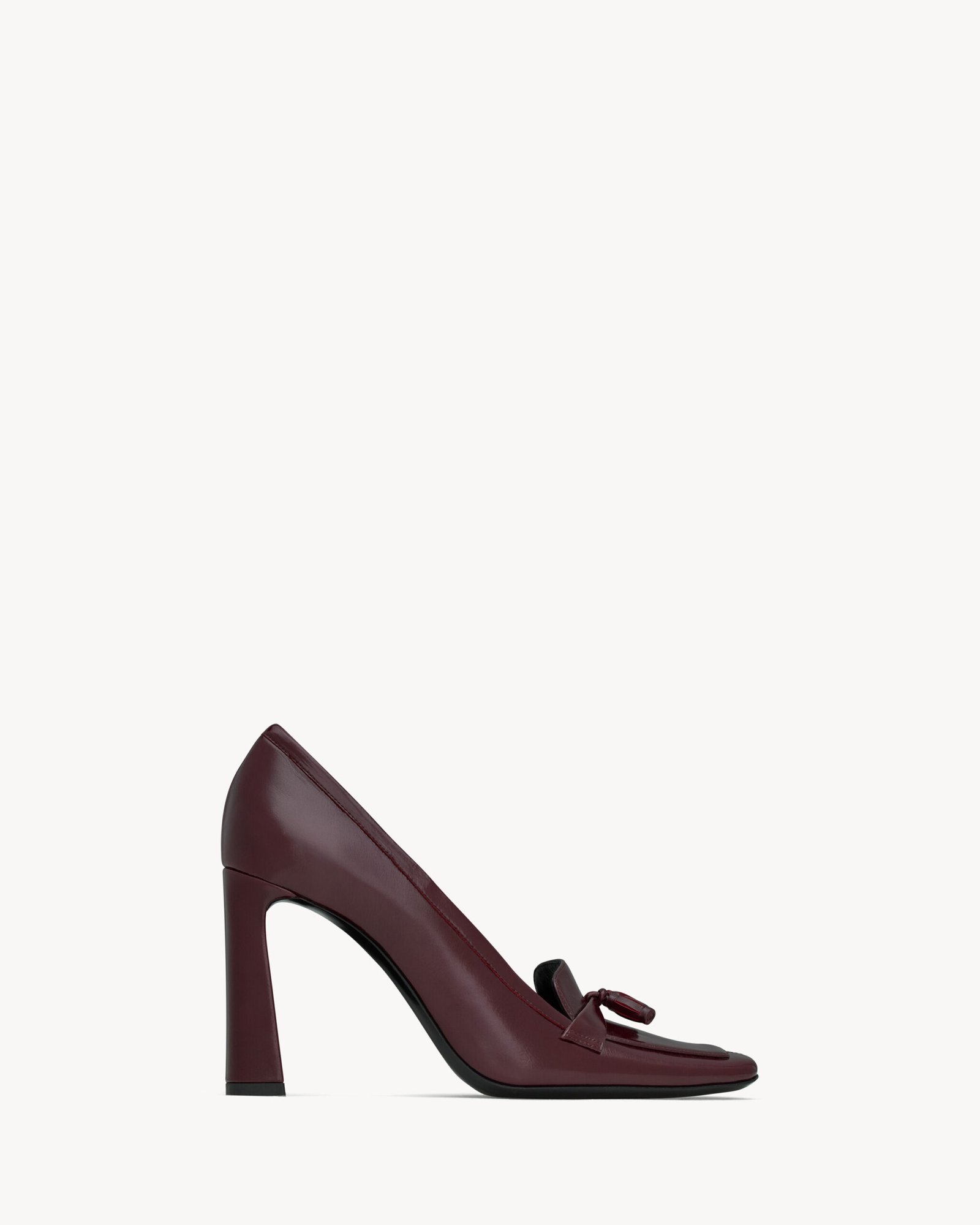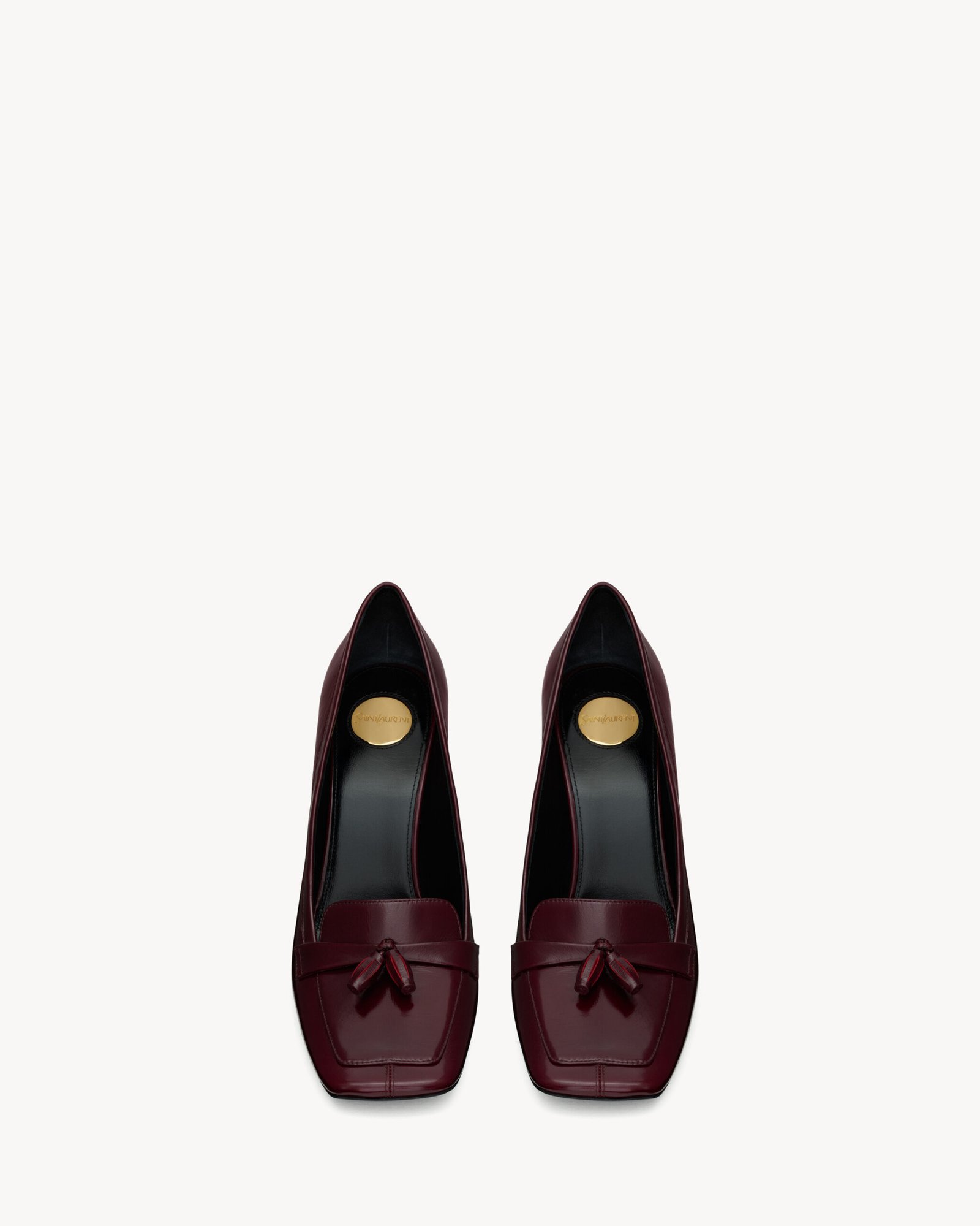 Escarpins à pompon munis d’un bout carré et d’un talon recouvert évasé et carré.