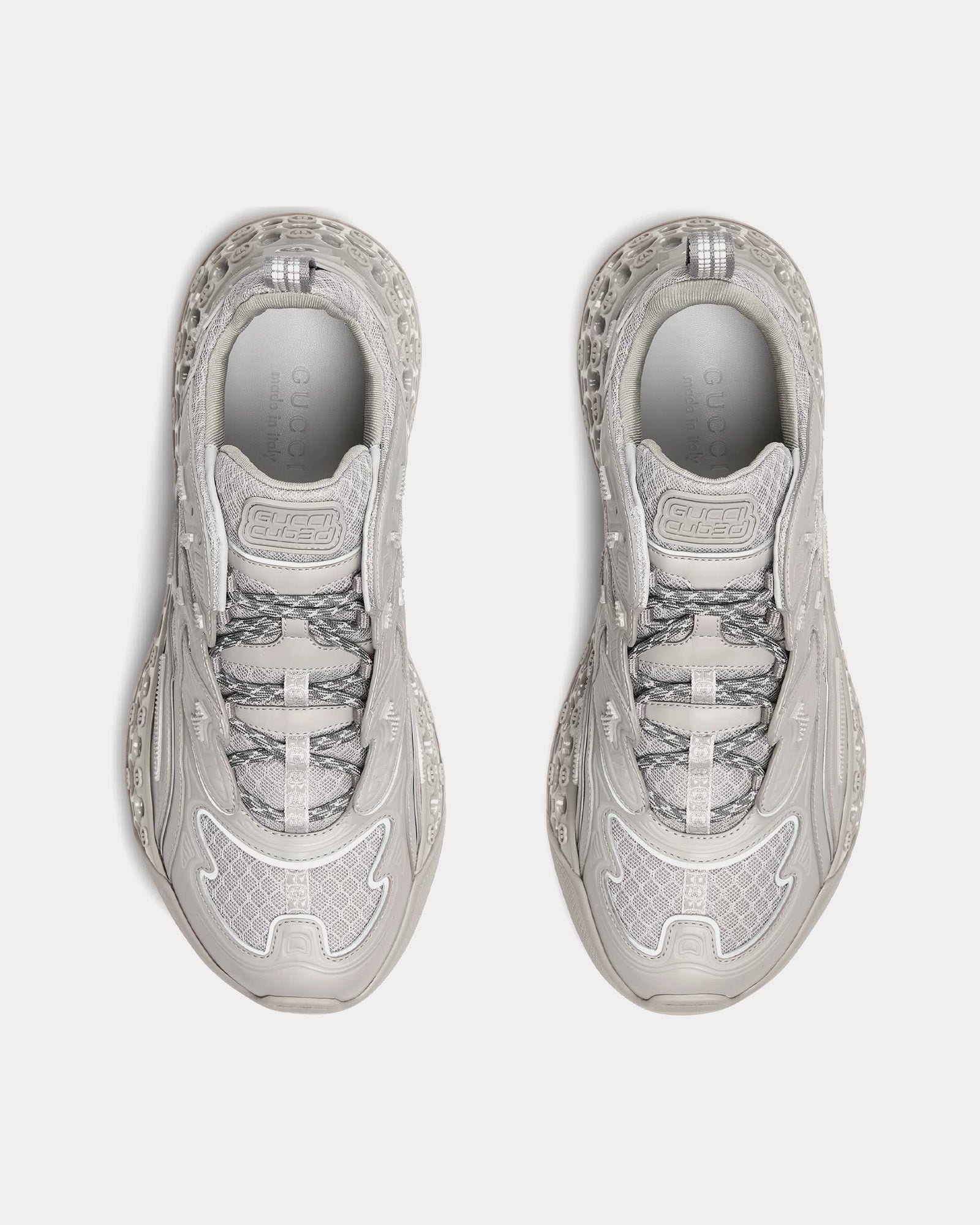Les baskets basses pour homme Guccicub3d Demetra de couleur gris sont fabriquées à partir d’au moins 70 % de matières premières végétales issues de sources renouvelables (viscose, pâte de bois, polyuréthane biosourcé) avec une doublure en mesh et tissu, des semelles bi-matière et un motif G entrelacés à effet 3D. Fabriquées en Italie.