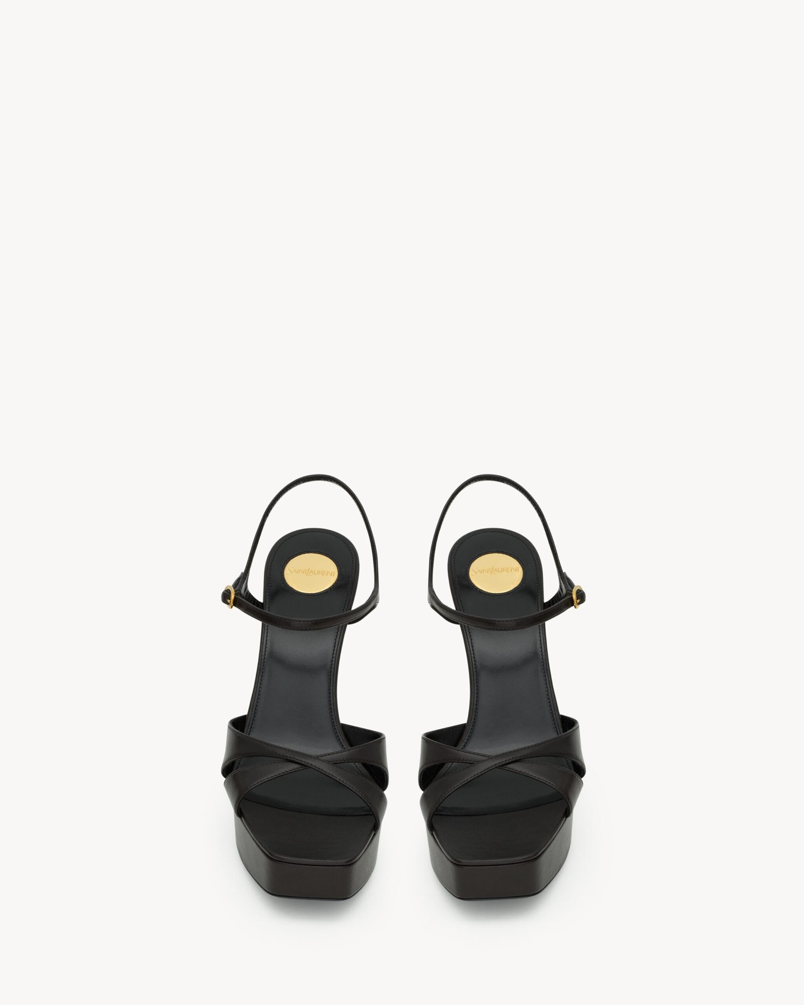 Sandales à plateforme et bout carré, munies de brides croisées et d’un talon aiguille recouvert.