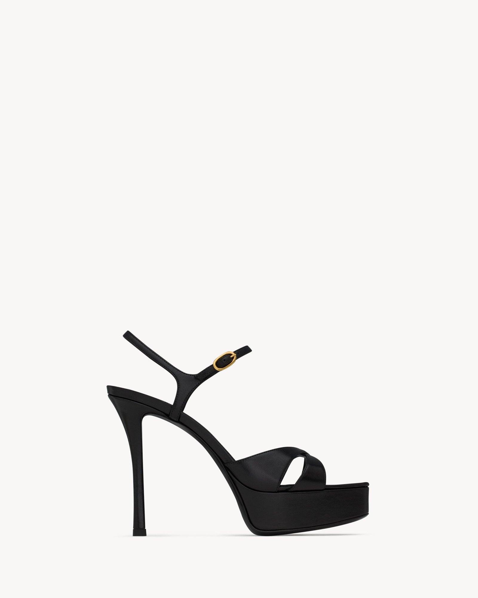 Sandales à plateforme et bout carré, munies de brides croisées et d’un talon aiguille recouvert.