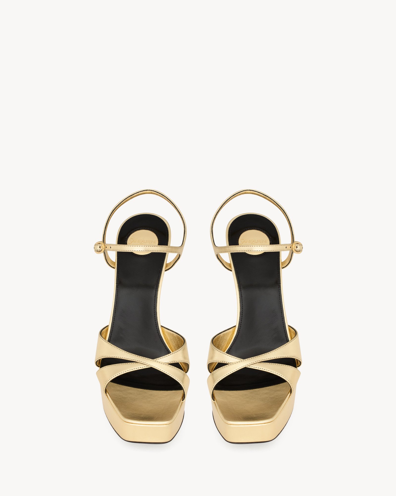 Sandales à plateforme et bout carré, munies de brides croisées et d’un talon aiguille recouvert.