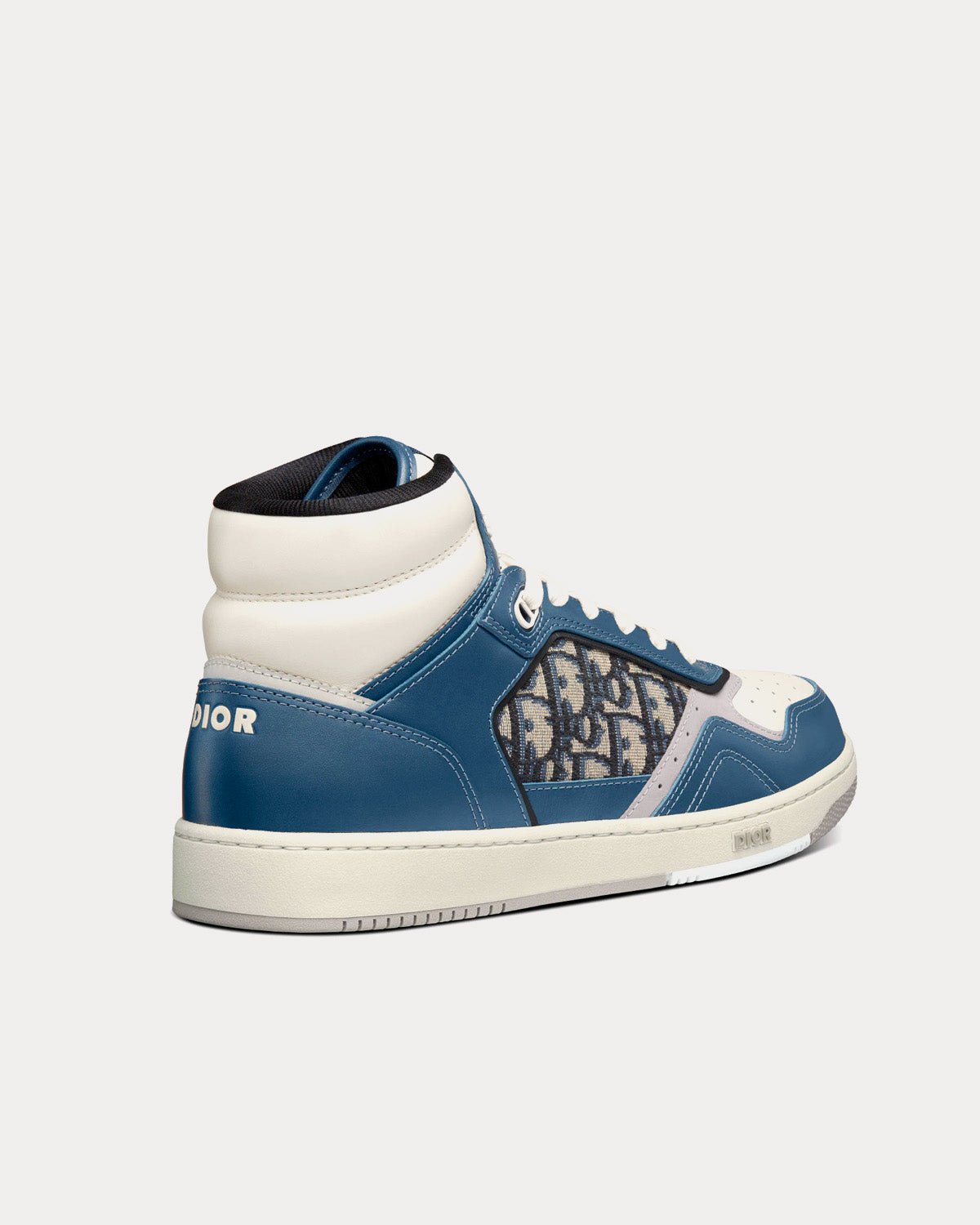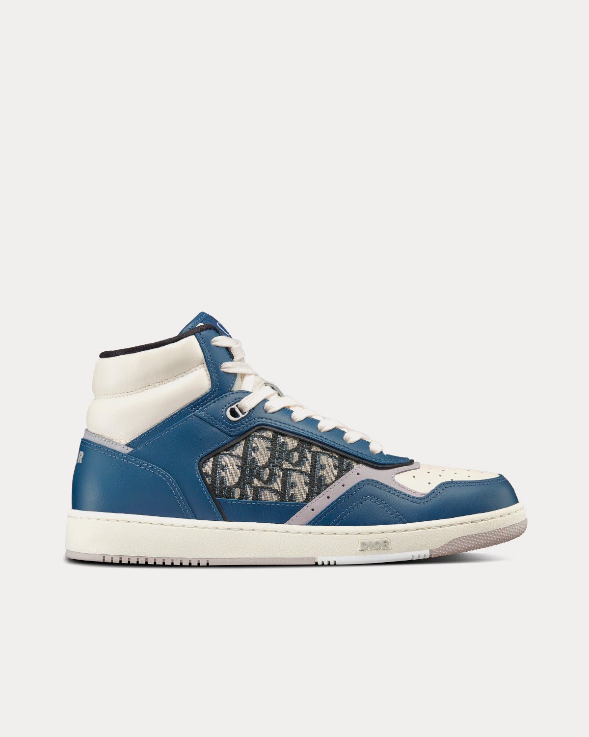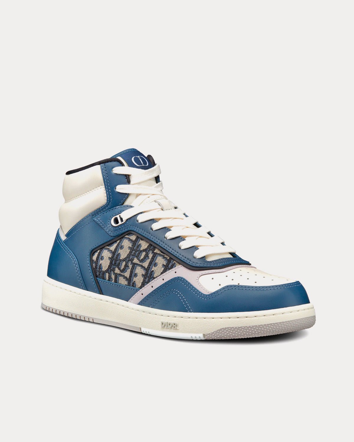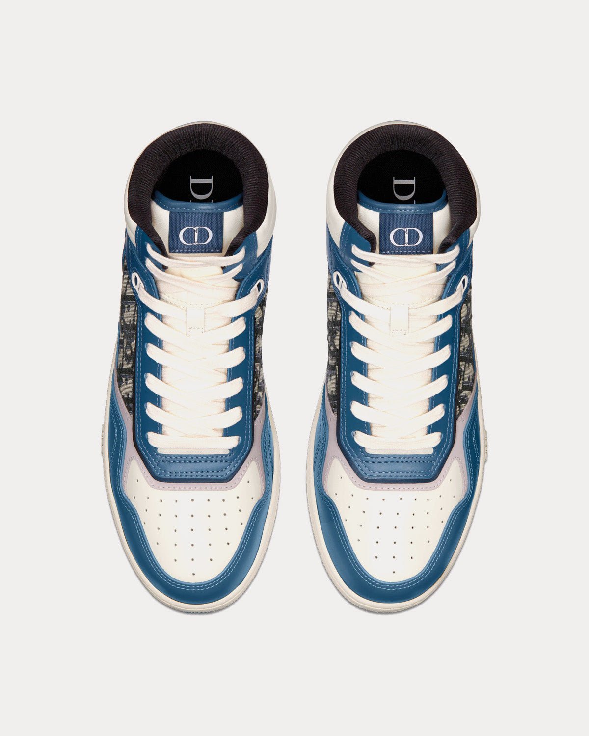 Baskets montantes Dior B27 en cuir de veau lisse bleu, crème et gris Dior avec jacquard Dior Oblique beige et noir