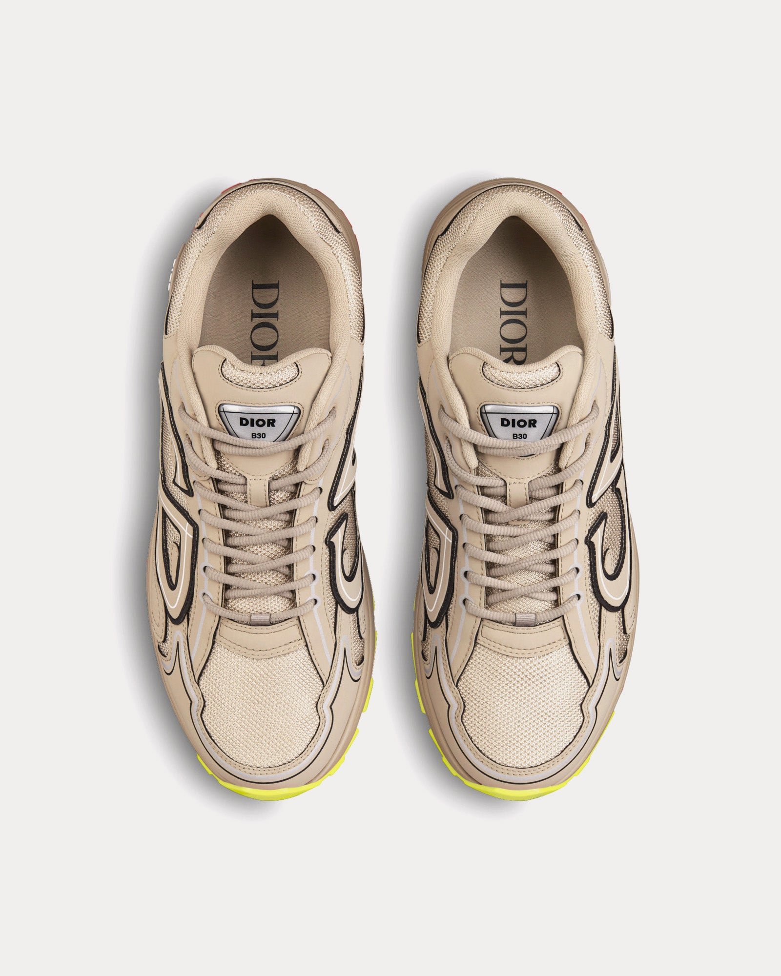 Les baskets basses Dior B30 pour hommes de couleur beige sont confectionnées en mesh et tissu technique et présentent une languette signature Dior B30, une fermeture à lacets, une doublure en cuir de veau et mesh technique, une semelle extérieure en caoutchouc sculpté ultra-légère avec bordure signature Dior, une semelle bicolore avec signature Dior, B30 et CD30, et une construction soudée.