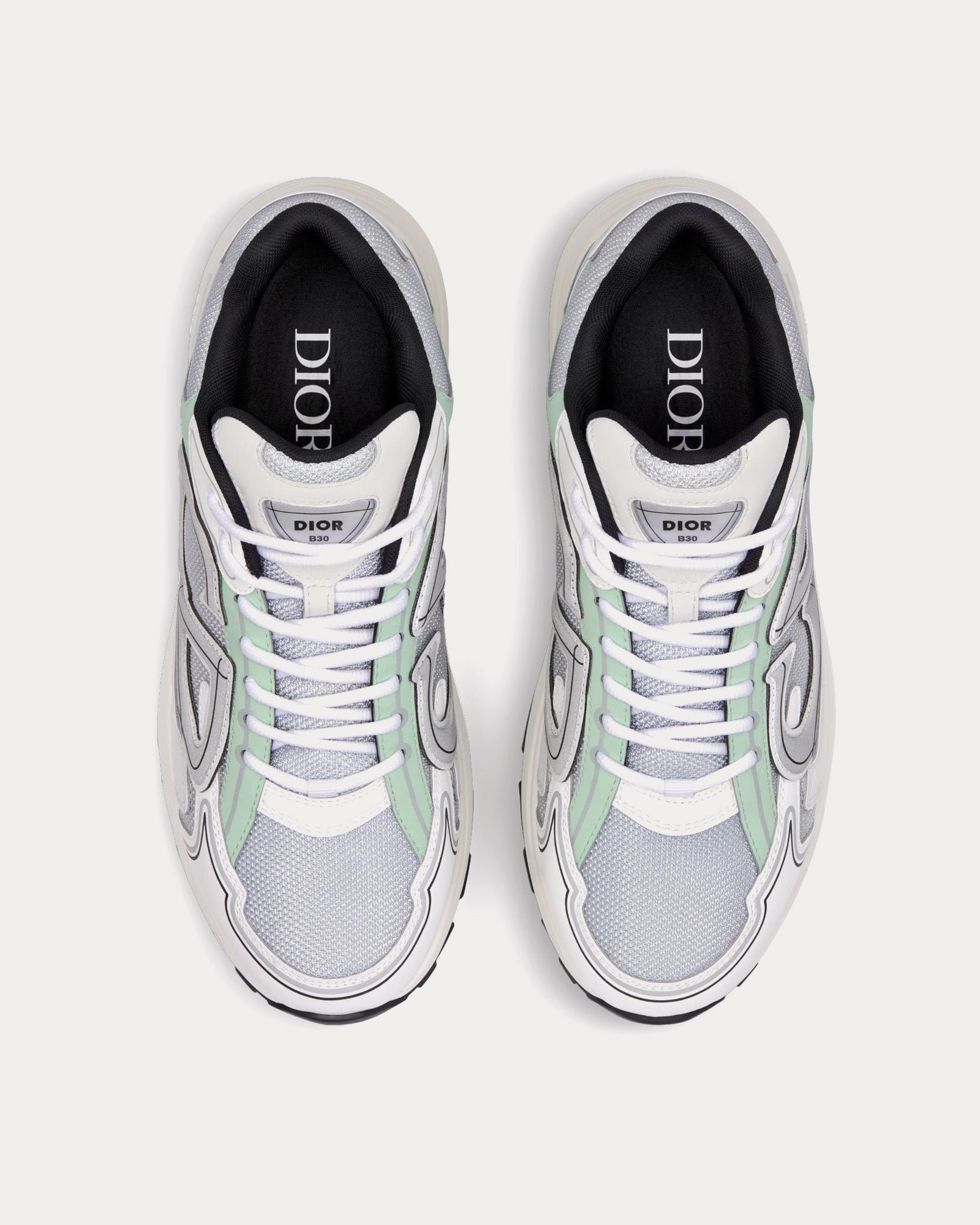 Les baskets basses pour homme Dior B30 en gris, vert clair, blanc et noir sont confectionnées en mesh et tissu technique. Elles sont dotées d’une languette signature Dior B30, d’une fermeture à lacets, d’une doublure en cuir de veau et mesh technique, d’une semelle extérieure en caoutchouc sculpté ultra-légère avec bordure signature Dior, d’une semelle bicolore avec signature Dior, B30 et CD30, et d’une construction soudée.