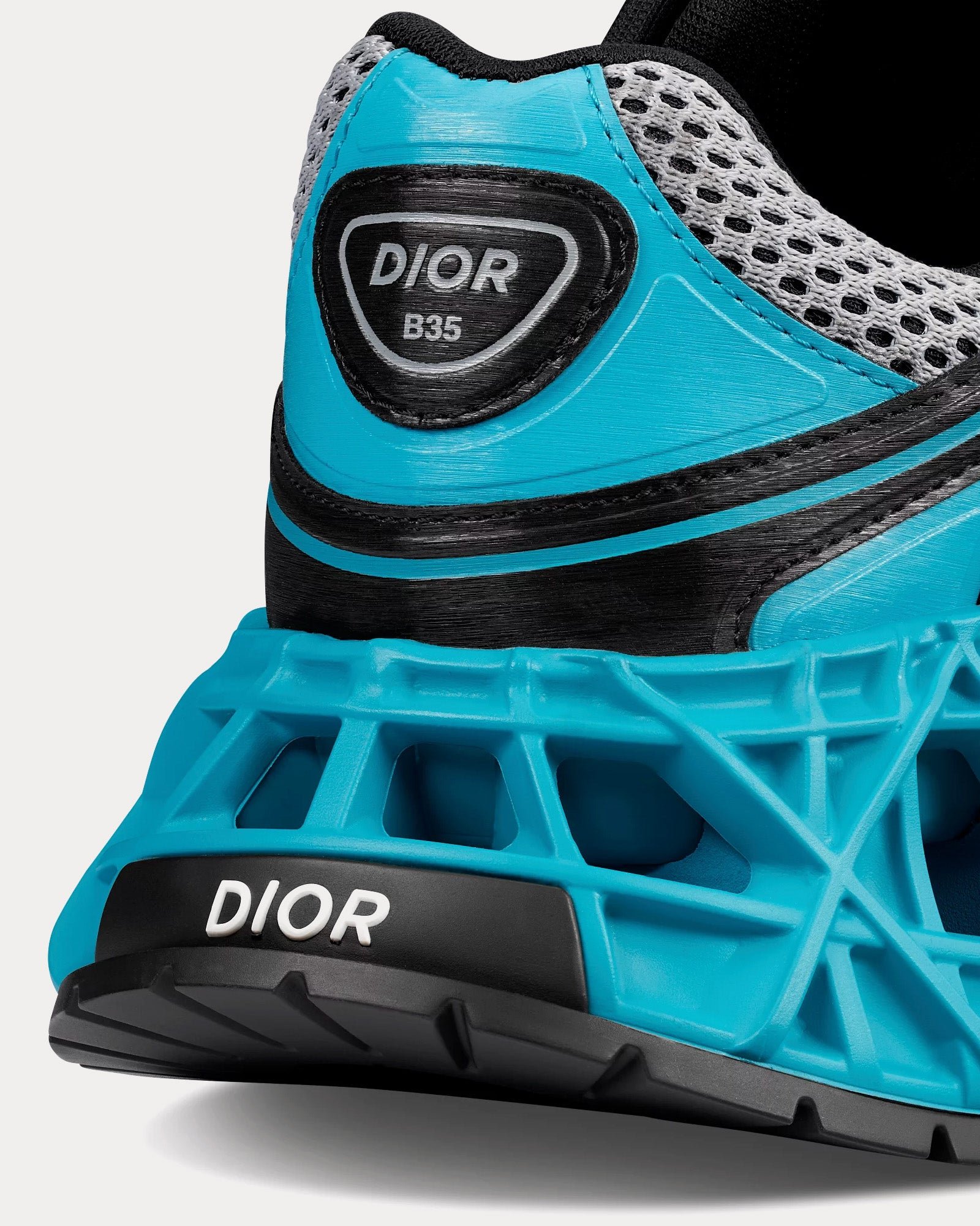Confectionnée en tissu technique à finition métallisée et en mesh technique superposé dans des tons gris ton sur ton, la tige rappelle les chaussures de course rétro des années 90 tout en adoptant une esthétique moderne. La semelle extérieure Cannage, à la fois volumineuse et légère, offre un impact architectural, conçue pour une stabilité et un confort exceptionnels. Les signatures Dior et le logo « 47 » ornent les côtés, tandis que la languette et le contrefort arborent le logo Dior B35. Un deuxième jeu de lacets en coton bleu et une housse de protection griffée complètent ce coffret de collection.