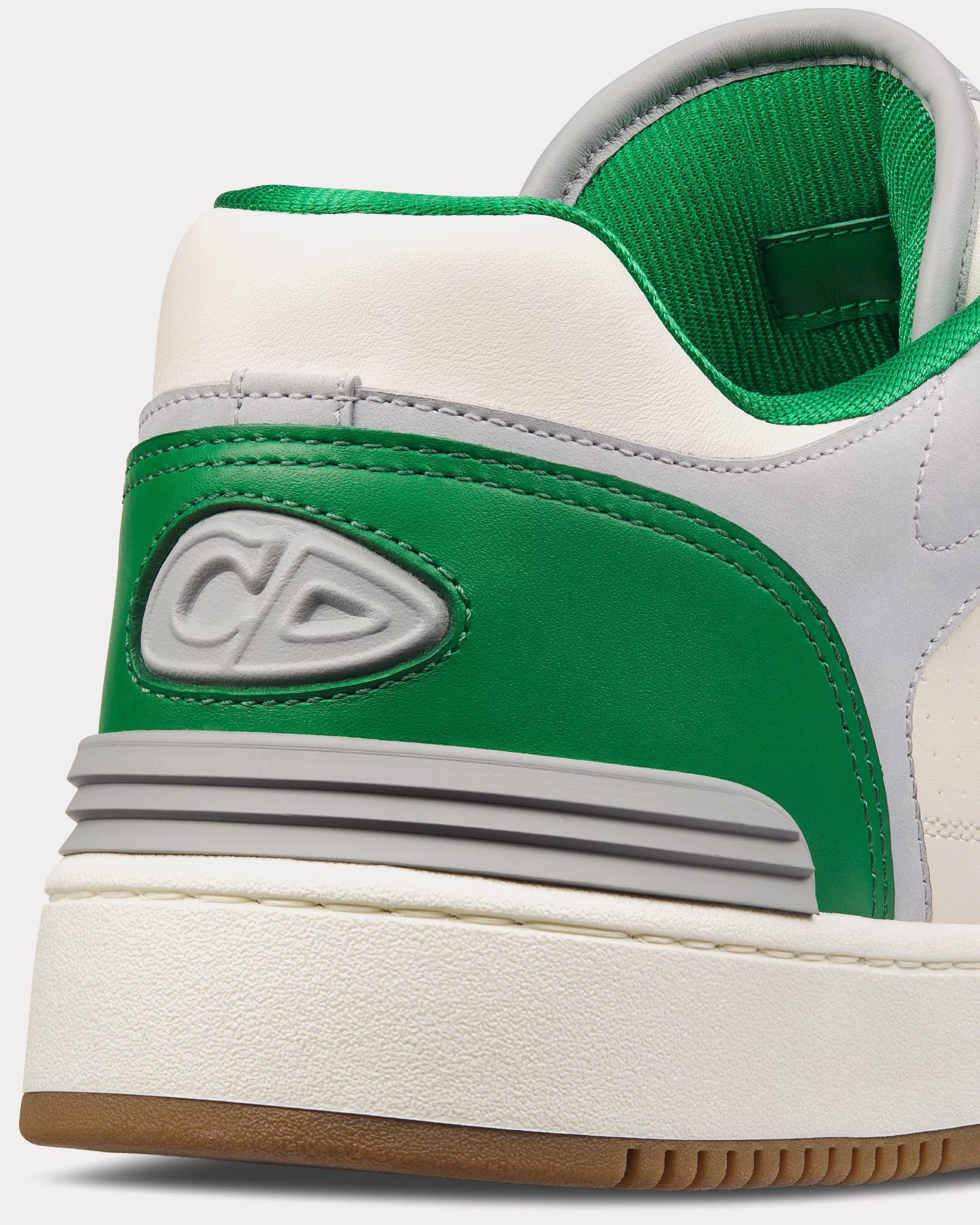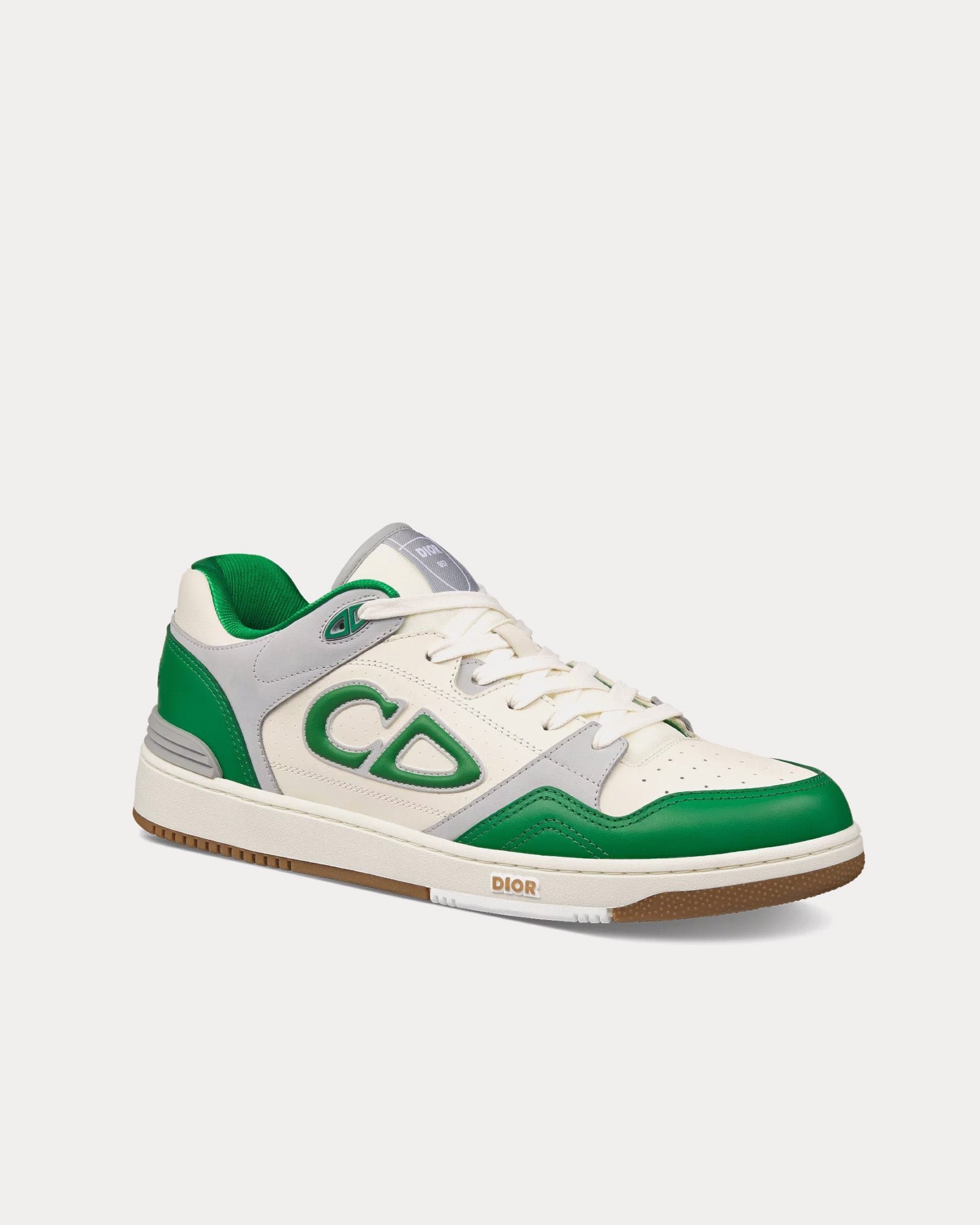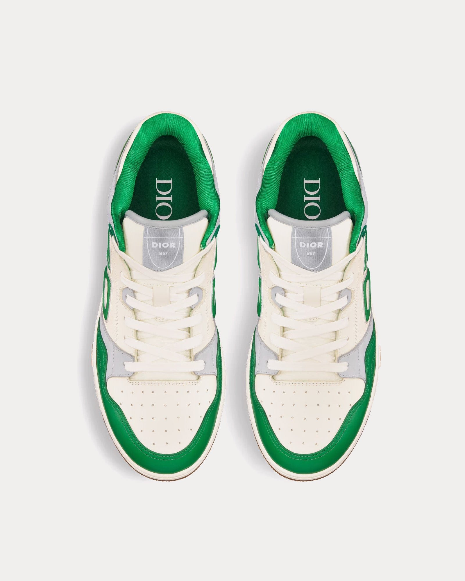 Les baskets basses pour homme Dior B57 en cuir de veau lisse vert et crème avec suède gris clair présentent la signature CD en cuir sur les côtés, une languette signature Dior B57, la signature CD sur les talons, une conception mi-montante avec cheville rembourrée, une fermeture à lacets avec œillets signature CD bicolores, des détails perforés sur les orteils, une doublure en mesh technique, une semelle extérieure en caoutchouc avec signature Dior et une construction soudée et cousue sur les côtés. Fabriquées en Italie.