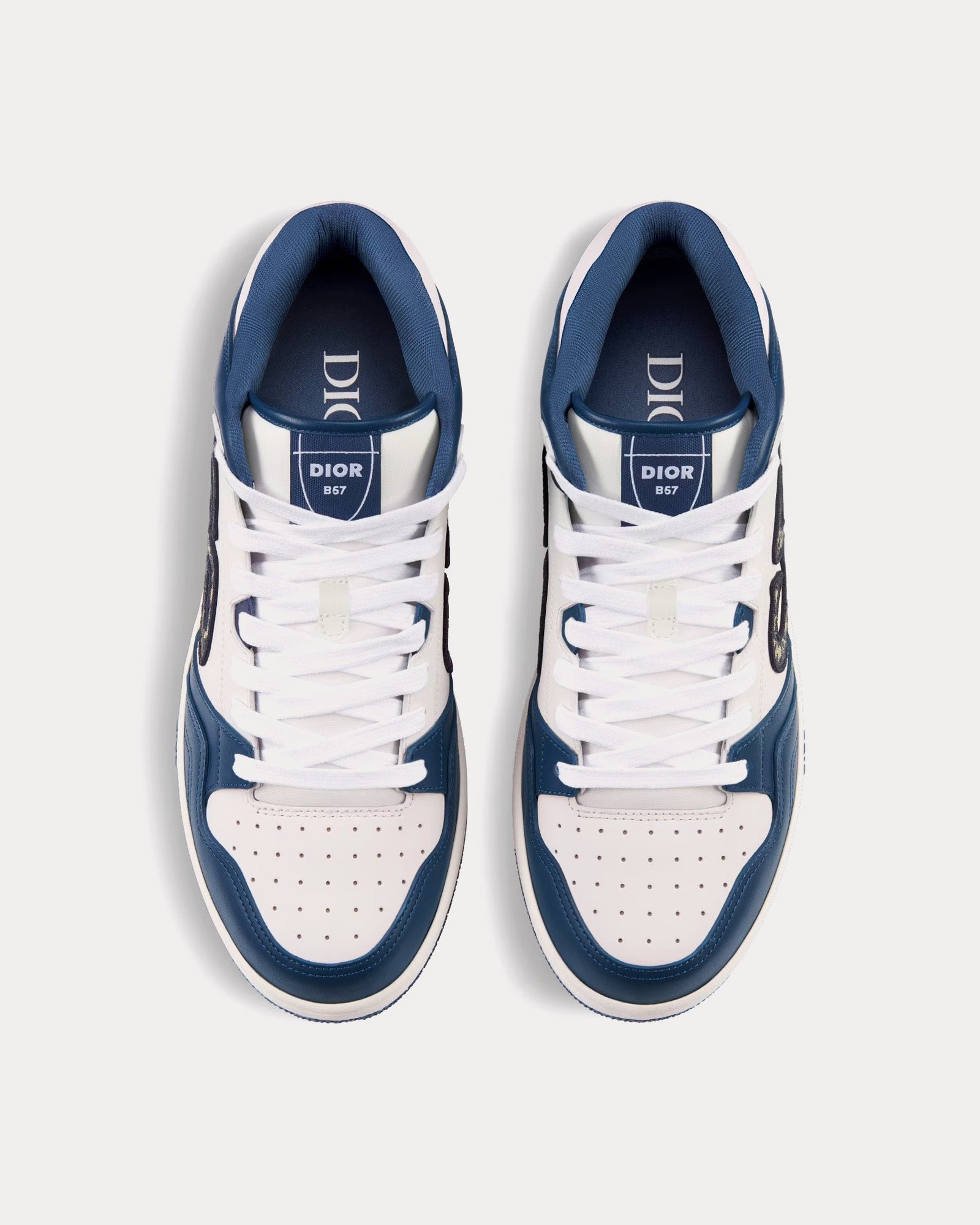 Les baskets mi-montantes Dior B57 pour homme en cuir de veau lisse bleu marine et blanc avec jacquard Dior Oblique beige et noir présentent la signature CD en cuir sur les côtés, une languette signature Dior B57, la signature CD sur les talons, une conception mi-montante avec cheville rembourrée, une fermeture à lacets avec œillets signature CD bicolores, des détails reforés sur les orteils, une doublure en mesh technique, une semelle extérieure en caoutchouc avec signature Dior et une construction soudée et cousue sur les côtés. Fabriquées en Italie.