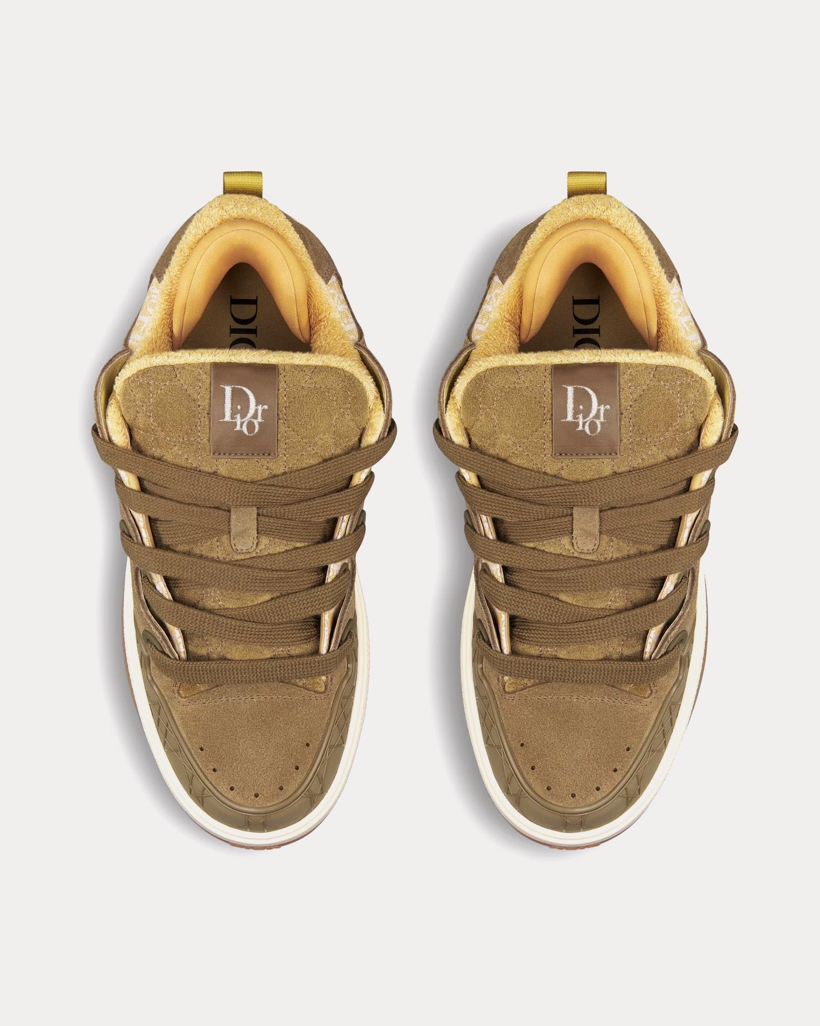 Les baskets basses pour homme DiorB9S Skater en suède kaki avec jacquard Dior Oblique vert et beige présentent des étiquettes en cuir avec la signature Dior brodée sur la languette, un empiècement signature Dior sur les côtés, une languette rembourrée Cannage, des fermetures à lacets avec œillets Dior, des bouts renforcés en caoutchouc Cannage, des semelles en caoutchouc bicolores avec motif Dior Oblique dégradé et signature Dior, des semelles extérieures en caoutchouc avec motif Cannage et signature Dior, une semelle intérieure de maintien en tissu technique et une doublure en polaire ton sur ton. Fabriquées en Italie.