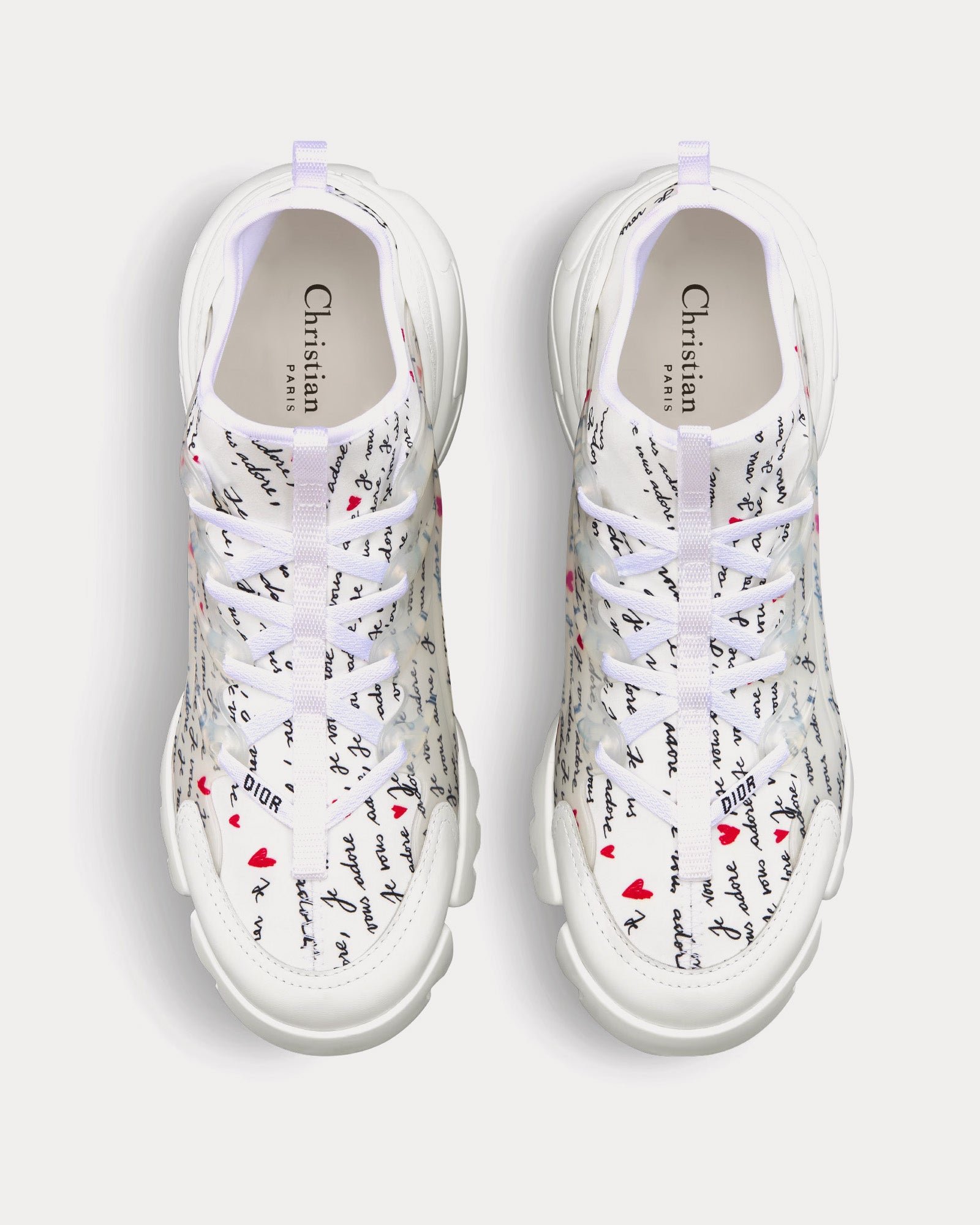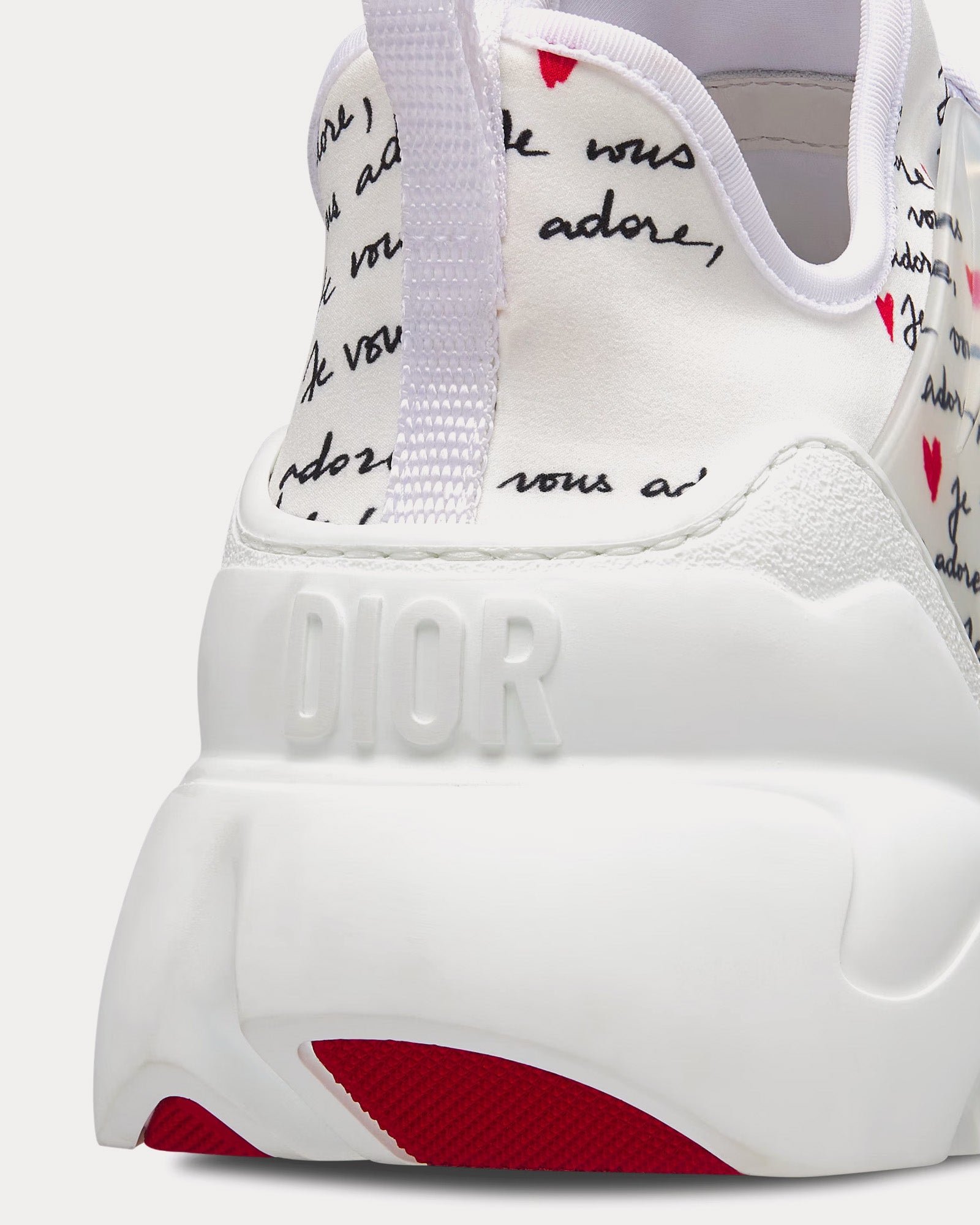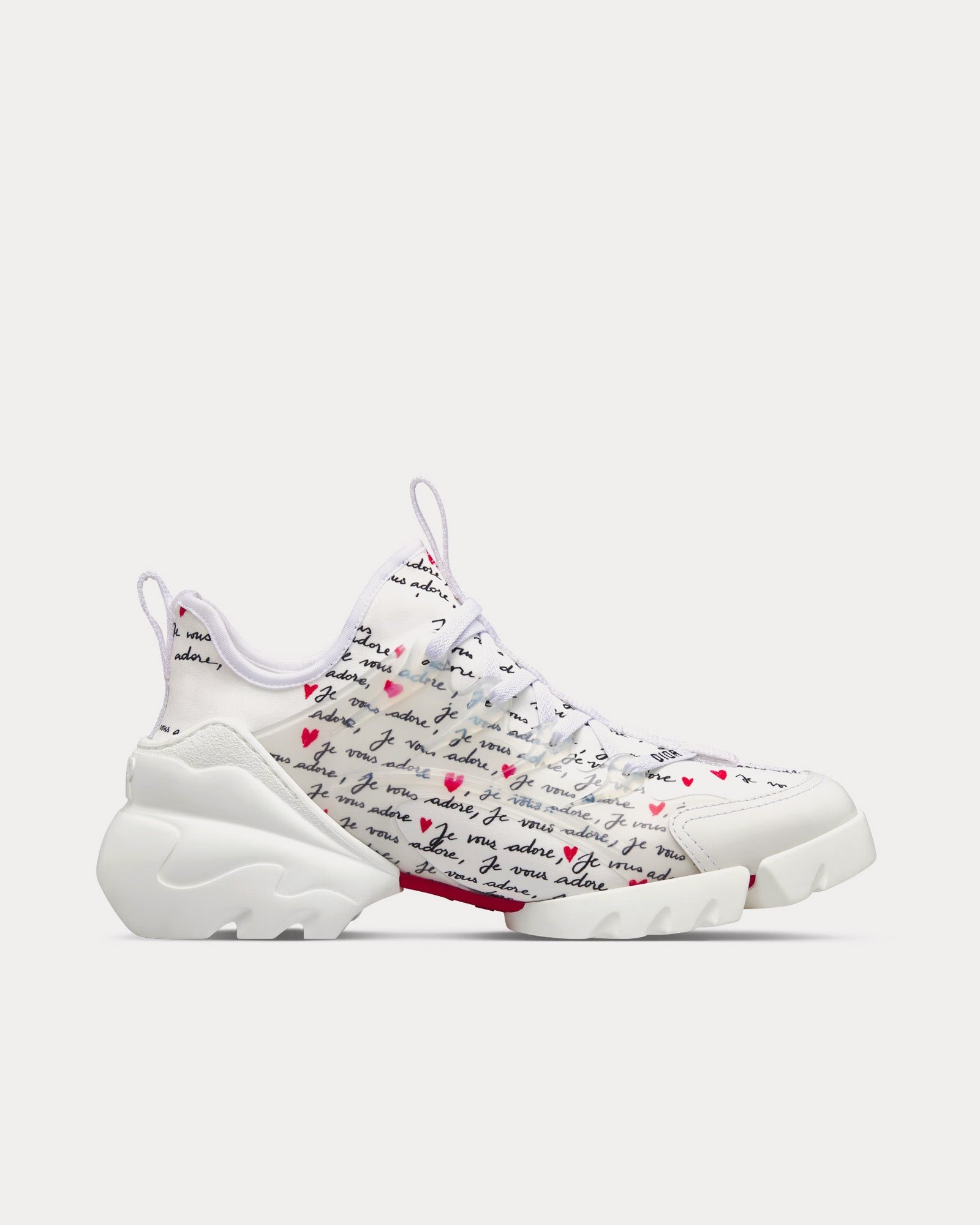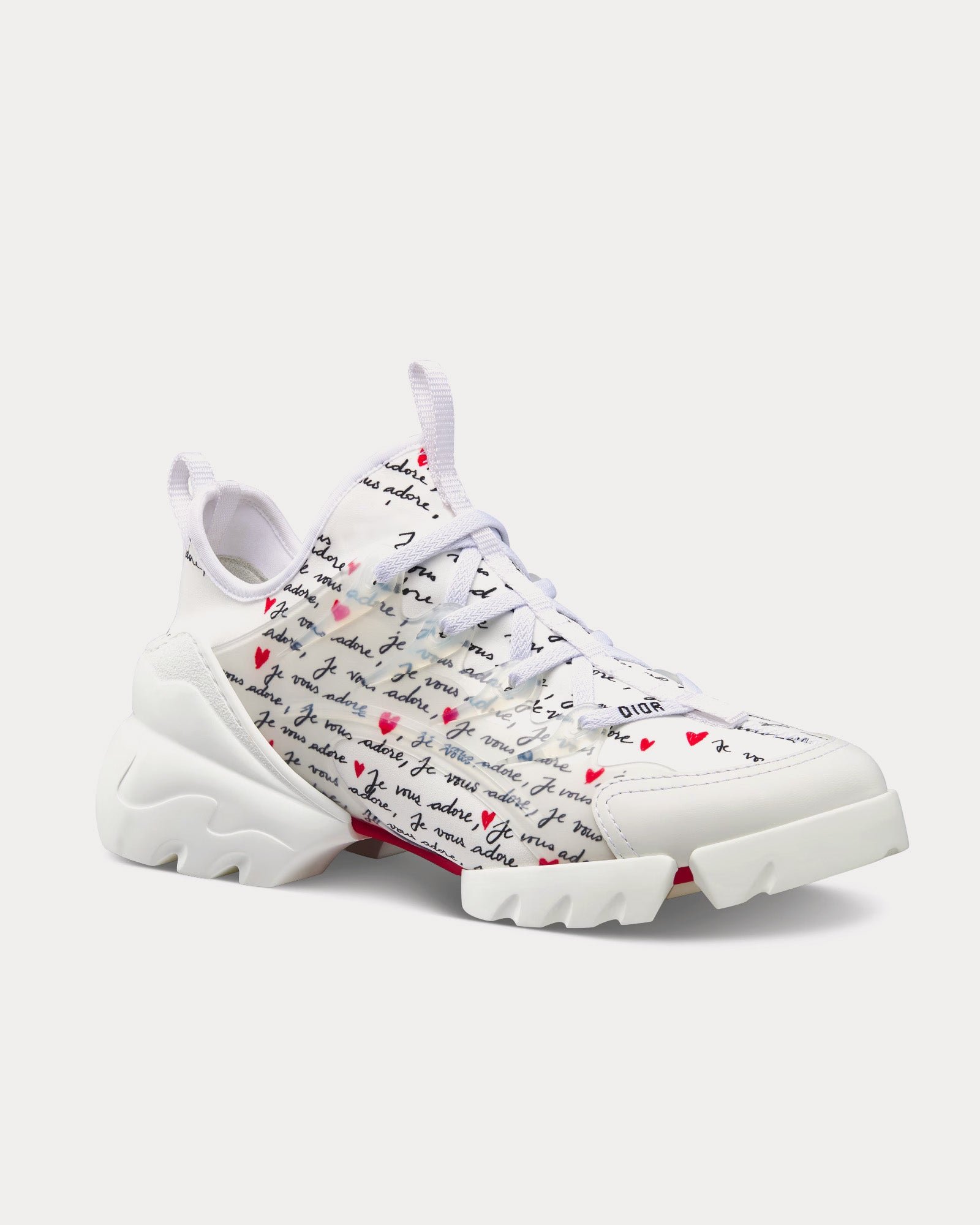 Les baskets basses pour femme DiorD-Connect Dioramour en tissu technique blanc imprimé du motif Je Vous Adore noir et rouge présentent un ruban gros-grain cousu sur la tige, des empiècements en caoutchouc transparent, des lacets Dior, des languettes avant et arrière et une semelle en caoutchouc Dior ornée d’une étoile, symbole porte-bonheur de Christian Dior. Fabriquées en Italie.