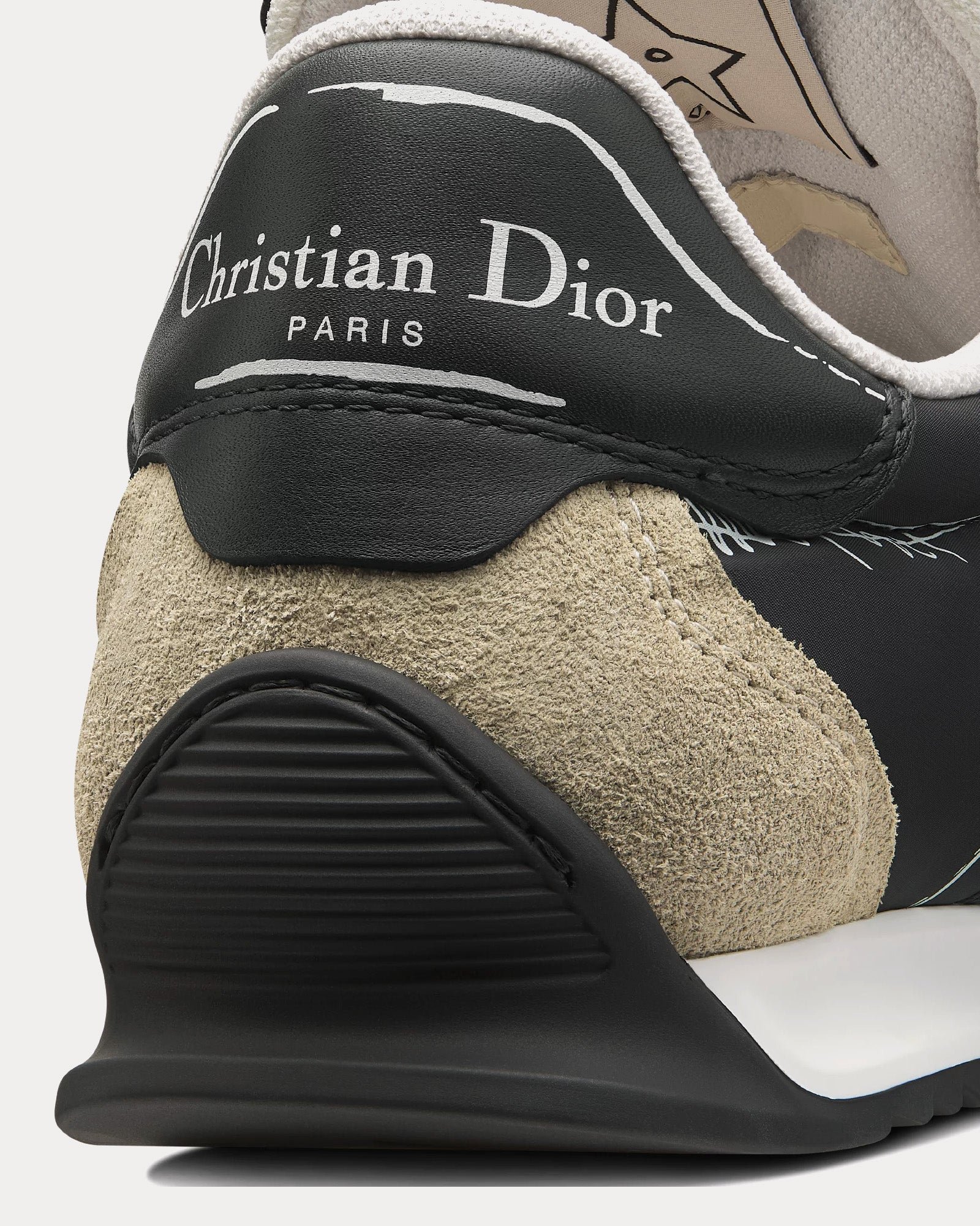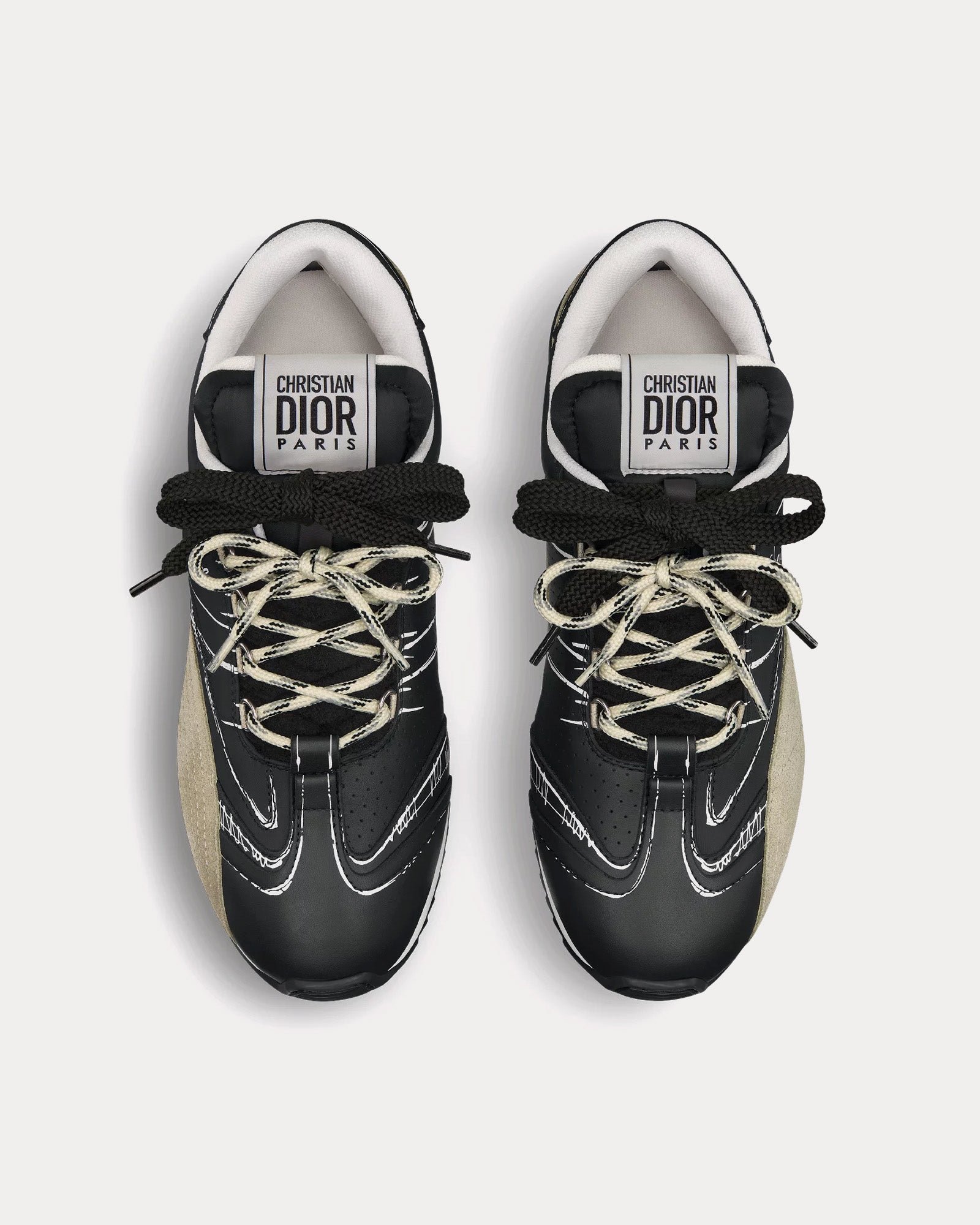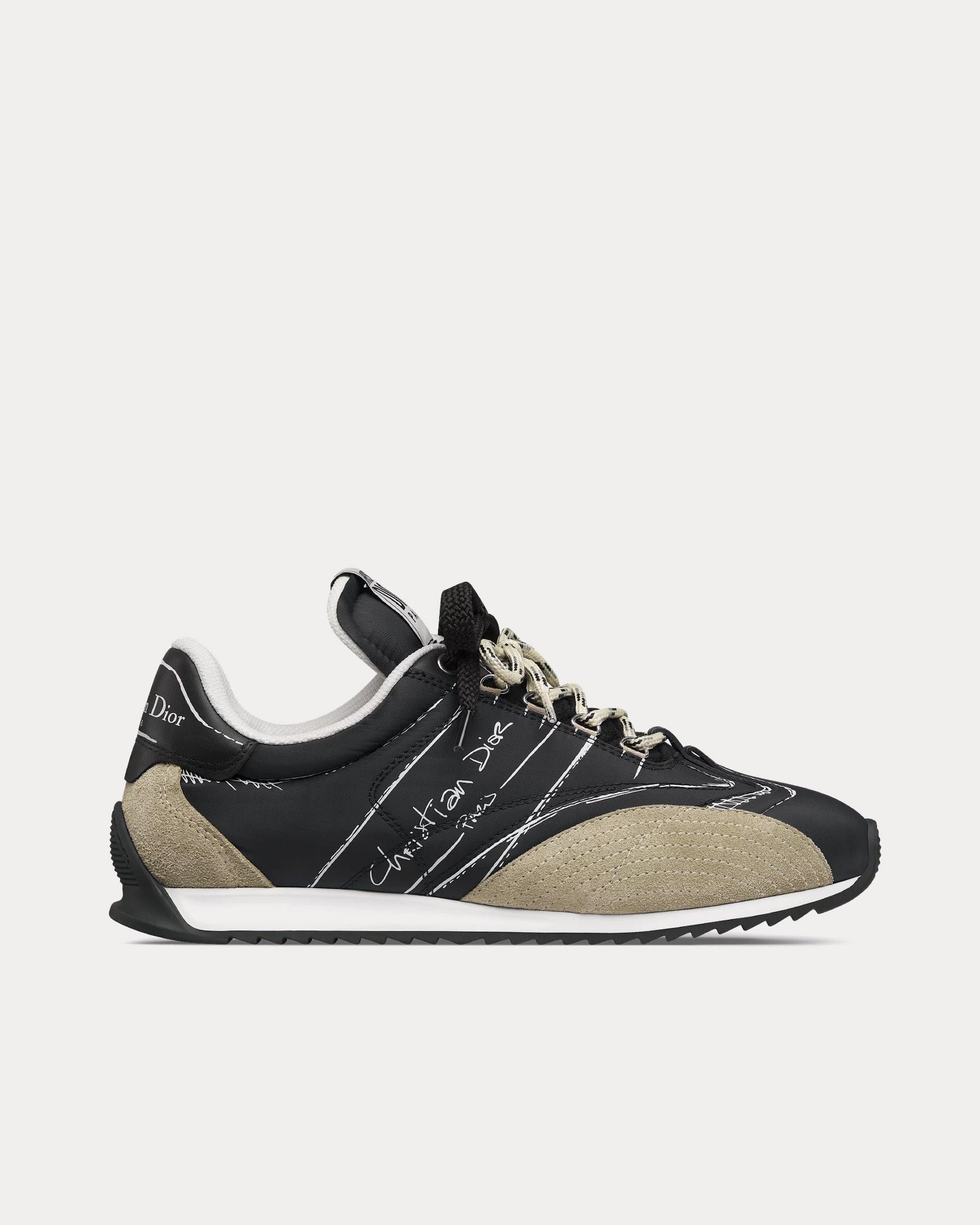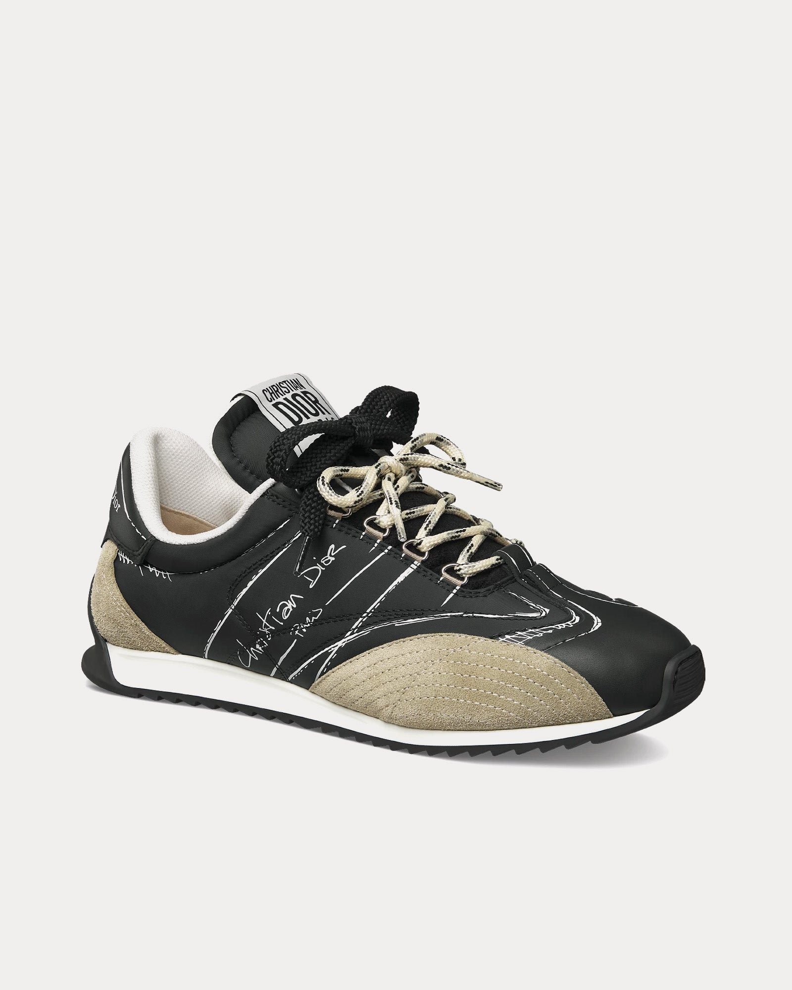 Confectionnées en nylon noir et cuir de veau premium, ces baskets présentent des empiècements en cuir de veau velours beige pour plus de texture et de profondeur. Le double laçage sublime leur silhouette unique, tandis que la signature manuscrite Christian Dior Paris apparaît élégamment sur les côtés. Parmi les autres éléments de la marque, on retrouve un empiècement et une étiquette Christian Dior Paris sur le contrefort et la languette.