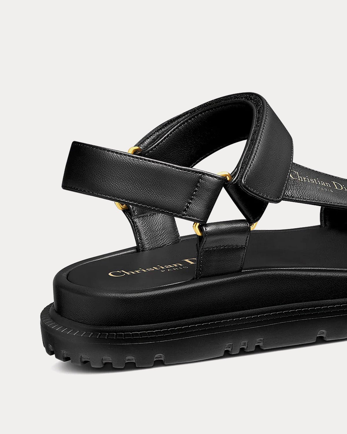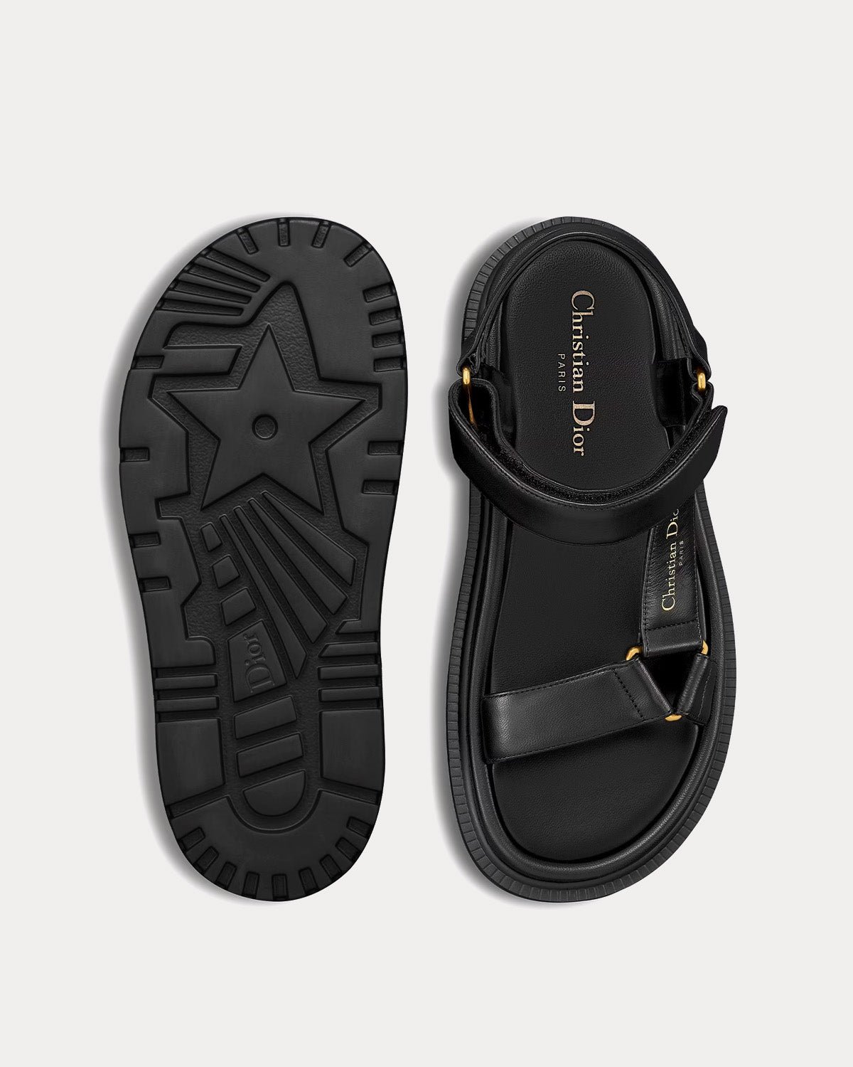 Les sandales DiorD-Wave pour femme en cuir d’agneau noir présentent la signature Christian Dior Paris dorée sur le côté, une bande scratch réglable et une semelle crantée en EVA avec étoile, le symbole porte-bonheur de Christian Dior. Fabriquées en Italie.