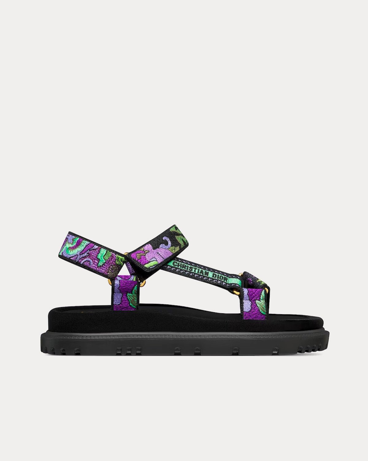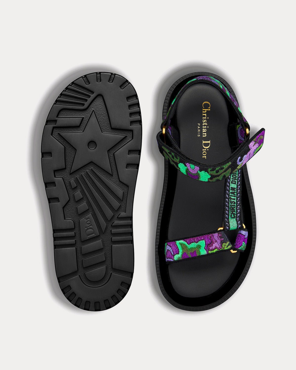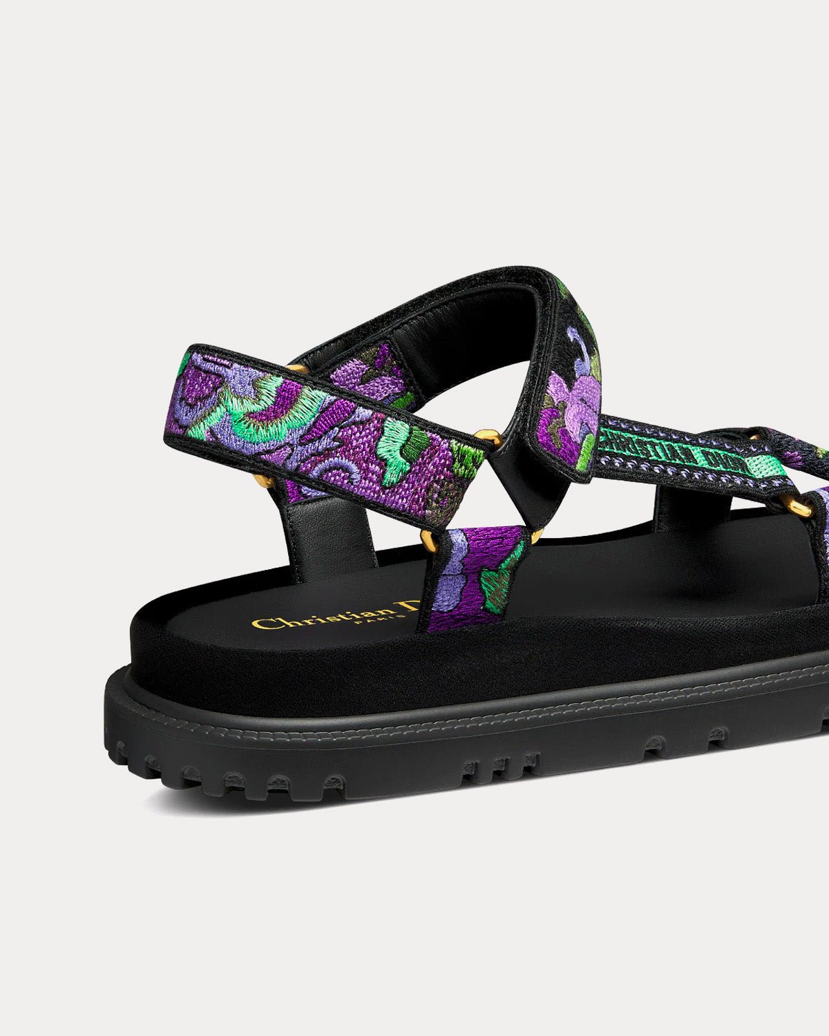 Les sandales DiorD-Wave pour femme en cuir d’agneau de coton brodé violet indien multicolore Dior présentent la signature Christian Dior Paris dorée sur le côté, une bande scratch réglable et une semelle crantée en EVA avec étoile, le symbole porte-bonheur de Christian Dior. Fabriquées en Italie.