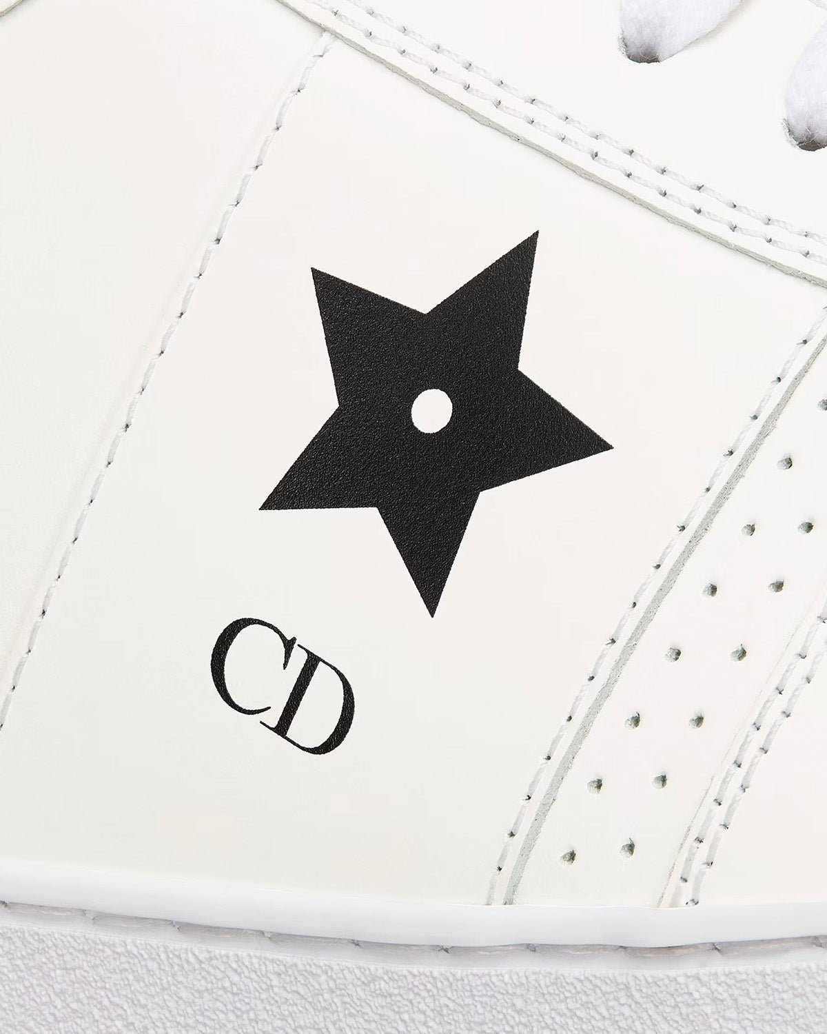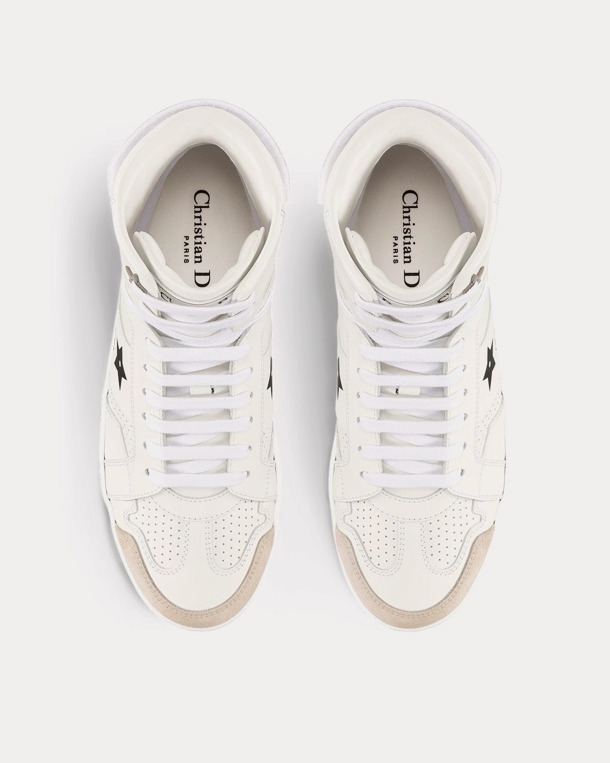 Baskets montantes Dior Star pour femme avec signature Christian Dior Paris sur la languette, signature CD avec étoile noire sur le côté, une étiquette amovible Dior Star et Property Of à l’arrière, une étoile en métal sur un œillet de laçage et une semelle en caoutchouc griffée avec étoile, le symbole porte-bonheur de Christian Dior. Fabriquées en Italie.