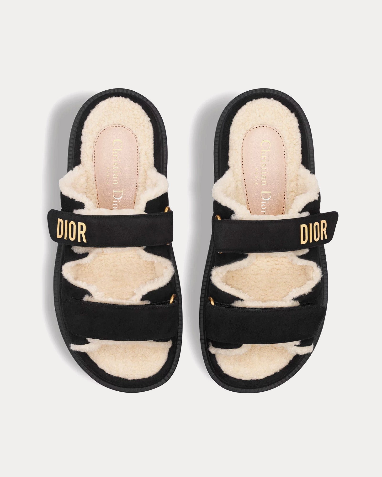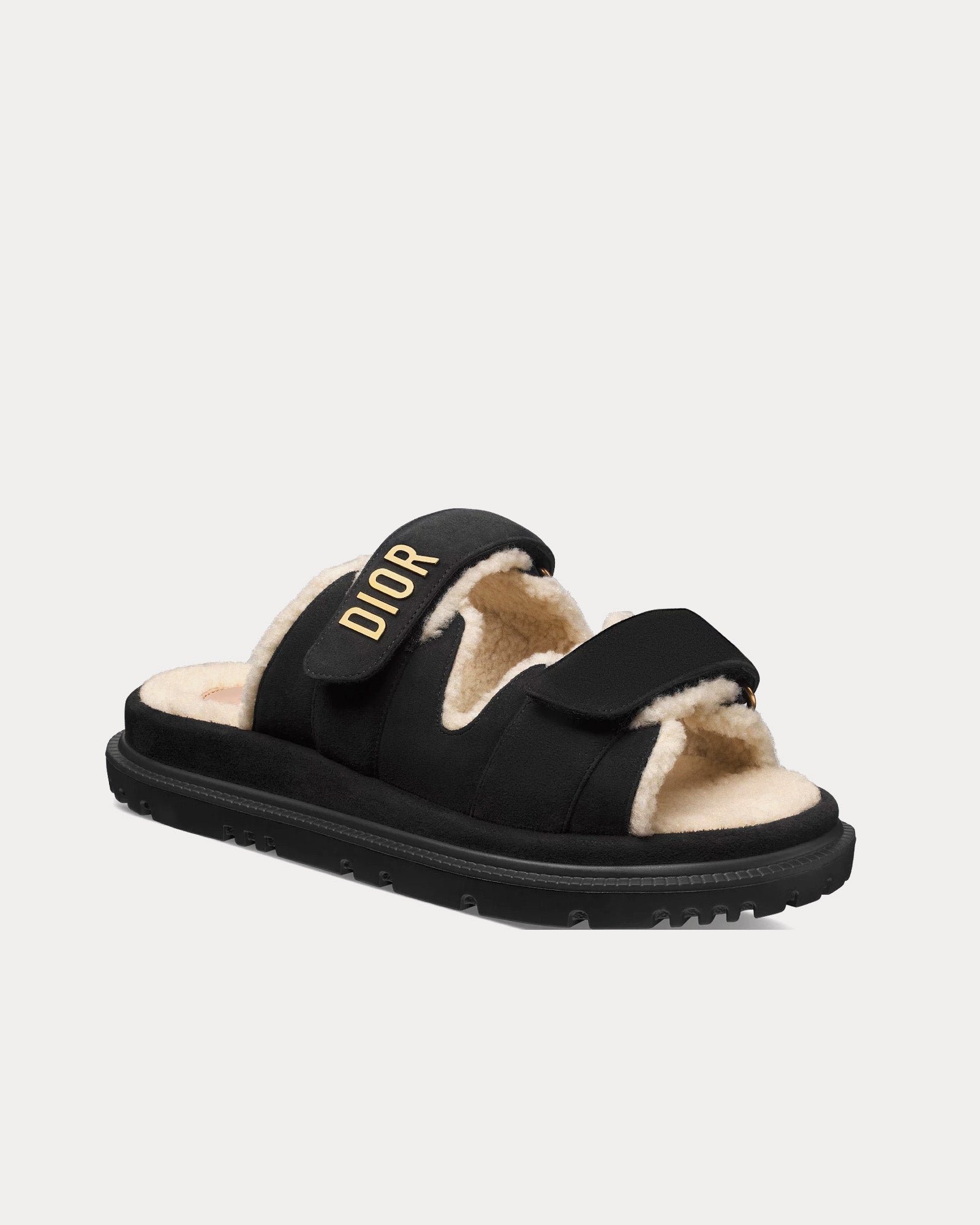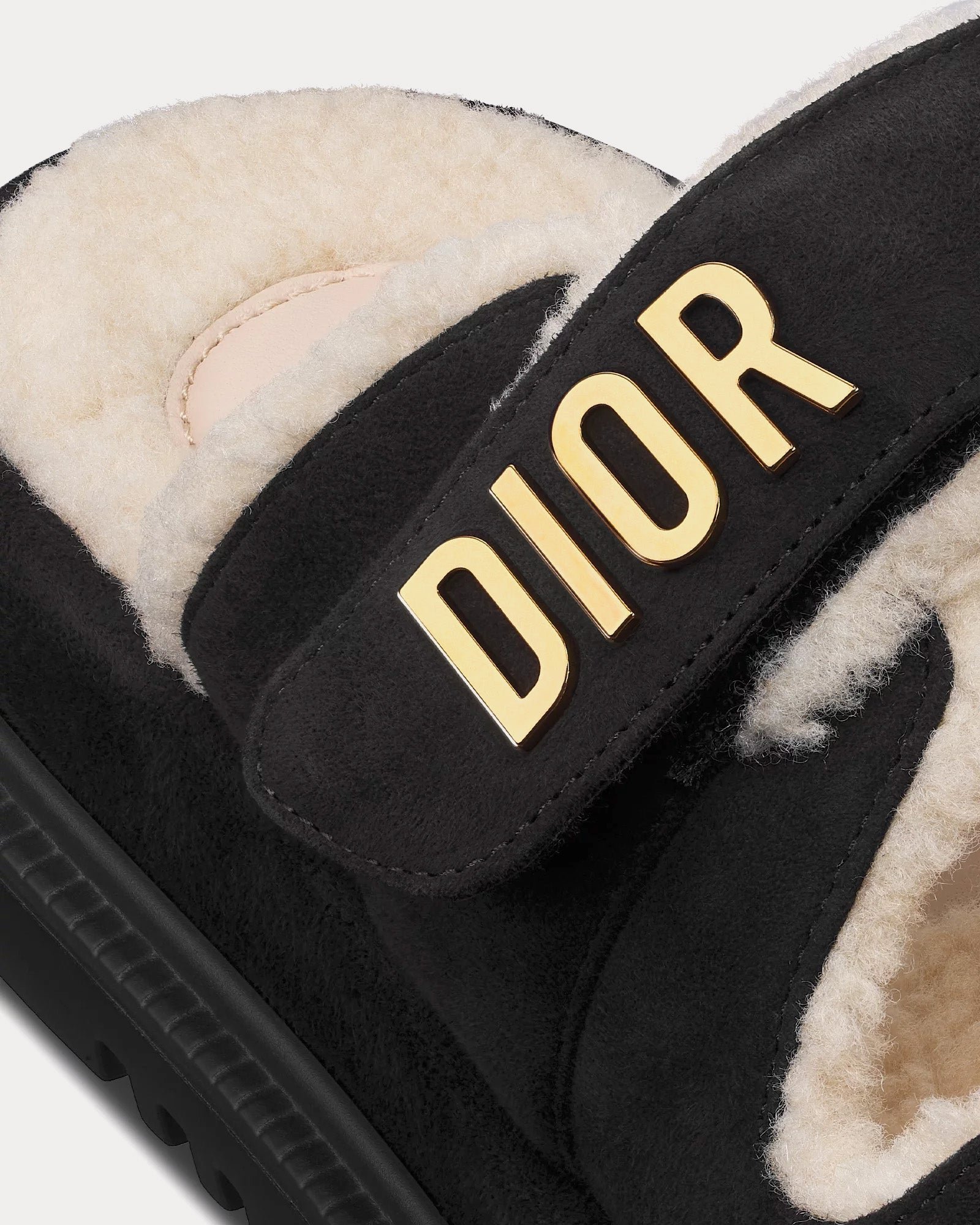 Les mules DiorDioract pour femme, de couleur noire, présentent une tige en cuir de chèvre velours, une doublure en tissu technique, des signatures Dior en métal finition dorée, deux brides réglables à fermeture automatique, des semelles intérieures anatomiques effet peau lainée et des semelles crantées en EVA ornées d’une étoile, symbole porte-bonheur de Christian Dior. Fabriquées en Italie.