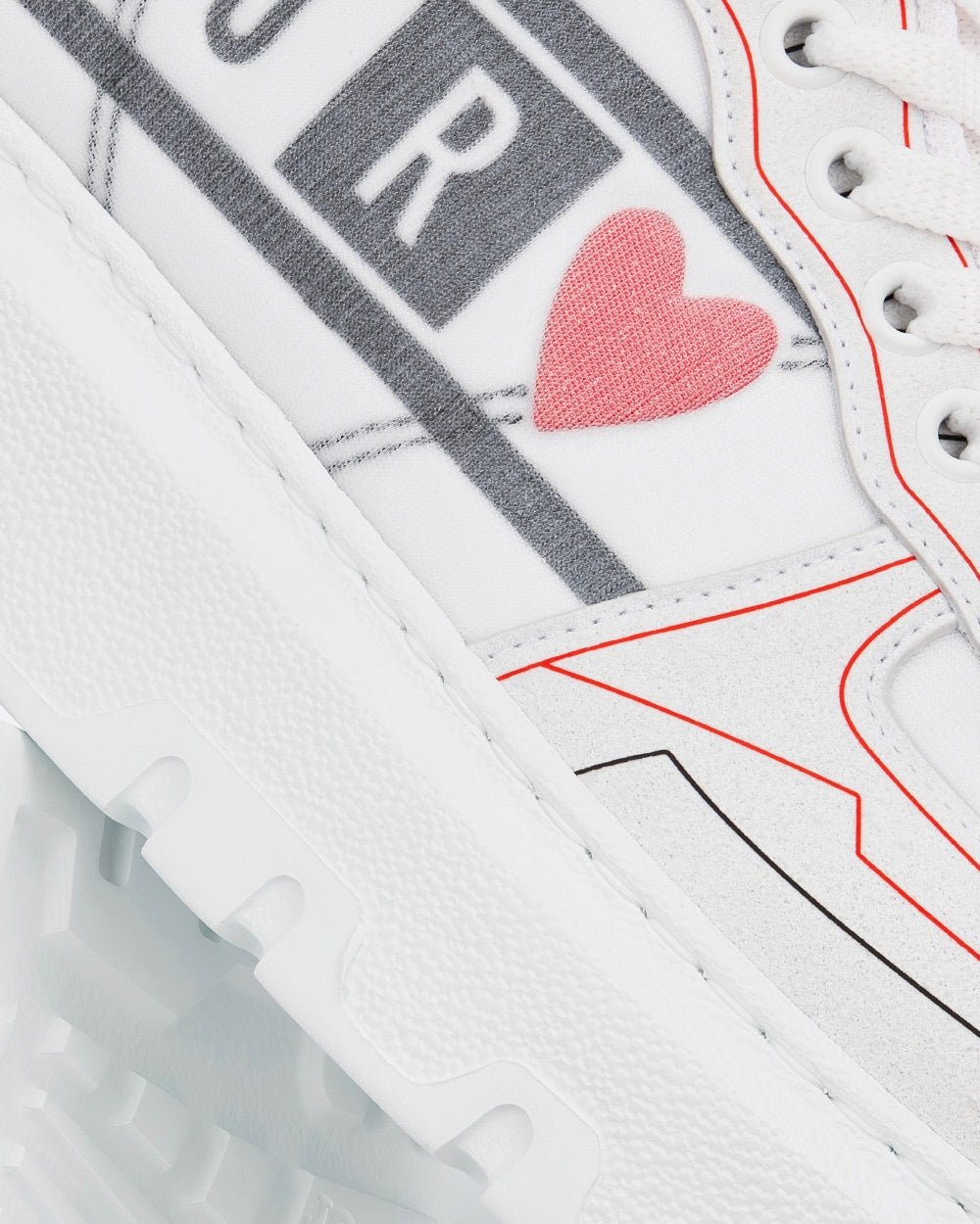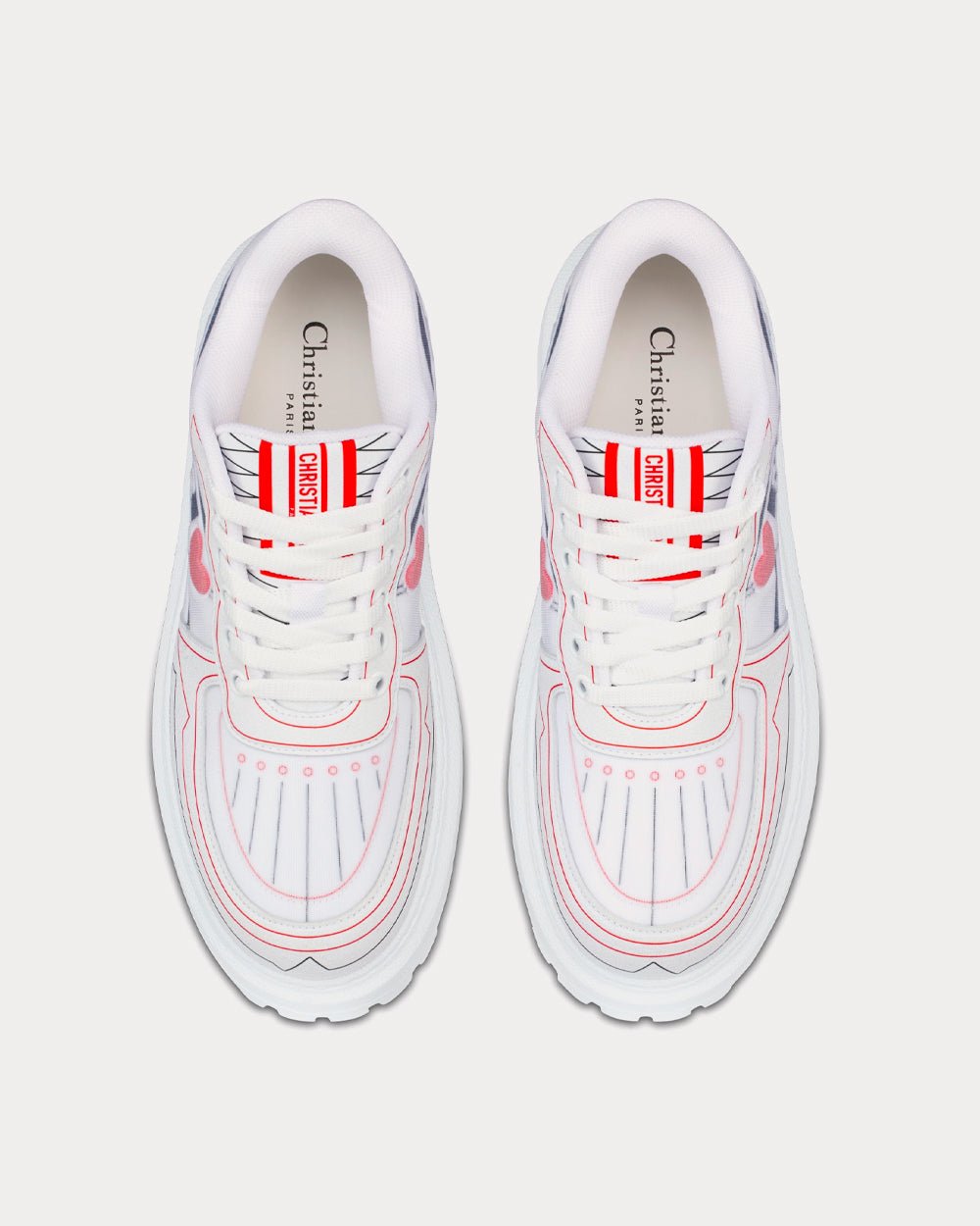 La sneaker Dior Addict, au look contemporain, est revisitée pour la capsule Dioramour, thème phare de la saison. Confectionnée en tissu technique blanc et recouverte de mesh, elle témoigne du savoir-faire de la Maison et offre un jeu de textures mettant en valeur le motif D-Chess Heart blanc, noir et rouge. Des empiècements en cuir de veau blanc, une semelle épaisse en EVA ultra-légère et confortable, ainsi qu’une signature « DIORAMOUR » à l’arrière complètent cette sneaker, qui peut être assortie aux autres créations Dioramour.