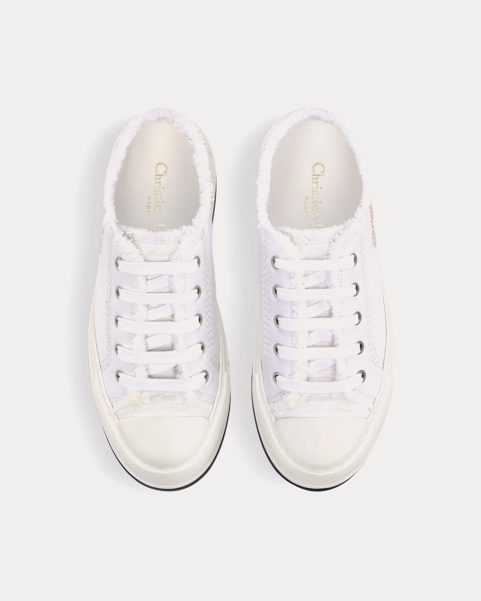 Les baskets basses à plateforme Dior Walk’n’Dior pour femme en toile de coton blanche à franges et broderies sont ornées de signatures sur la languette, la semelle et les lacets, ainsi que d’une plateforme en EVA ornée d’une étoile, symbole porte-bonheur de Christian Dior. Fabriquées en Italie.