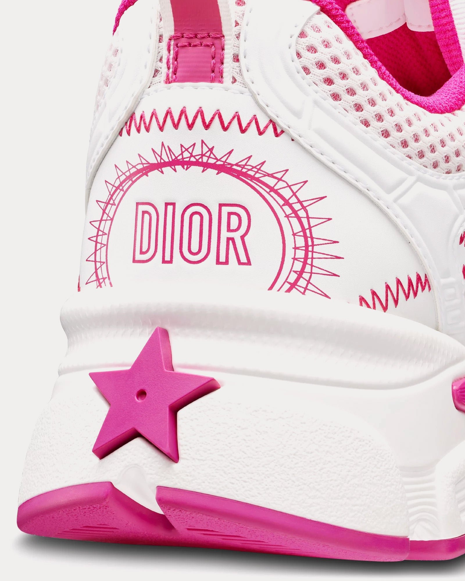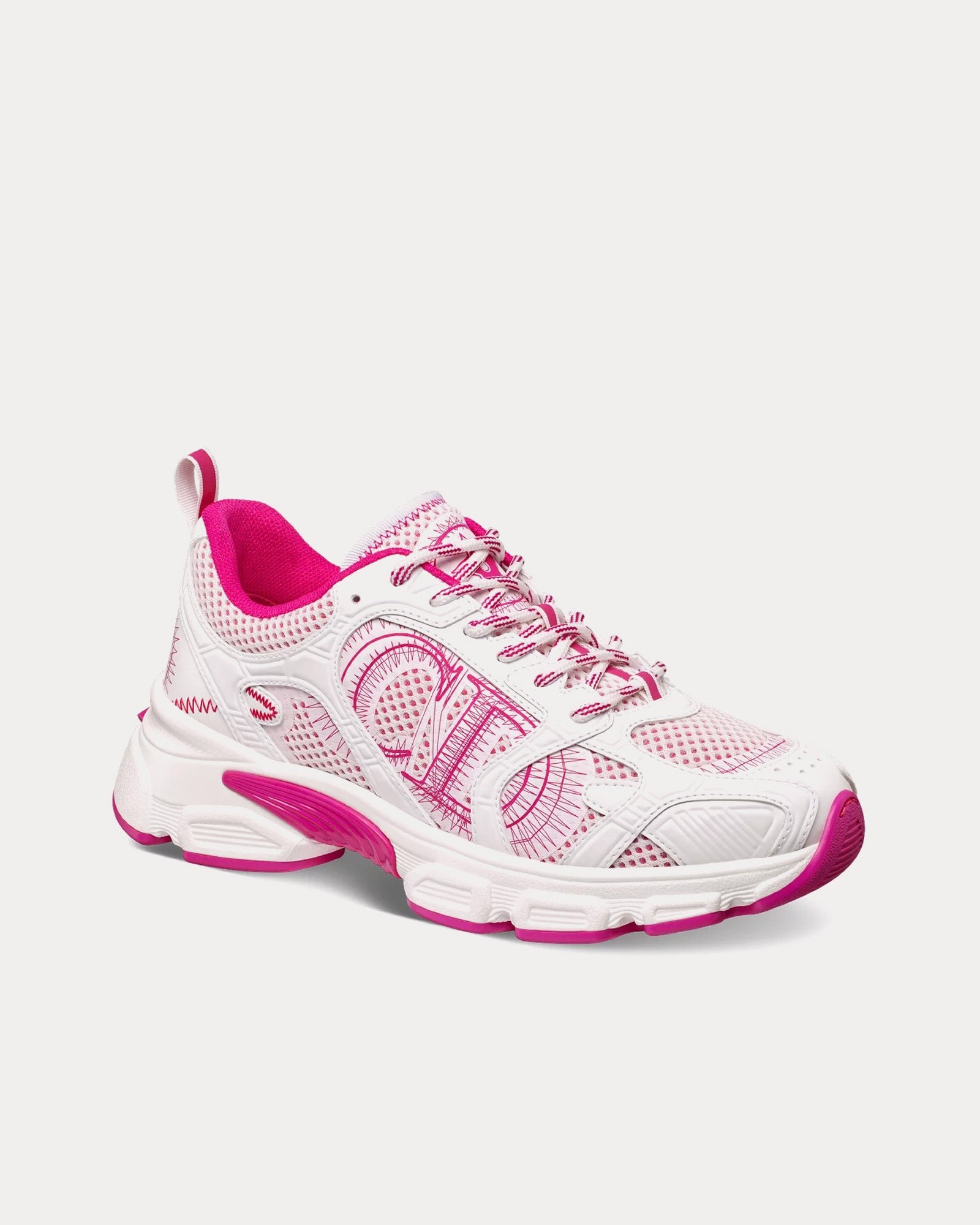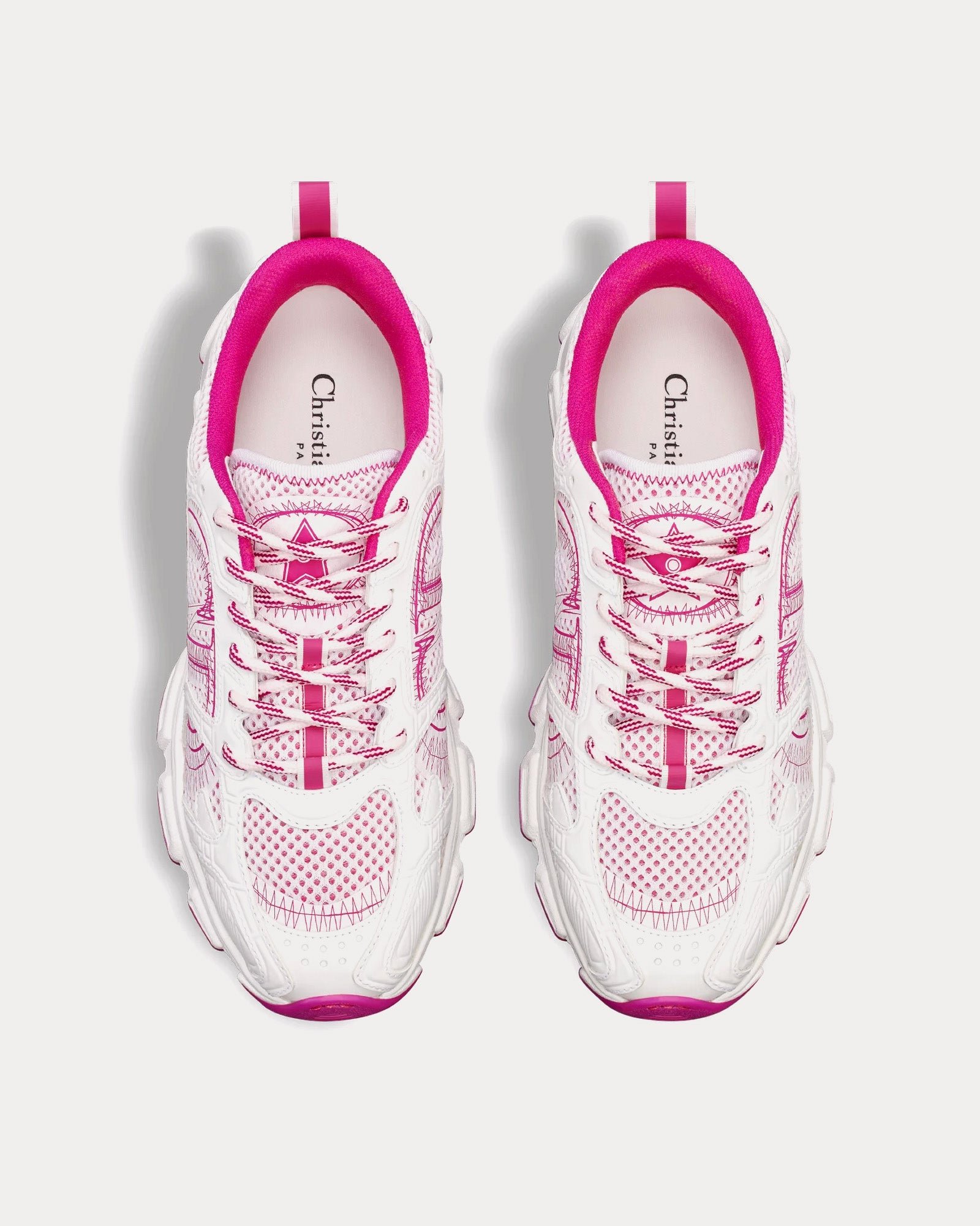 Les baskets basses Dior Miss Dior Chrono pour femme, en blanc et fuchsia avec empiècements effet cuir, arborent la signature CD sur les côtés, un patch étoile sur la languette, la signature Dior à l’arrière, des lacets bicolores et des semelles en EVA signature avec étoile, symbole porte-bonheur de Christian Dior. Fabriquées en Italie.