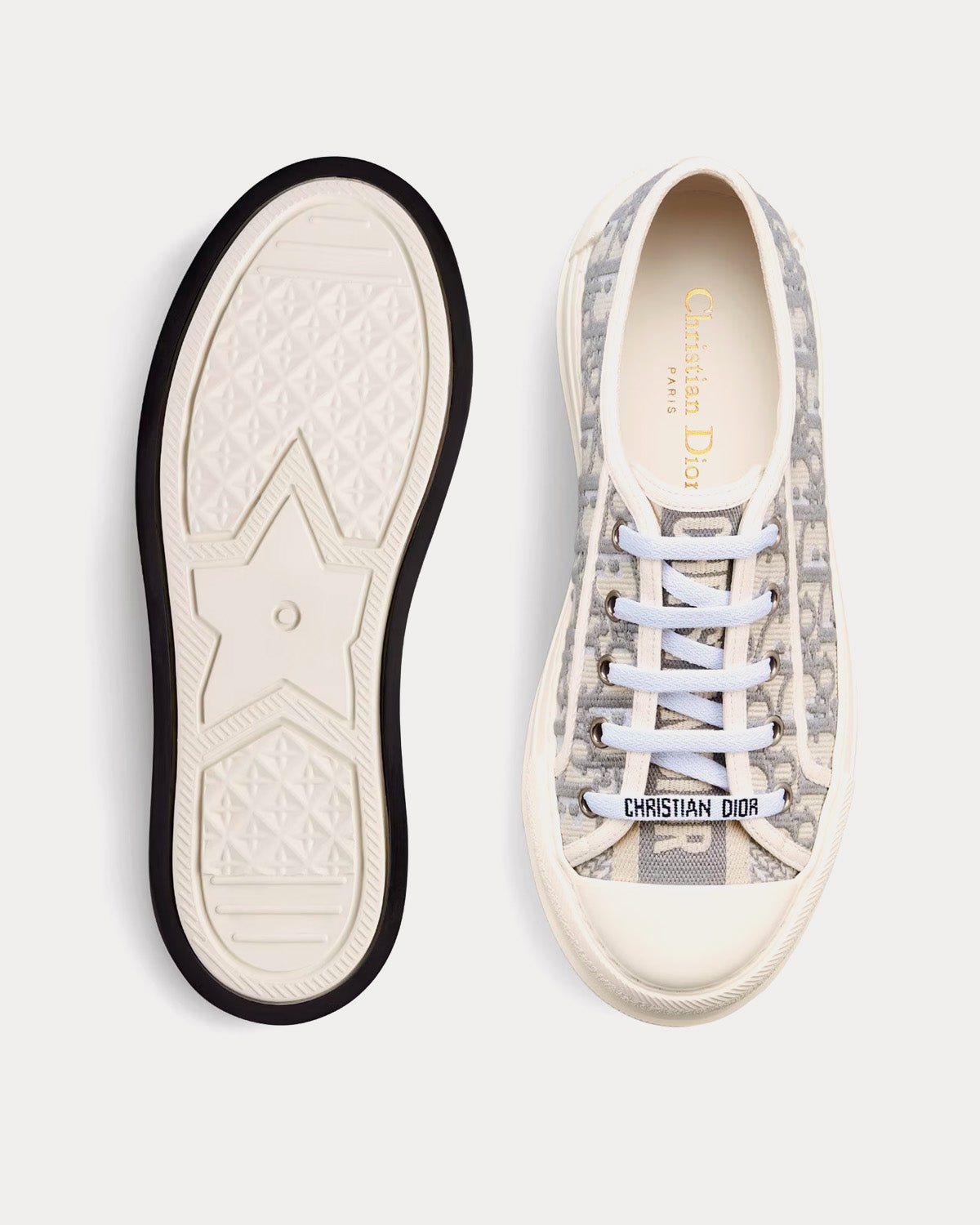 Les baskets basses à plateforme pour femme DiorWalk’n’Dior en coton brodé Dior Oblique gris pierre présentent des signatures sur la languette, la semelle et les lacets, ainsi qu’une plateforme en EVA avec une étoile, le symbole porte-bonheur de Christian Dior. Fabriquées en Italie.