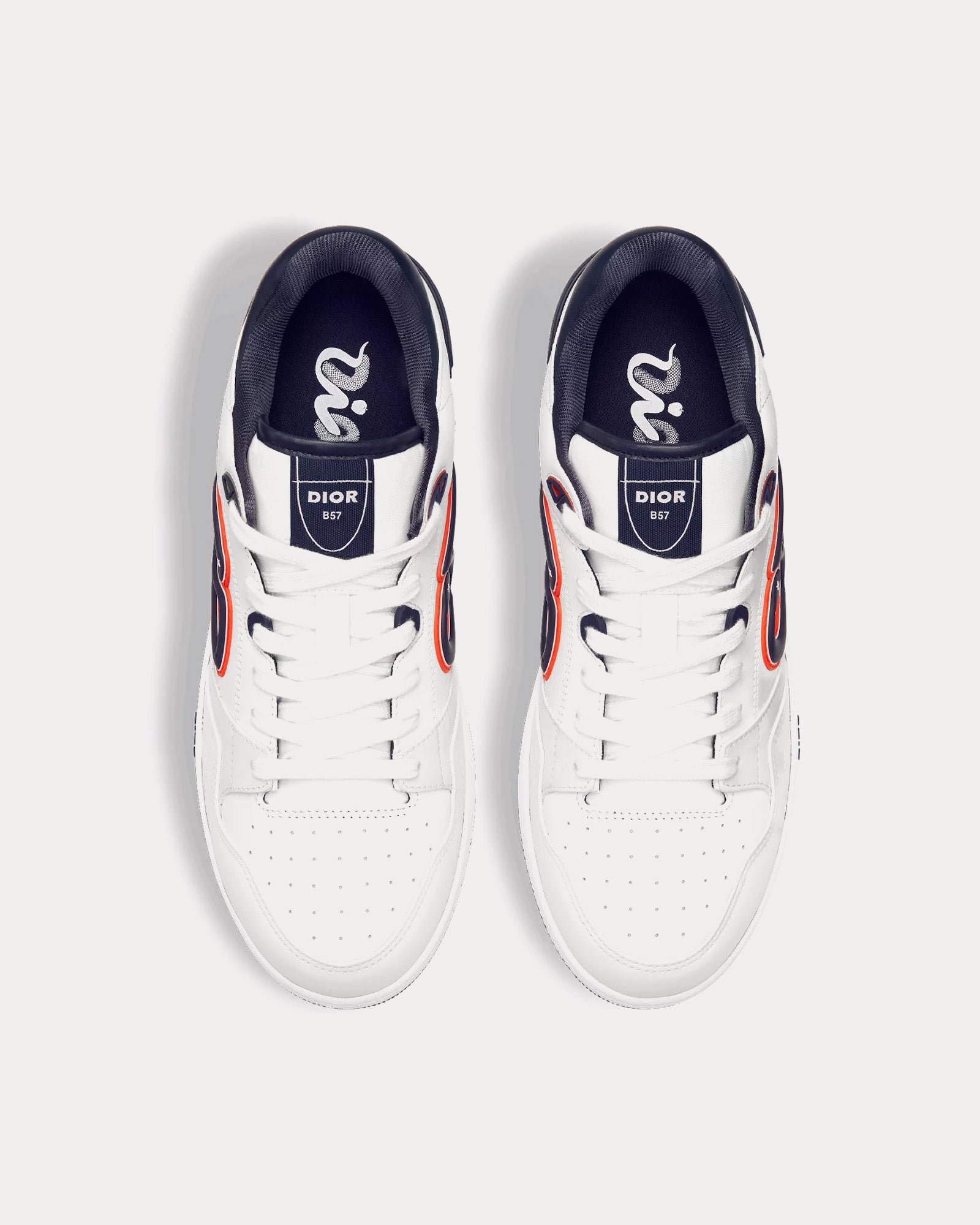 Les baskets basses pour hommes Dior x Kaws B57 en cuir de veau lisse blanc et bleu marine avec daim blanc présentent une tige en cuir de veau, une doublure en mesh technique, une signature en caoutchouc tricolore DIOR AND KAWS sur les côtés, une languette avec signature Dior B57, une signature CD sur le talon, une cheville rembourrée, une fermeture à lacets avec œillets bicolores avec signature CD, des détails perforés sur la pointe, une signature DIOR AND KAWS sur la semelle intérieure, une semelle extérieure en caoutchouc bicolore avec signature Dior et une construction soudée et cousue sur les côtés. Fabriqué en Italie.