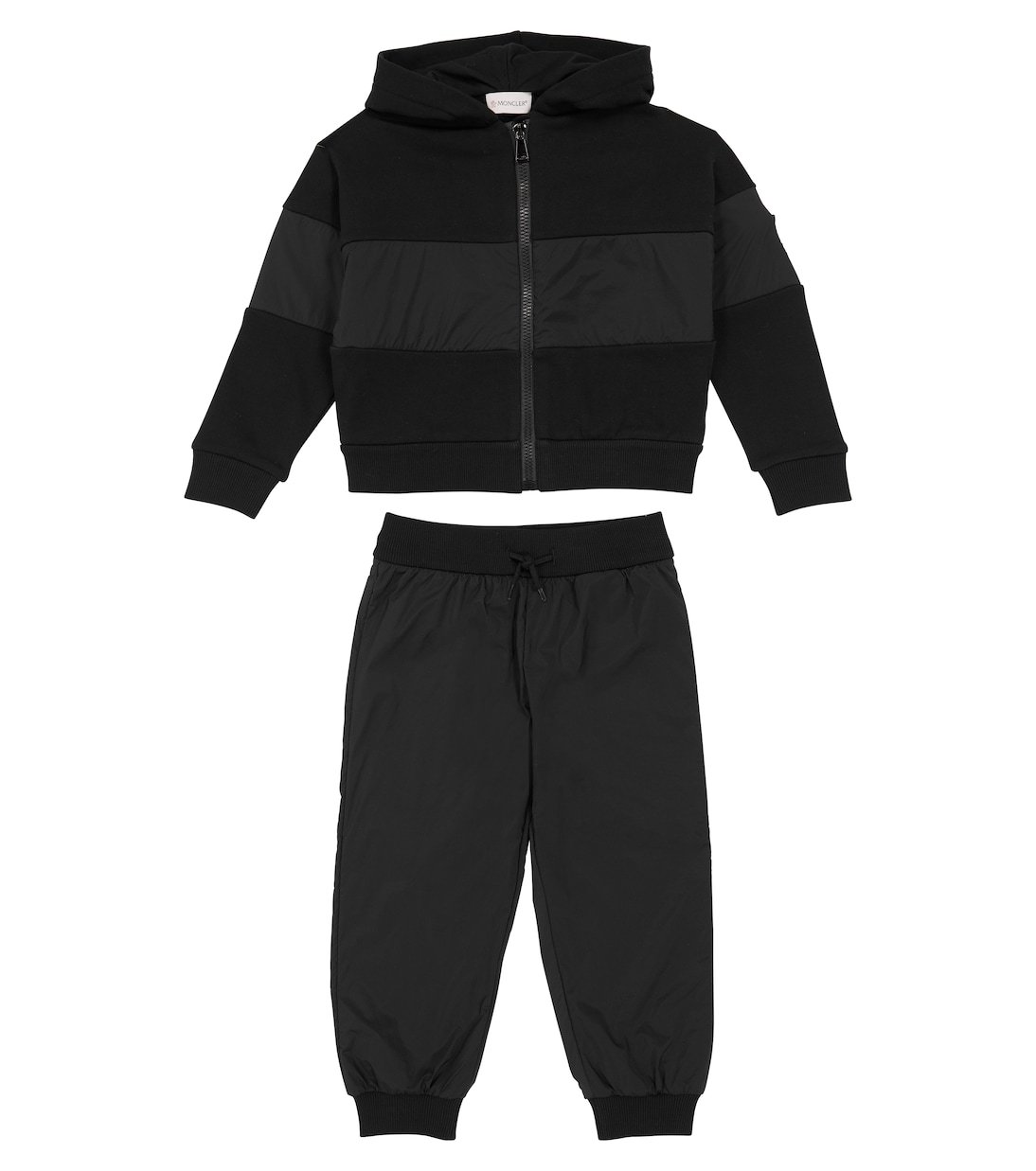 Moncler Enfant signe cet ensemble noir pratique et polyvalent. Confectionné à partir d’empiècements en jersey de coton et de nylon technique, il se compose d’un sweat-shirt à capuche zippé orné du logo dans le dos, ainsi que d’un pantalon de survêtement muni d’un cordon de serrage à la taille.