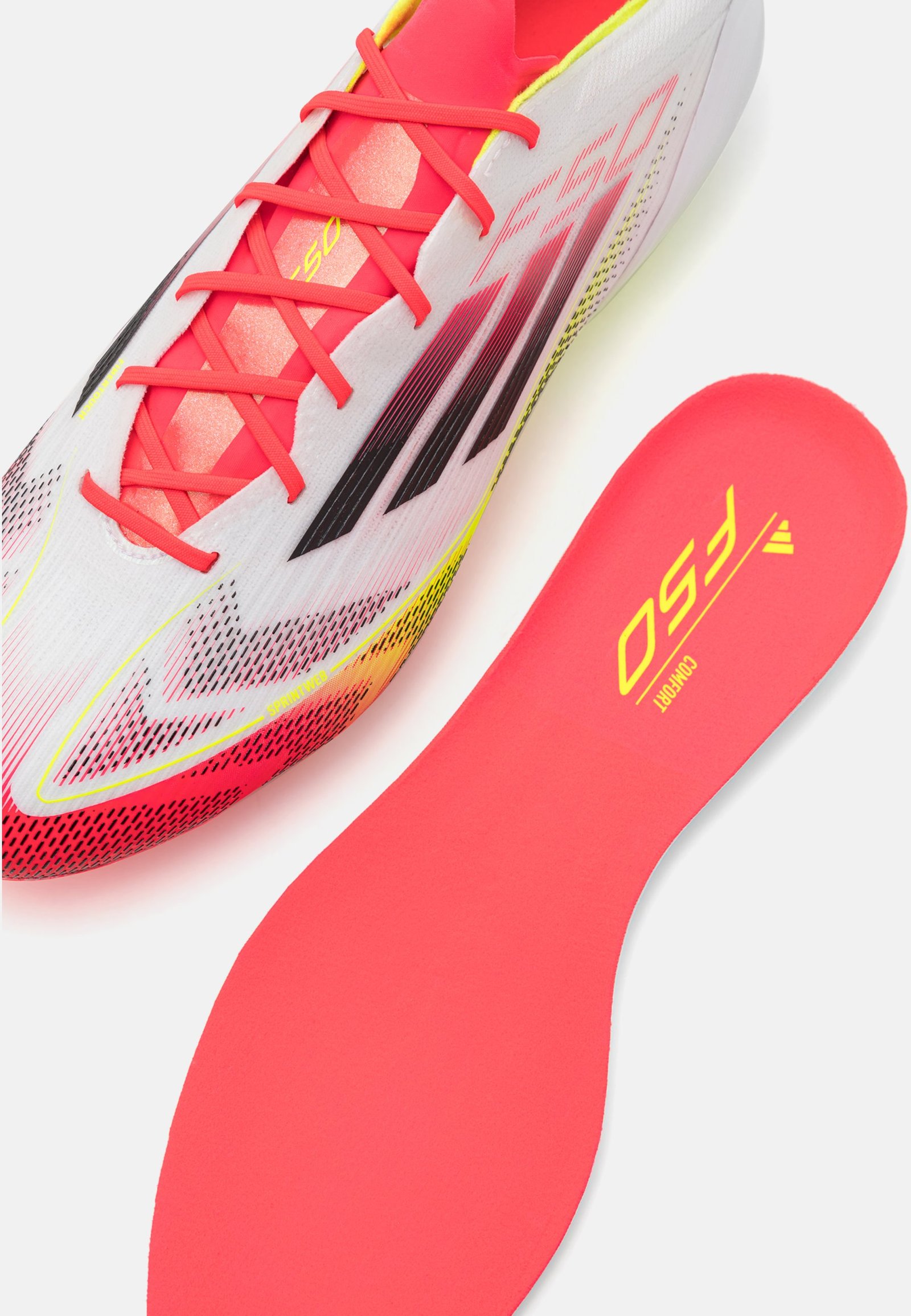 Matière et entretien Dessus / Tige : Tissu / matière synthétique Doublure : Textile Semelle de propreté : Textile Semelle d’usure : Matière synthétique Épaisseur de la doublure : Doublure protégeant du froid Détails du produit Poussez votre rythme à la limite avec les chaussures légères adidas F50 conçues pour la vitesse. Ces crampons Elite sont dotés d’une fine tige Fibertouch avec une languette Compression Fit Tunnel pour un maintien optimal et une texture 3D Sprintweb qui aide à garder le ballon proche même à pleine vitesse. Conçue pour les terrains en gazon ferme, la semelle extérieure dynamique Sprintframe 360 offre une accélération impressionnante. Sport : Football Bout de la chaussure : Rond Forme du talon : Plat Fermeture : Laçage Motif / Couleur : Imprimé Propriétés : Léger Extras : Bout renforcé, talon renforcé Semelle d’usure : Souple, crampons (terrain souple à dur) Semelle intérieure : Rembourrée, amovible, préformée, perforée Référence : AD542A5EH-A12 Voir les informations sur la fabrication Taille & coupe adidas Performance Suivre