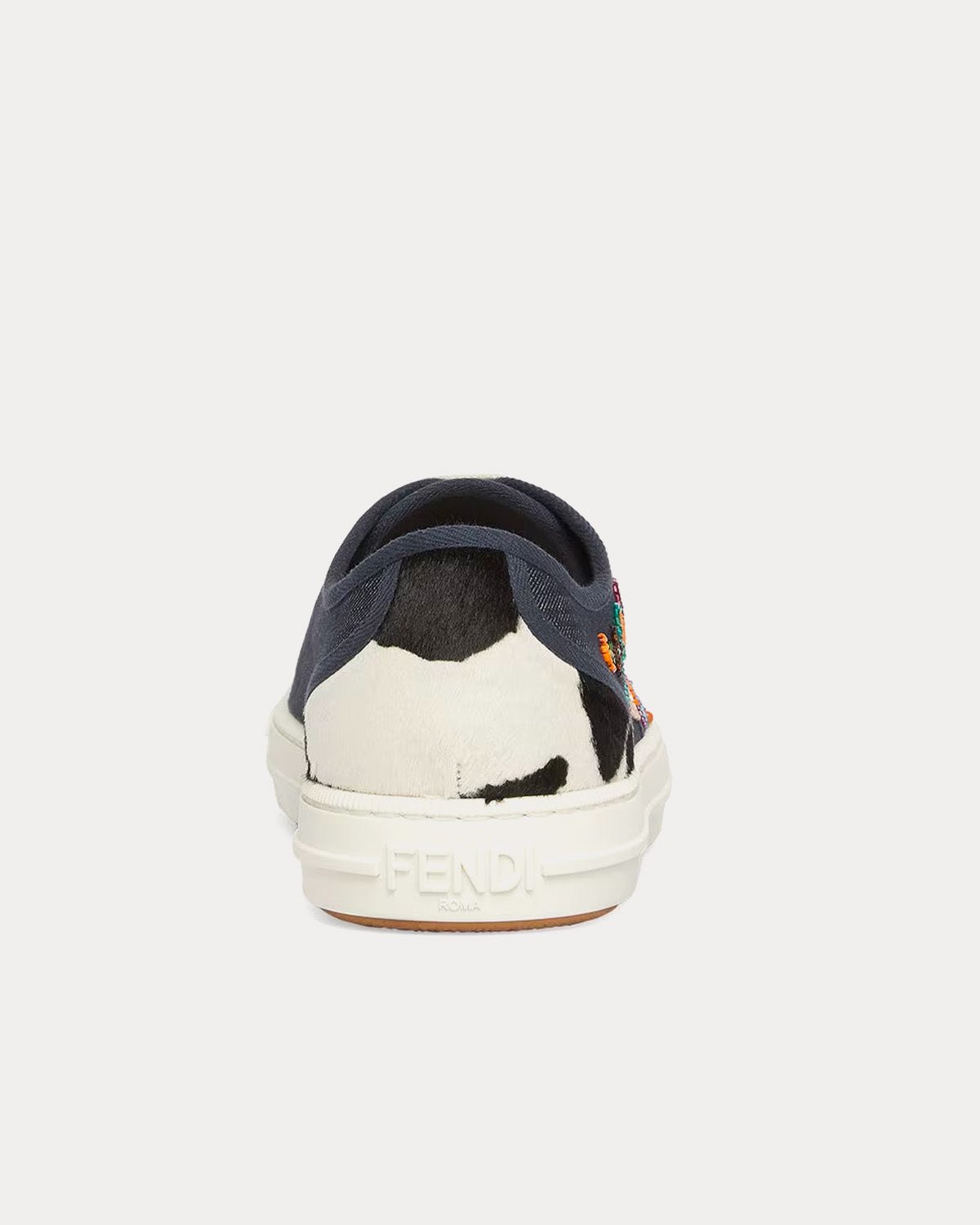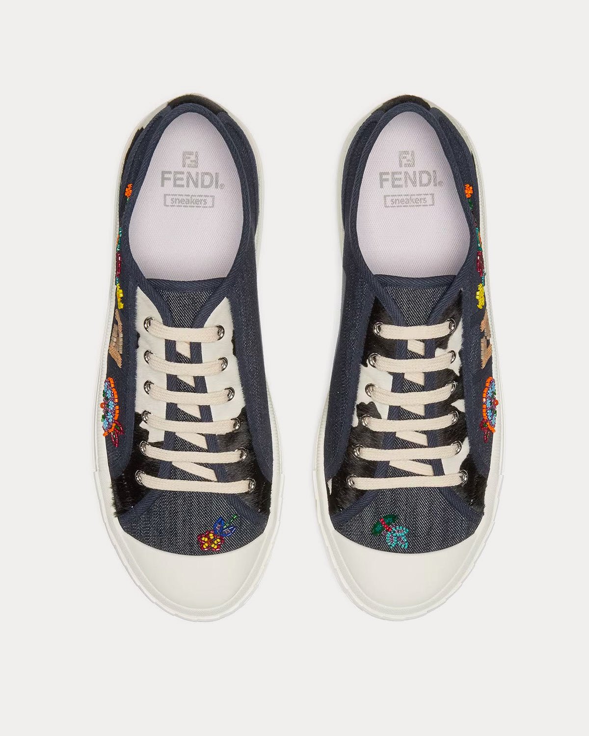 Baskets basses Fendi Domino pour homme en denim bleu avec broderies intégrales de perles multicolores. Elles sont ornées de poils de poney et d’un imprimé animalier noir et blanc. Fabriquées en Italie.