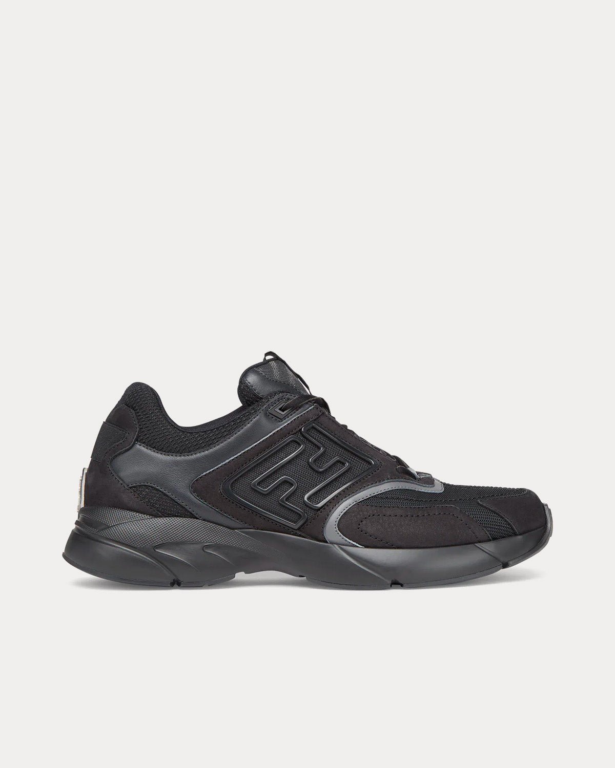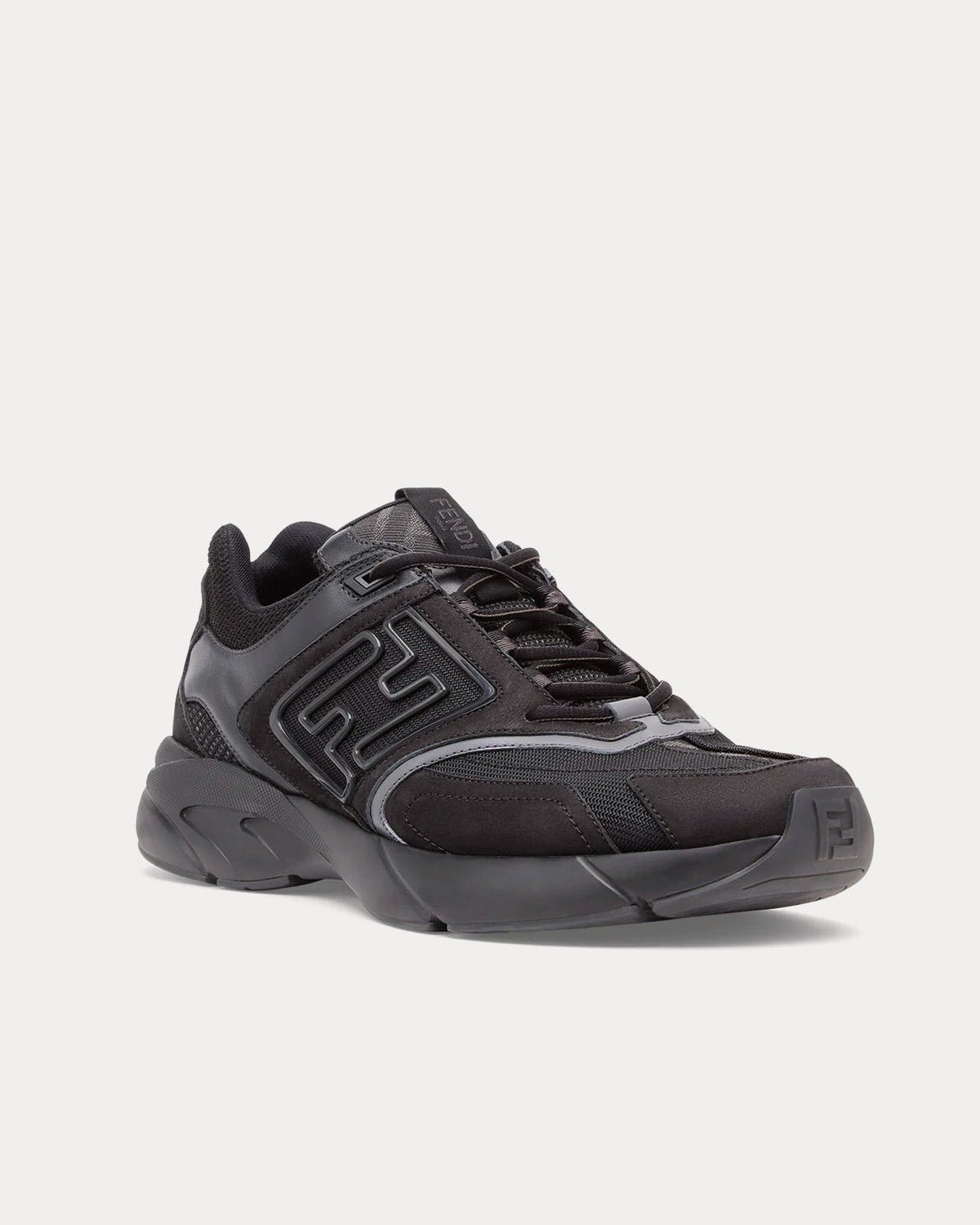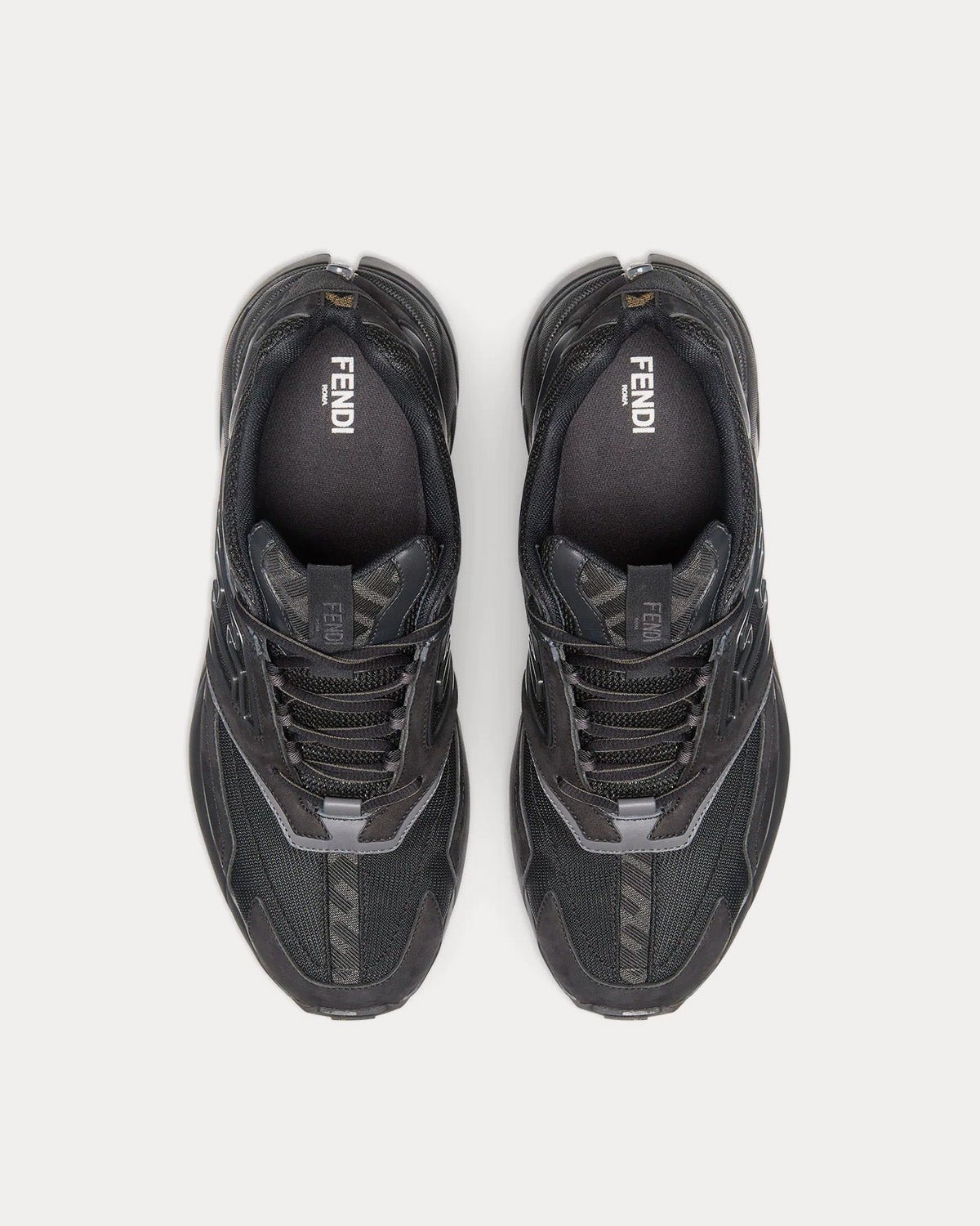 Baskets de course avec motif FF en relief sur les côtés. Semelles ondulées avec FF sur le bout. En nubuck noir avec détails en cuir ton sur ton. Empiècements en tissu FF gris et noir. Fabriquées en Italie.